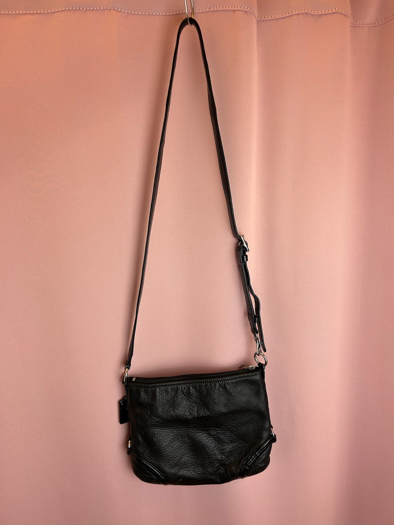 Coach crossbody bag in in black leather. The strap is adjustable like a belt.