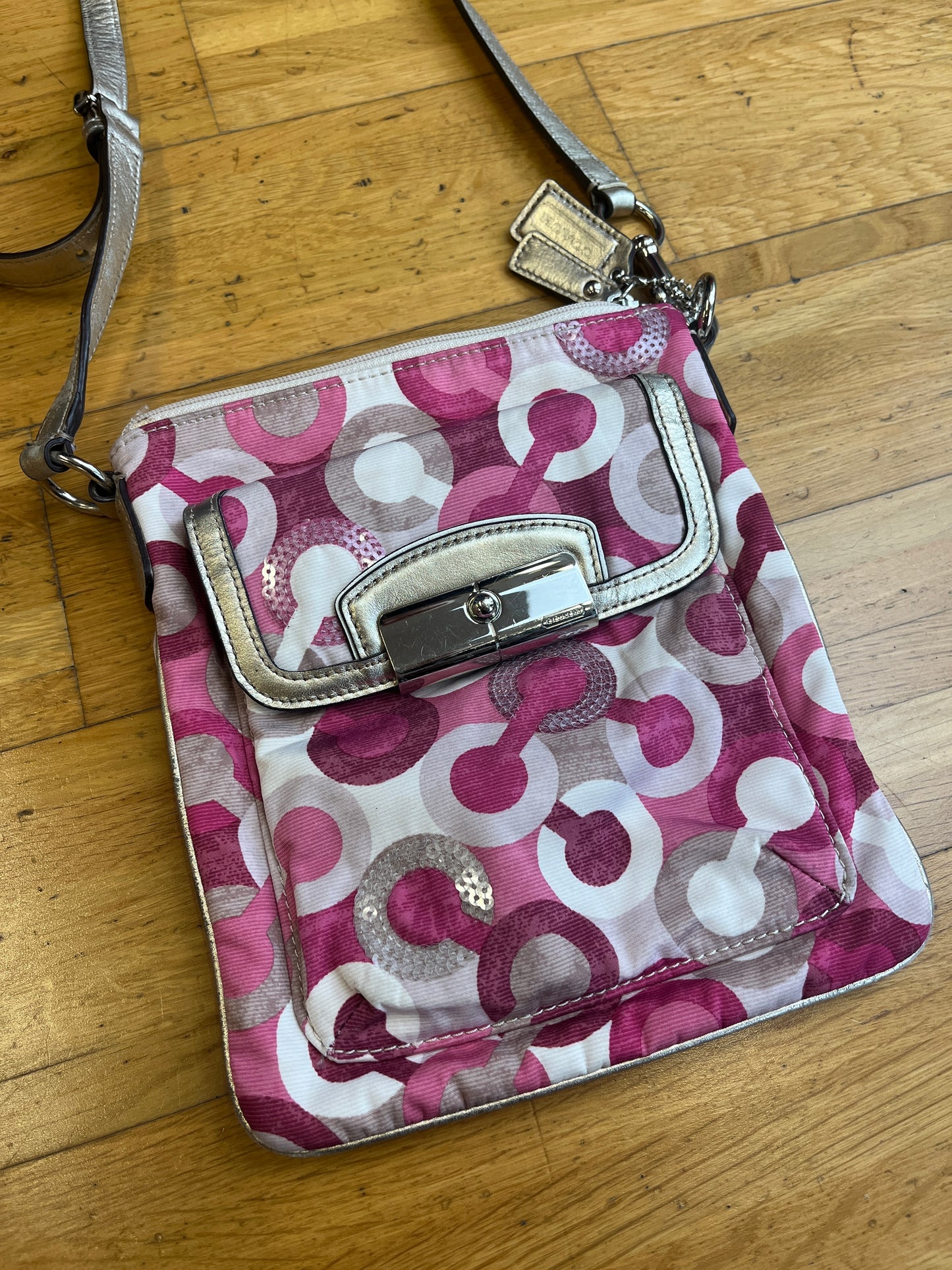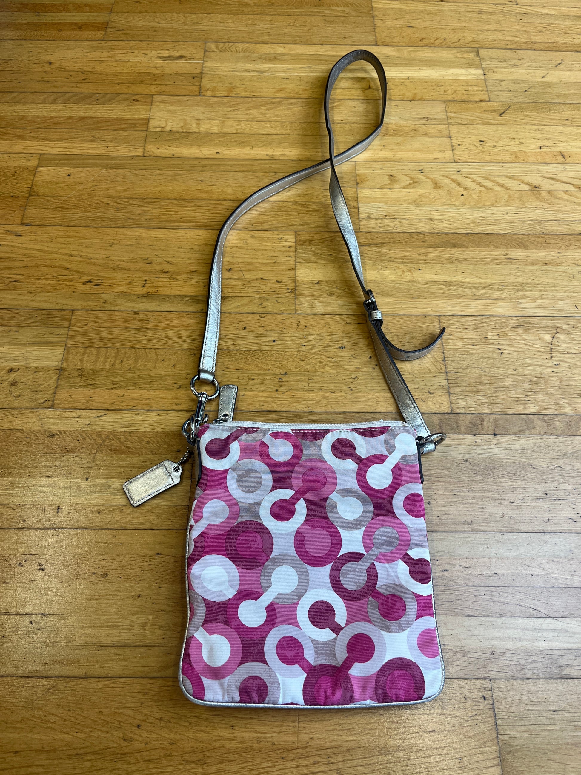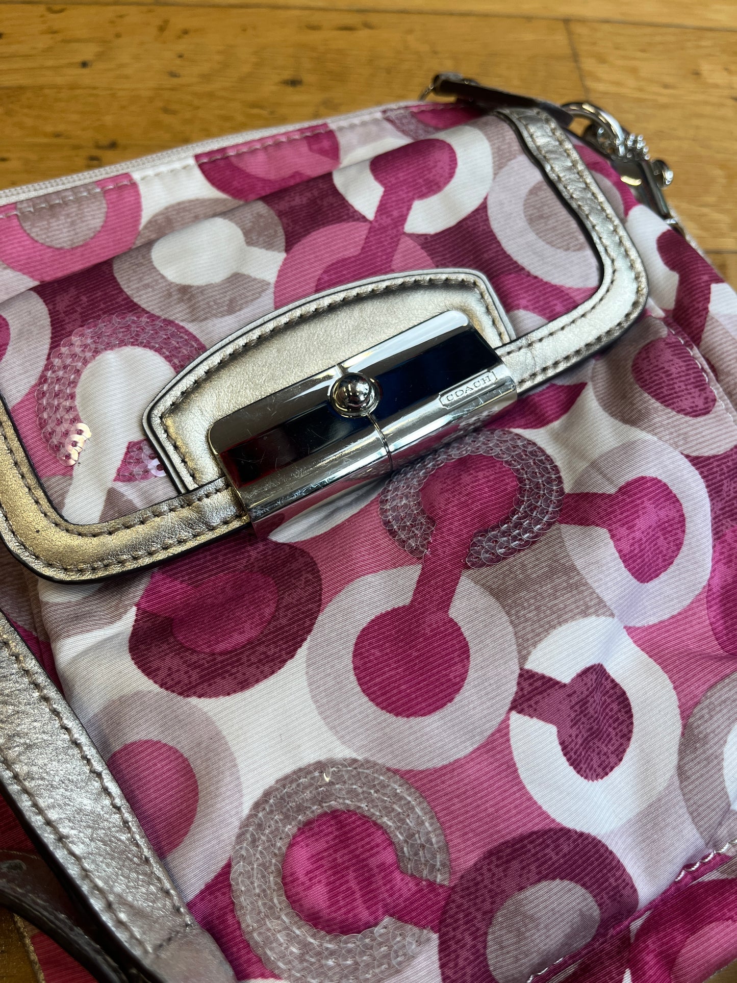 Super cute vintage Coach crossbody! Signature pattern in pink colors. Strap is adjustable but quite long (may put more holes)