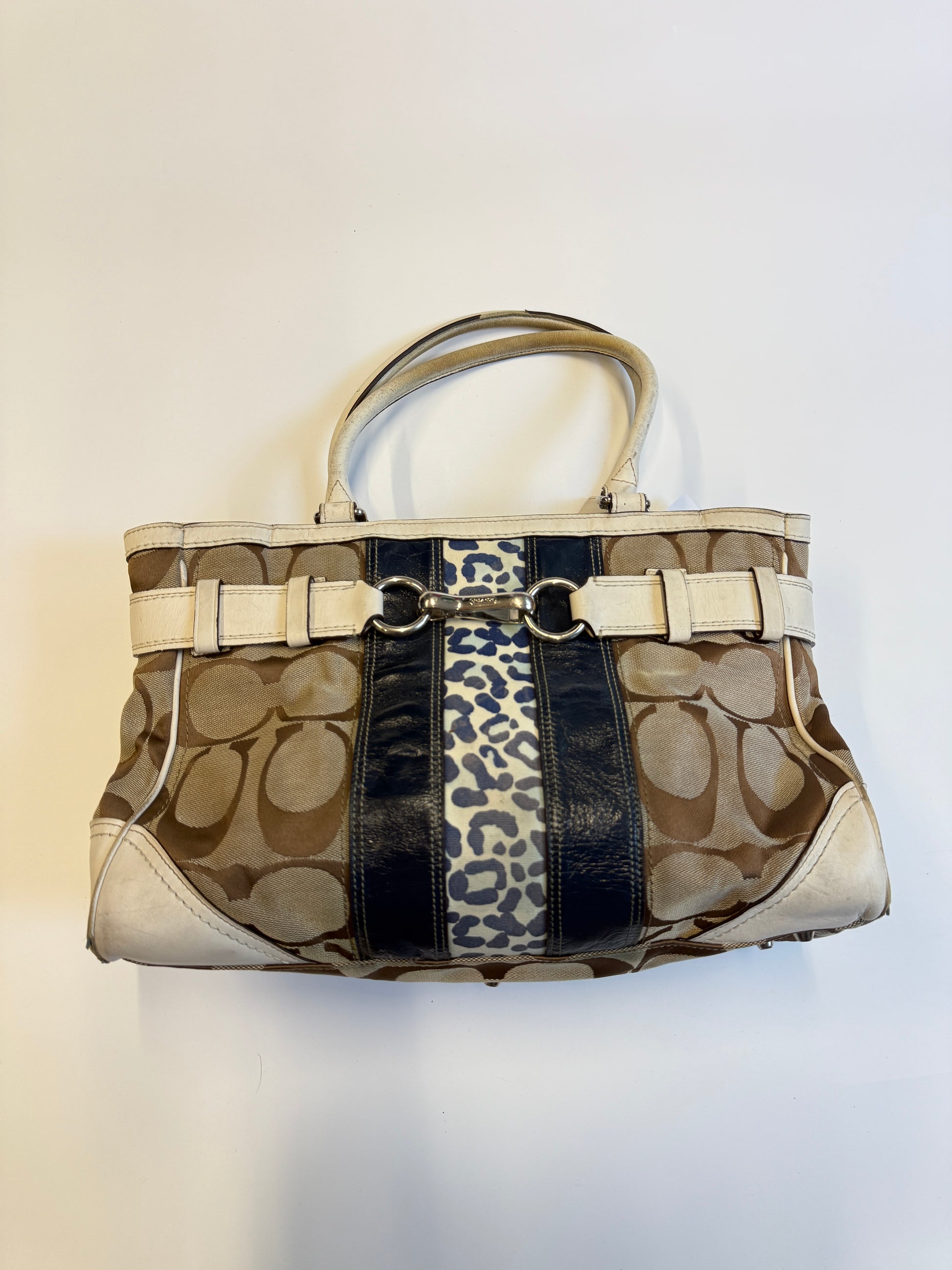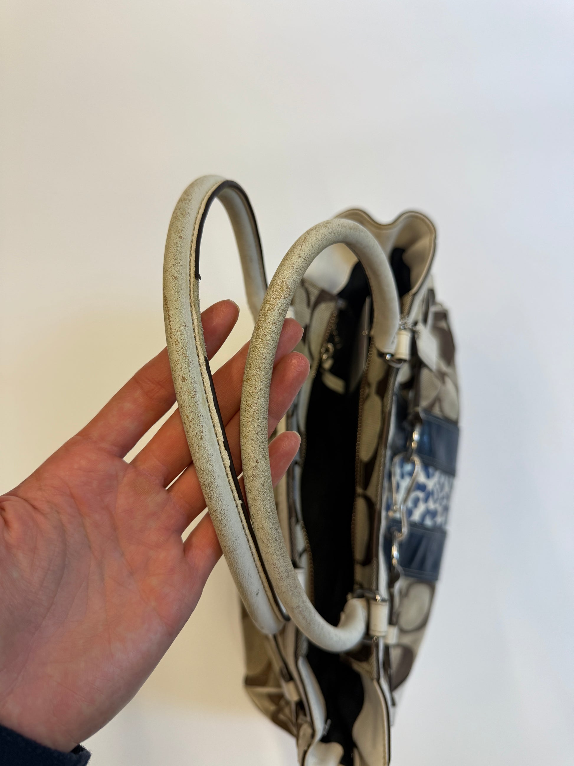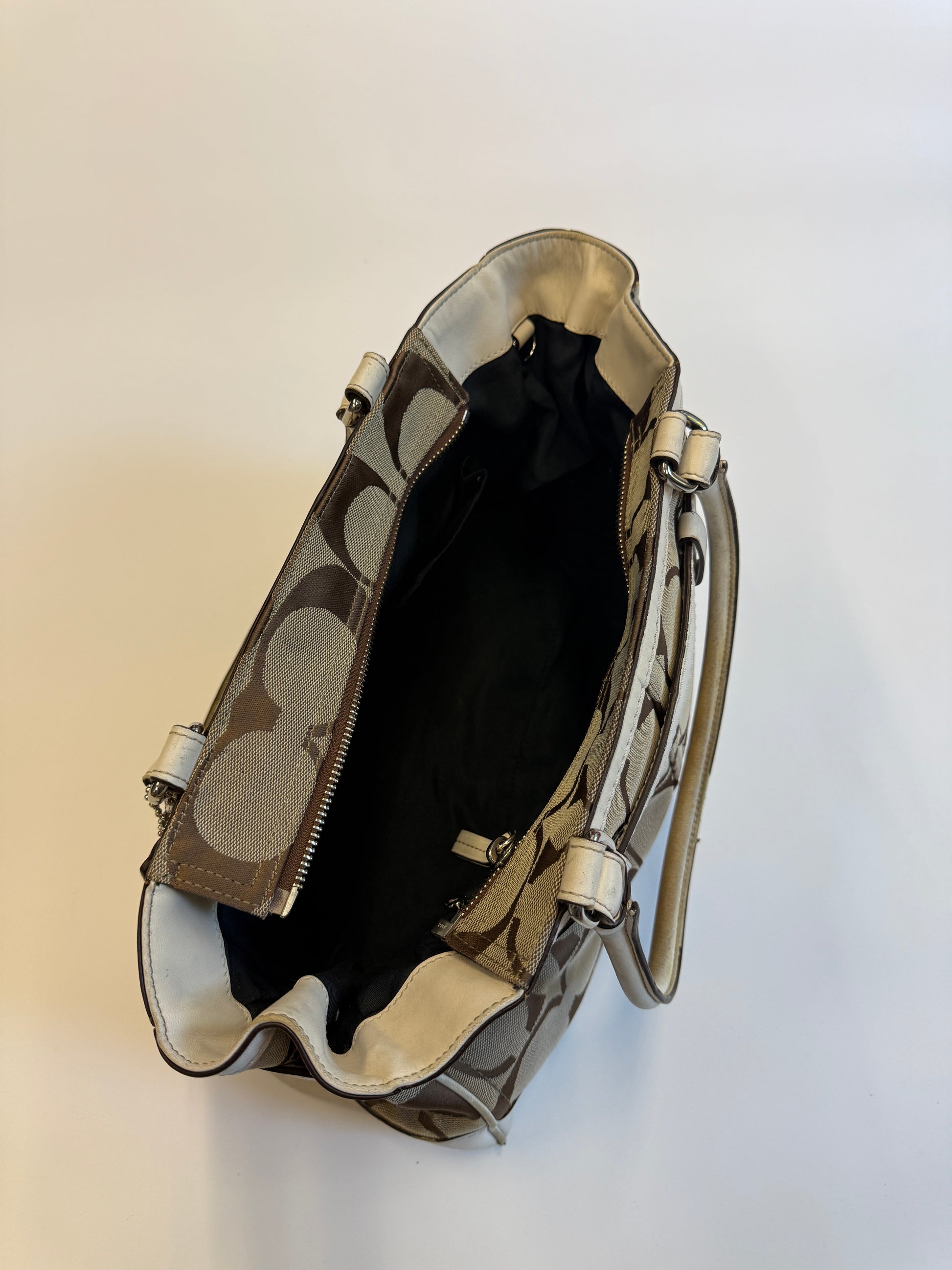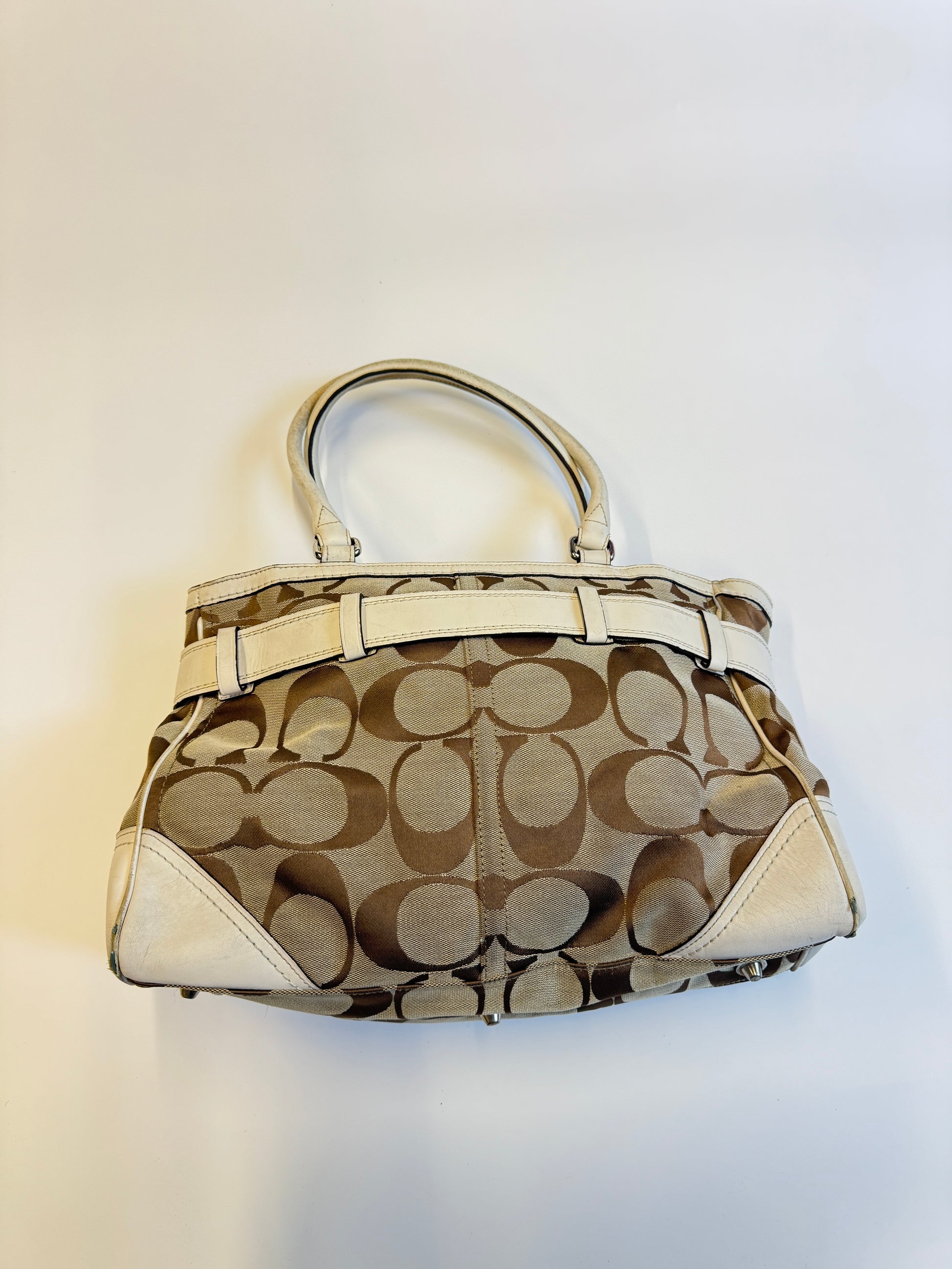 Super rare monogram purse from Coach. Big sized bag with silver hardware. Very nice & spacious, your laptop may fit. Amazing Vintage Piece with a super rare design i've never seen before! Real Leather parts for a longlasting piece in your wardrobe.
