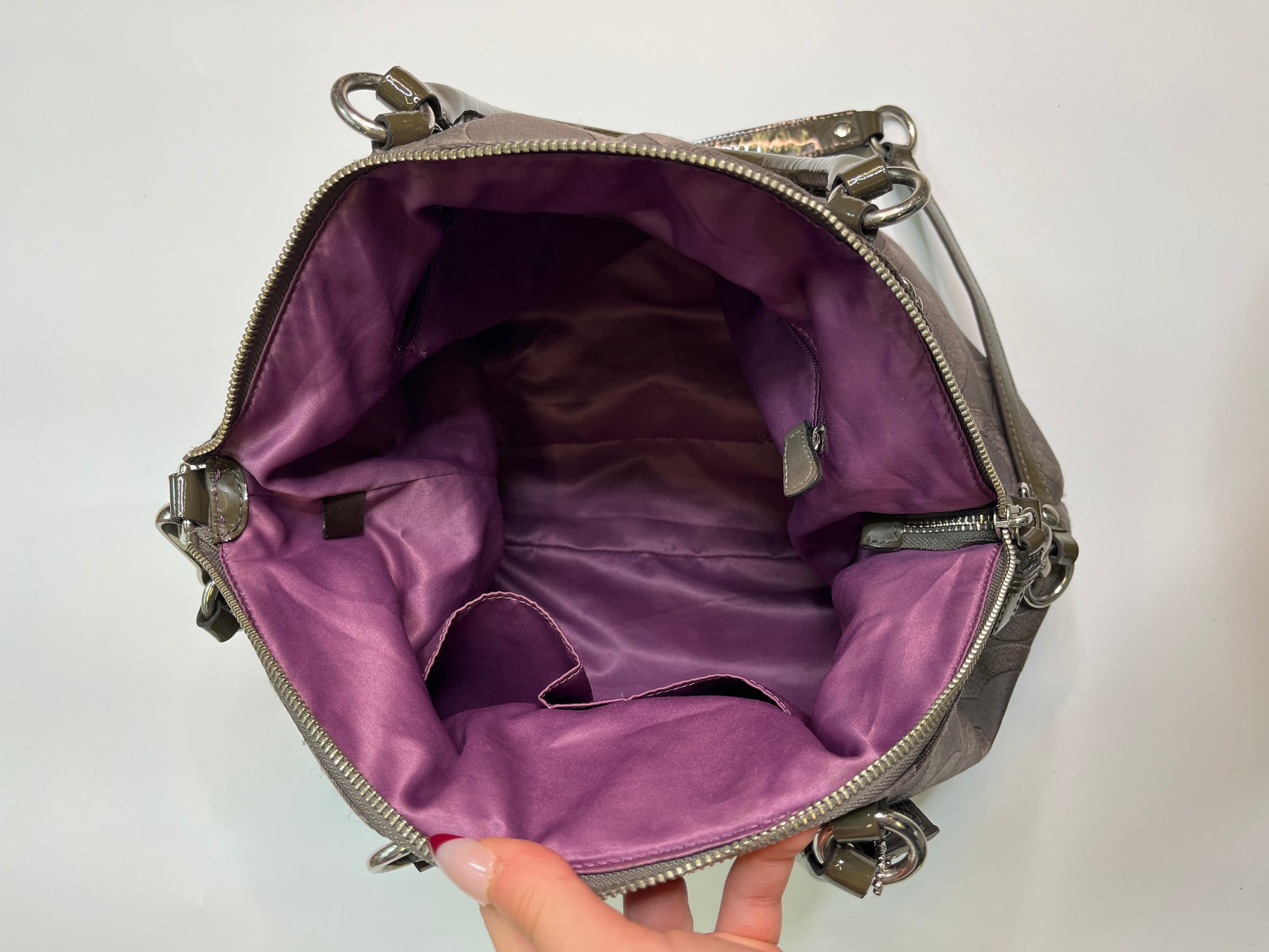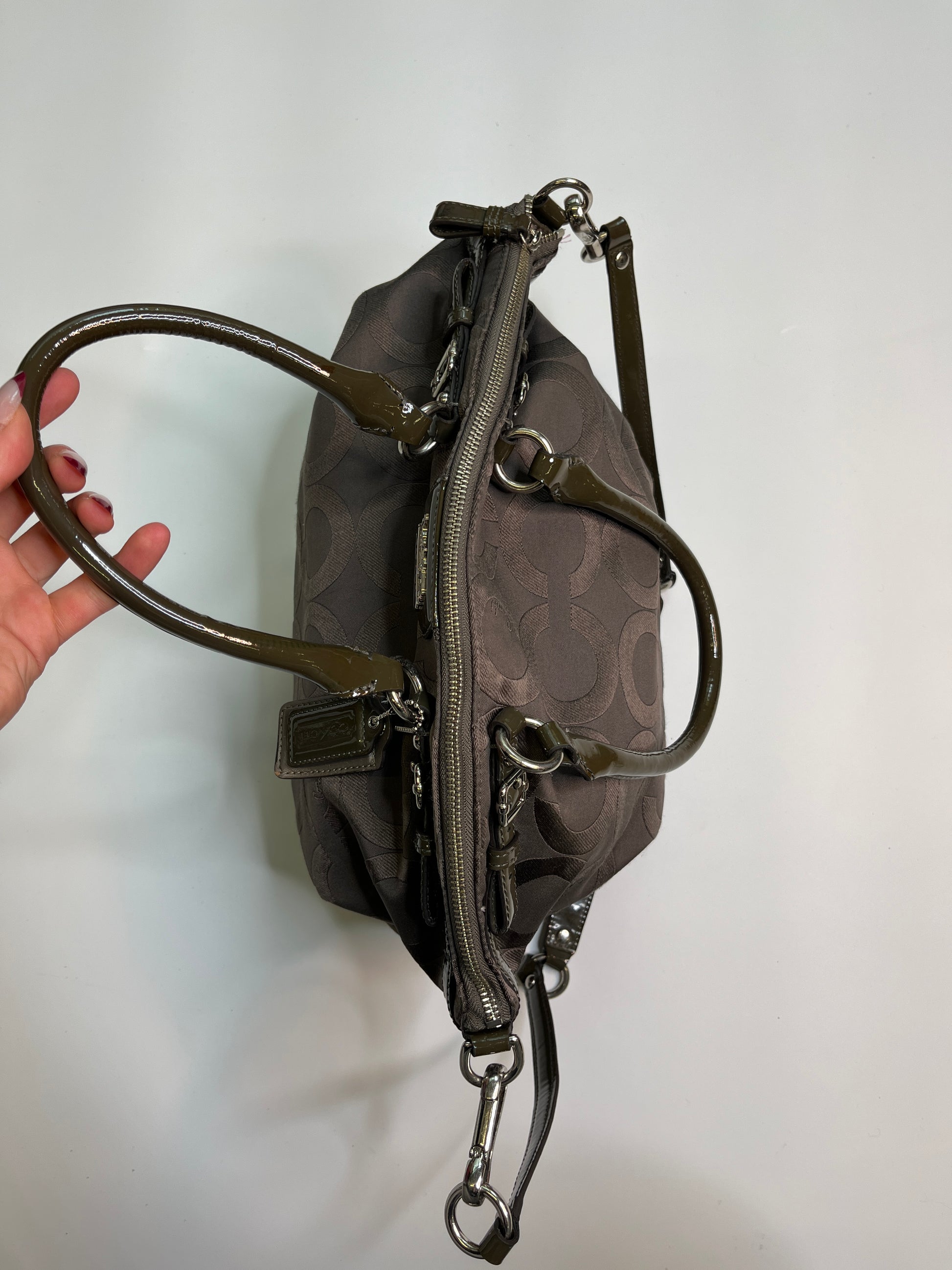 Super spacious monogram purse from Coach. Big sized bag with silver hardware. Very nice & spacious, your laptop may fit. Olive green handles which makes the bag really special. Amazing condition!