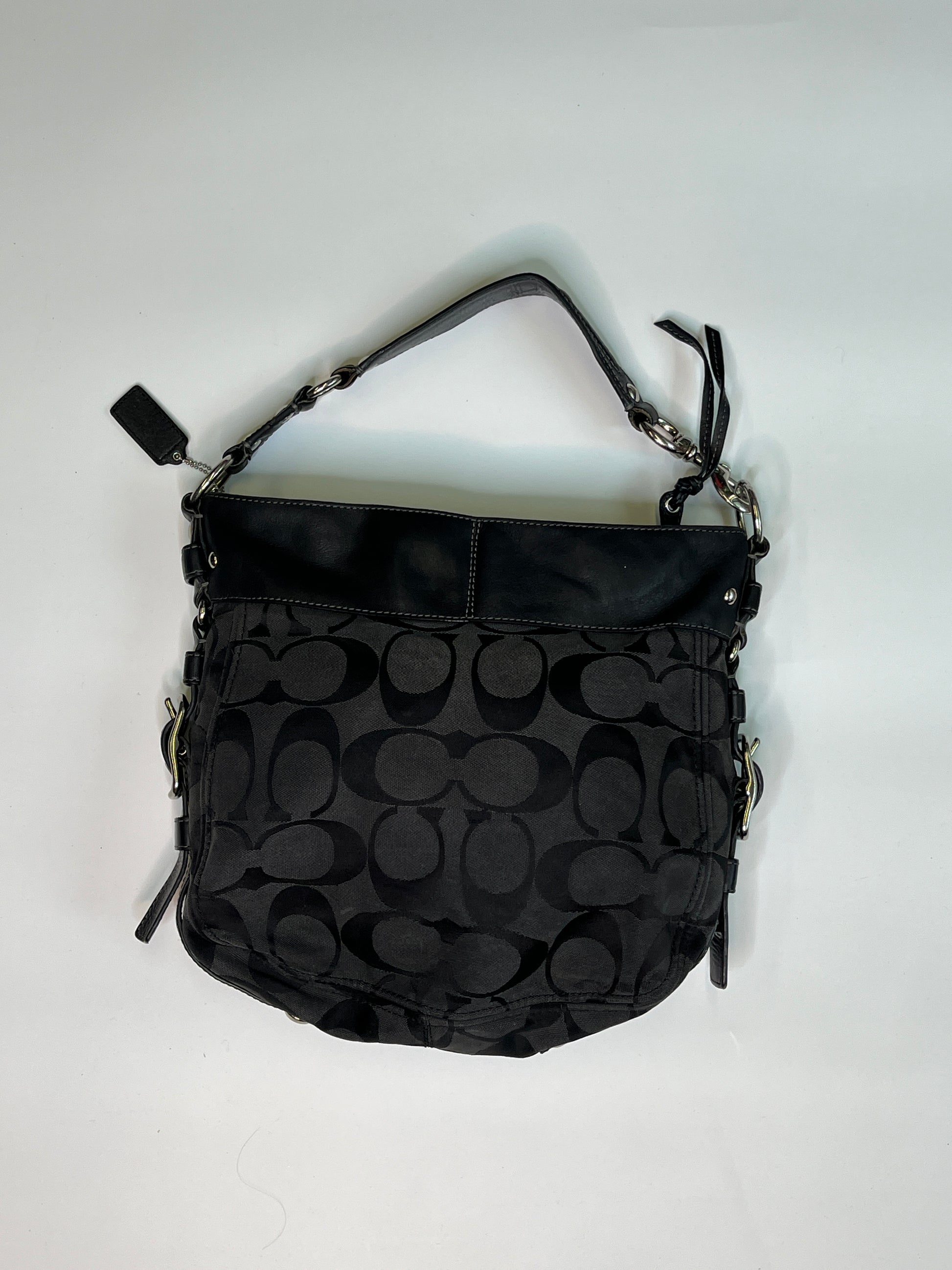 Spacious monogram purse from Coach. Big sized bag with silver hardware. Very nice & in perfect condition! Light blue interior which makes the bag really special. Amazing condition! With real leather parts.
