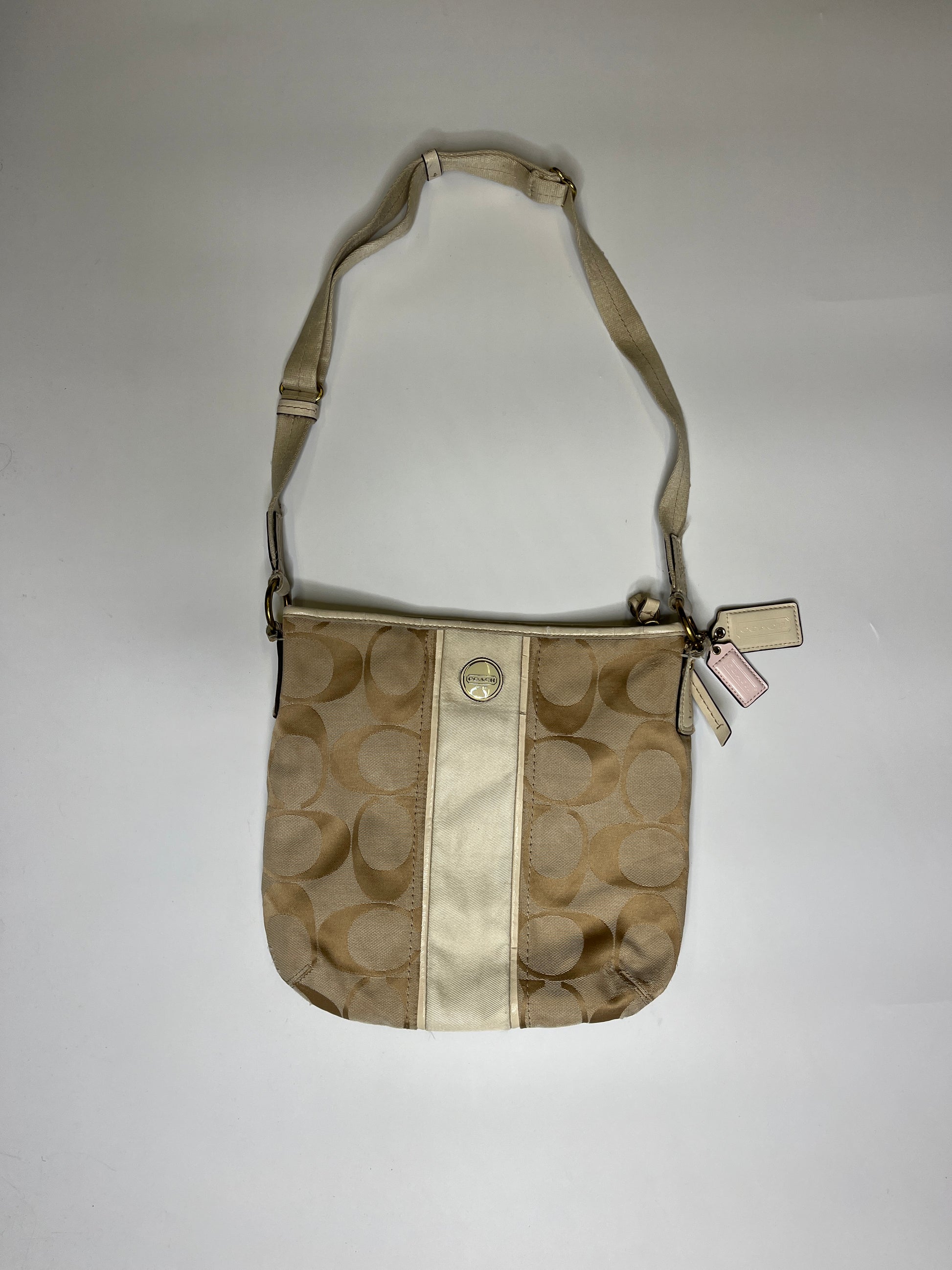 Medium sized crossbody bag from Coach! Cutest bag in Monogram Style. Very nice bag and beautiful colour. Has enough space to carry the most important things. Gold heardware.