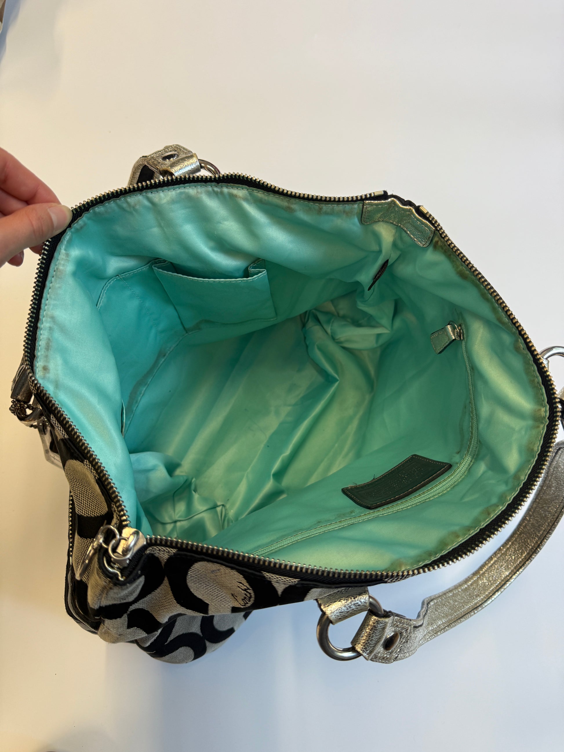Amazing monogram purse from Coach. Big sized bag with silver hardware. Very nice & spacious, your laptop may fit. Special Silver detailing & cute charms.