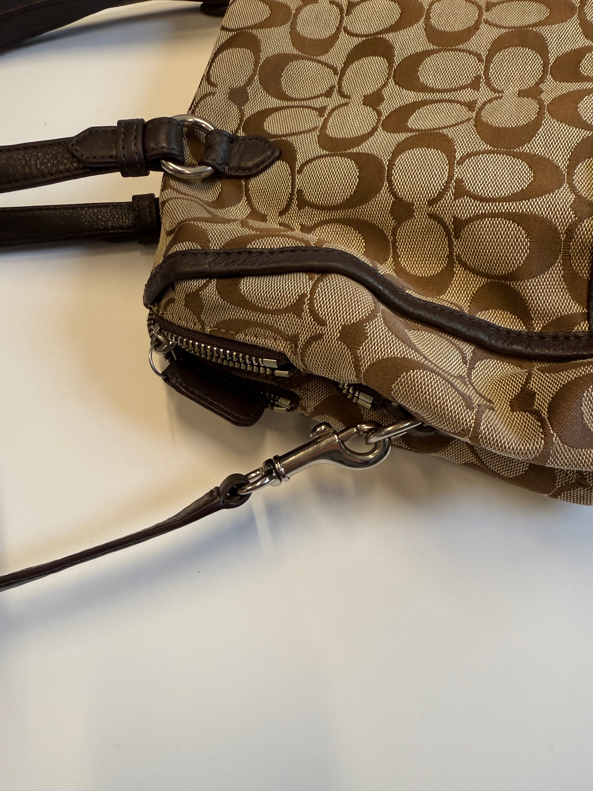 Super spacious monogram purse from Coach. Big sized bag with silver hardware. Very nice & spacious, your laptop may fit (3 different compartments perfect for school!). Amazing vintage piece! Real leather parts for a long use. The longer belt is detatchable.