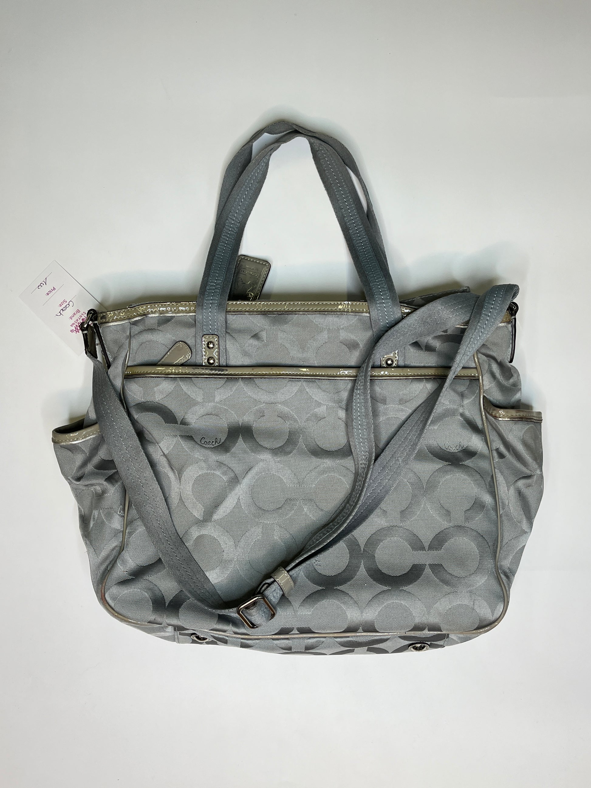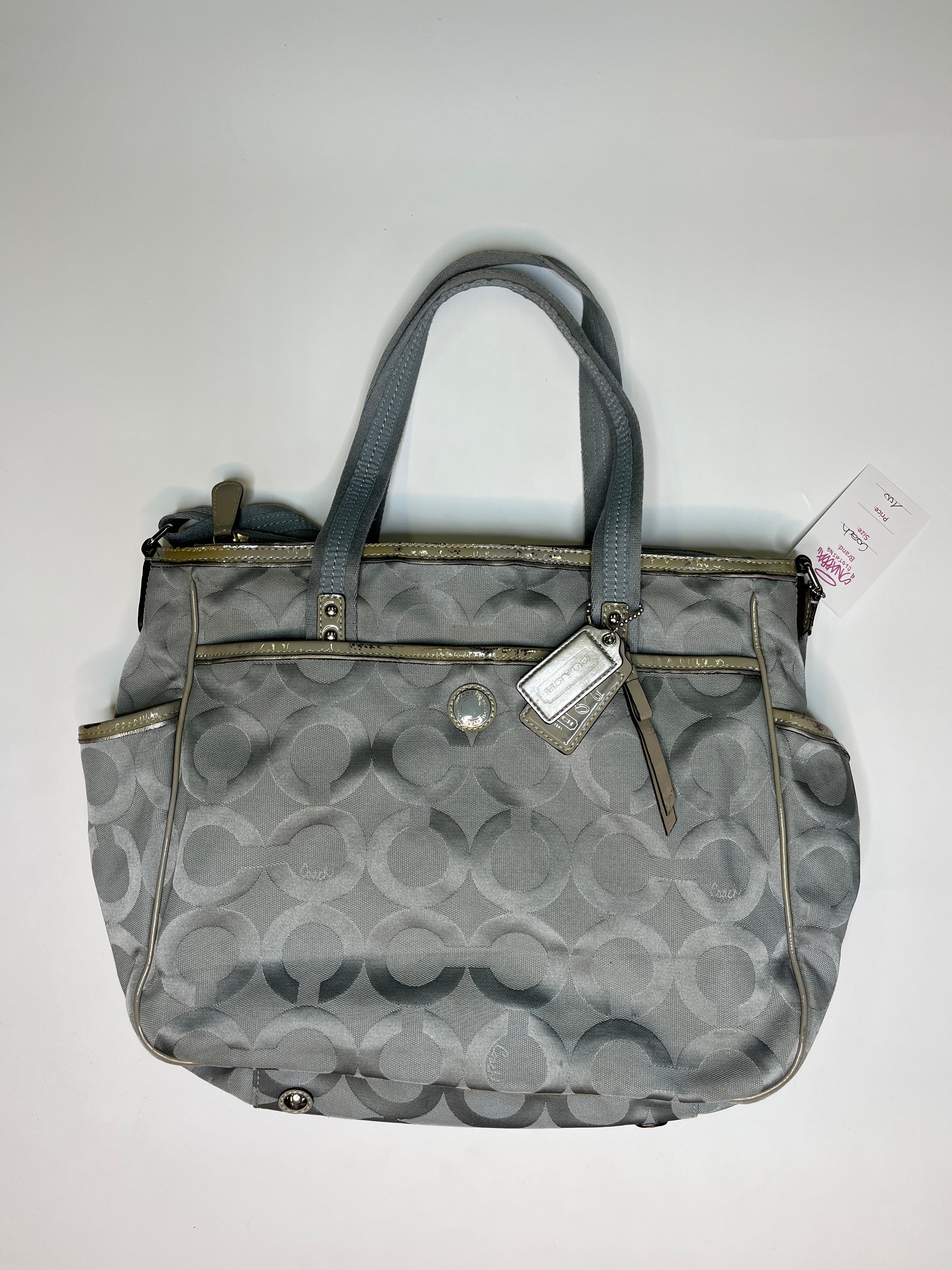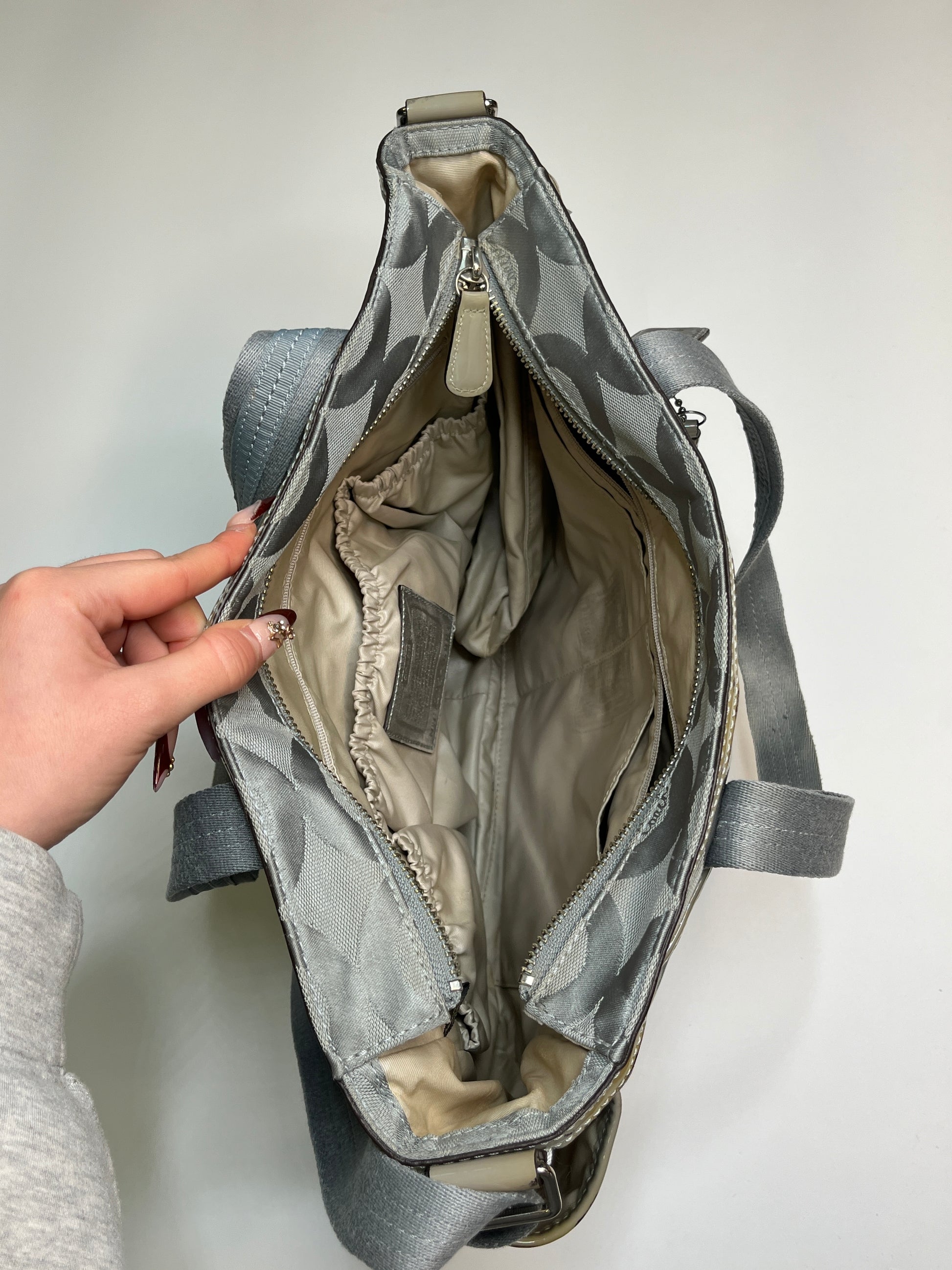 Beautiful bag from Coach! Very cool silver/ blue design. Has enough space for your laptop! Silver hardware. One longer handle attached to wear it as a crossbody purse.