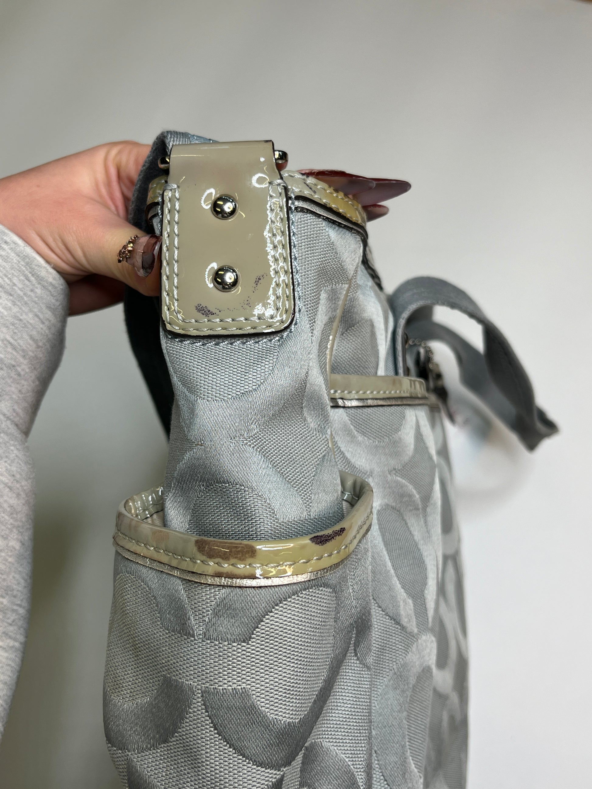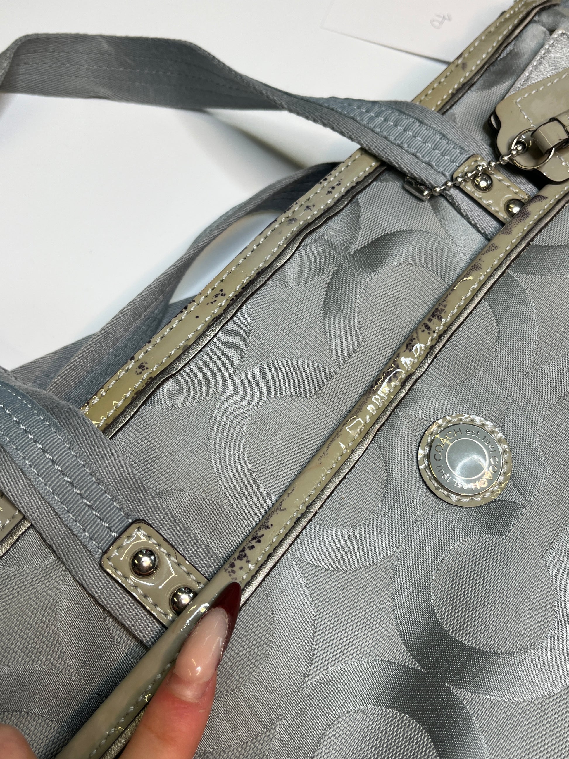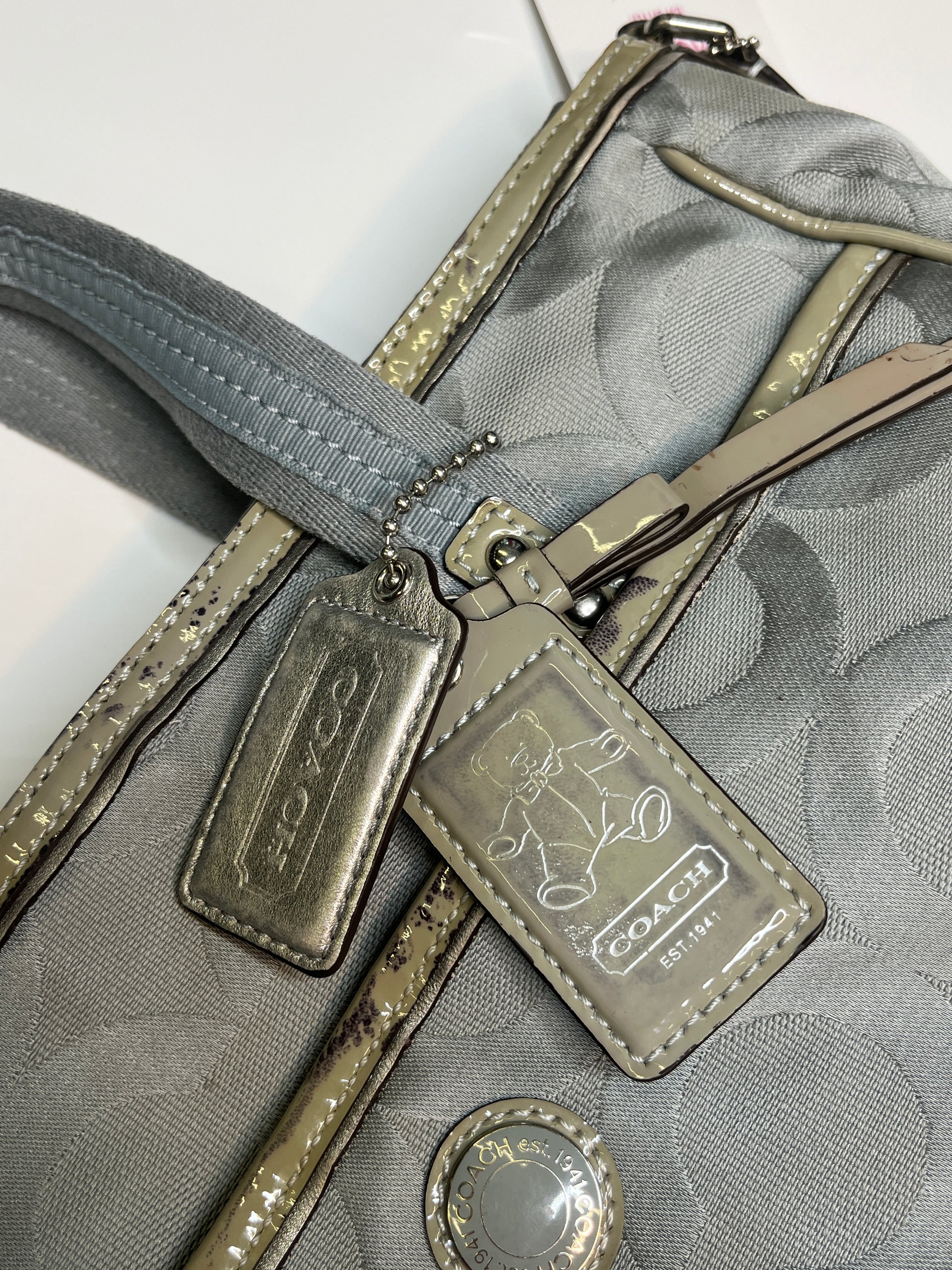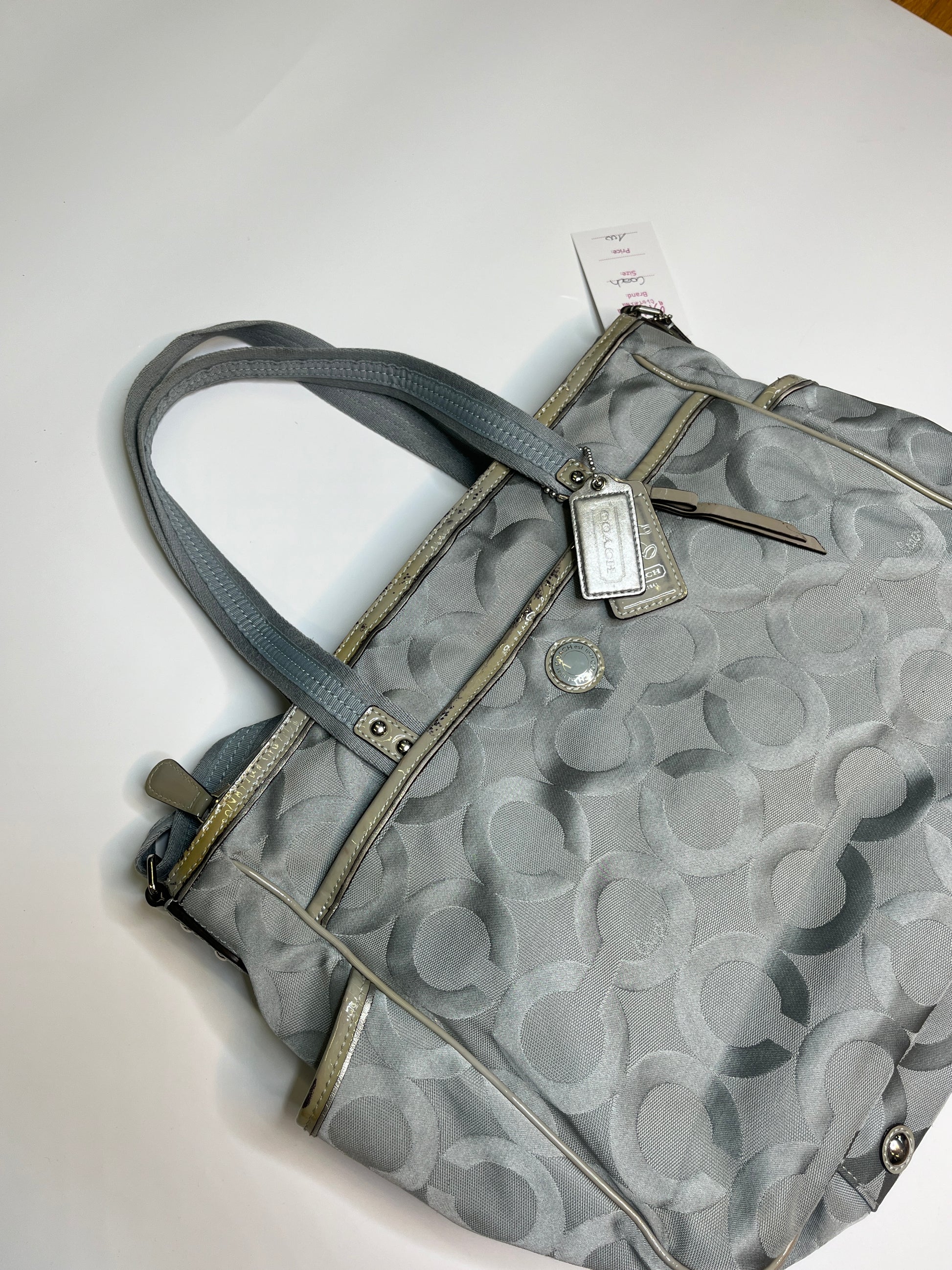 Beautiful bag from Coach! Very cool silver/ blue design. Has enough space for your laptop! Silver hardware. One longer handle attached to wear it as a crossbody purse.