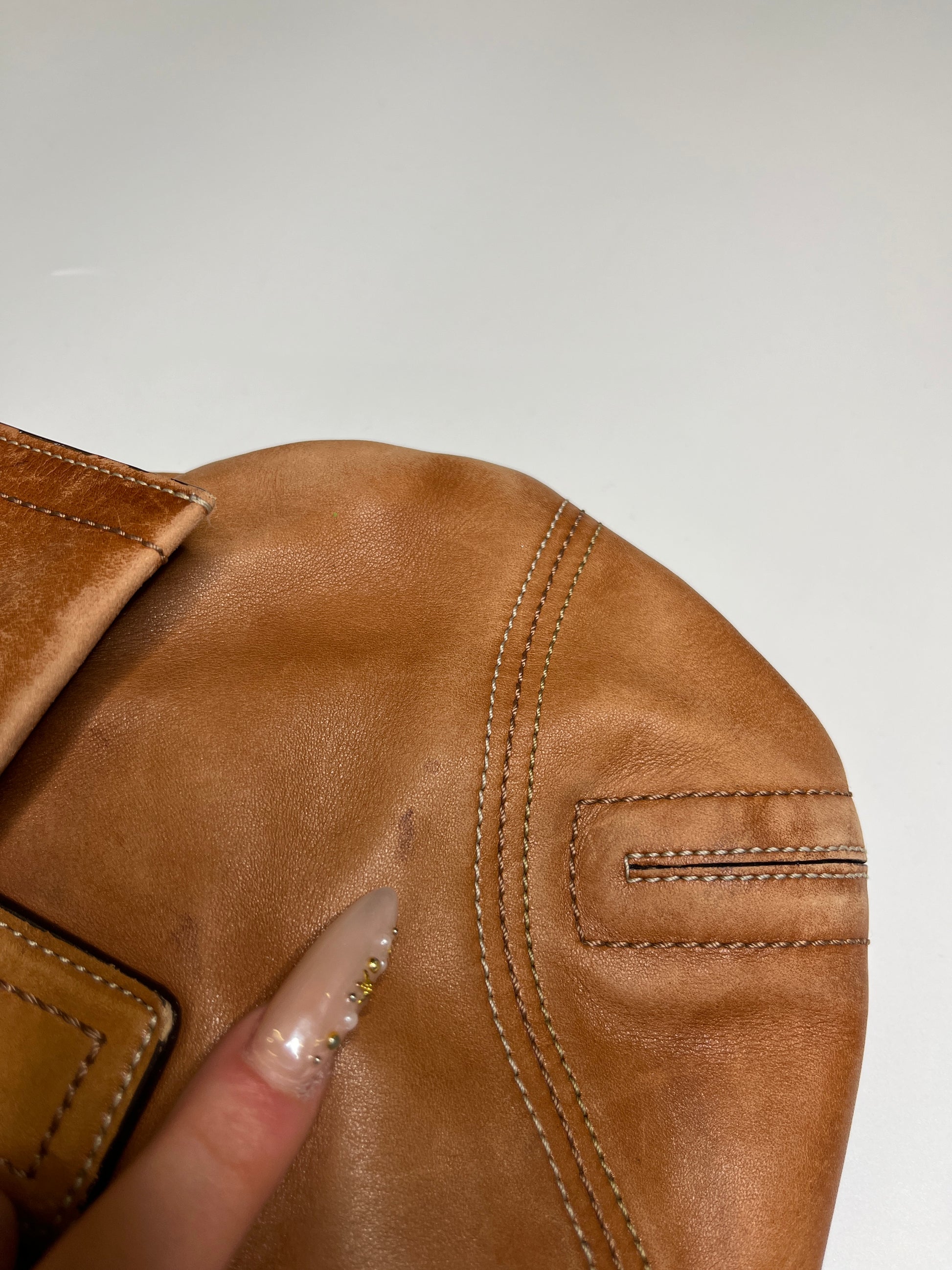cond: 6.5-7/10, signs of use tho the leather, spots and scratches in the front, very old bag (see pictures )