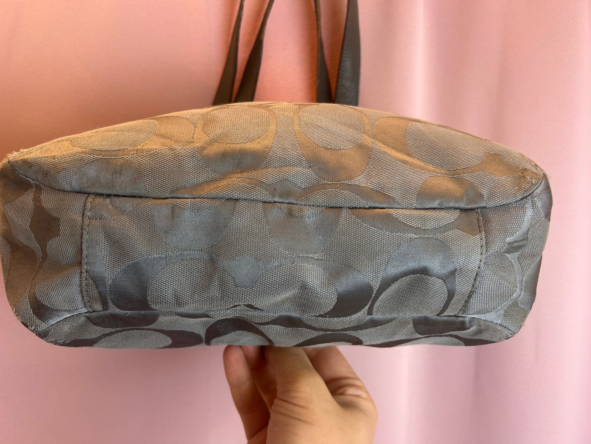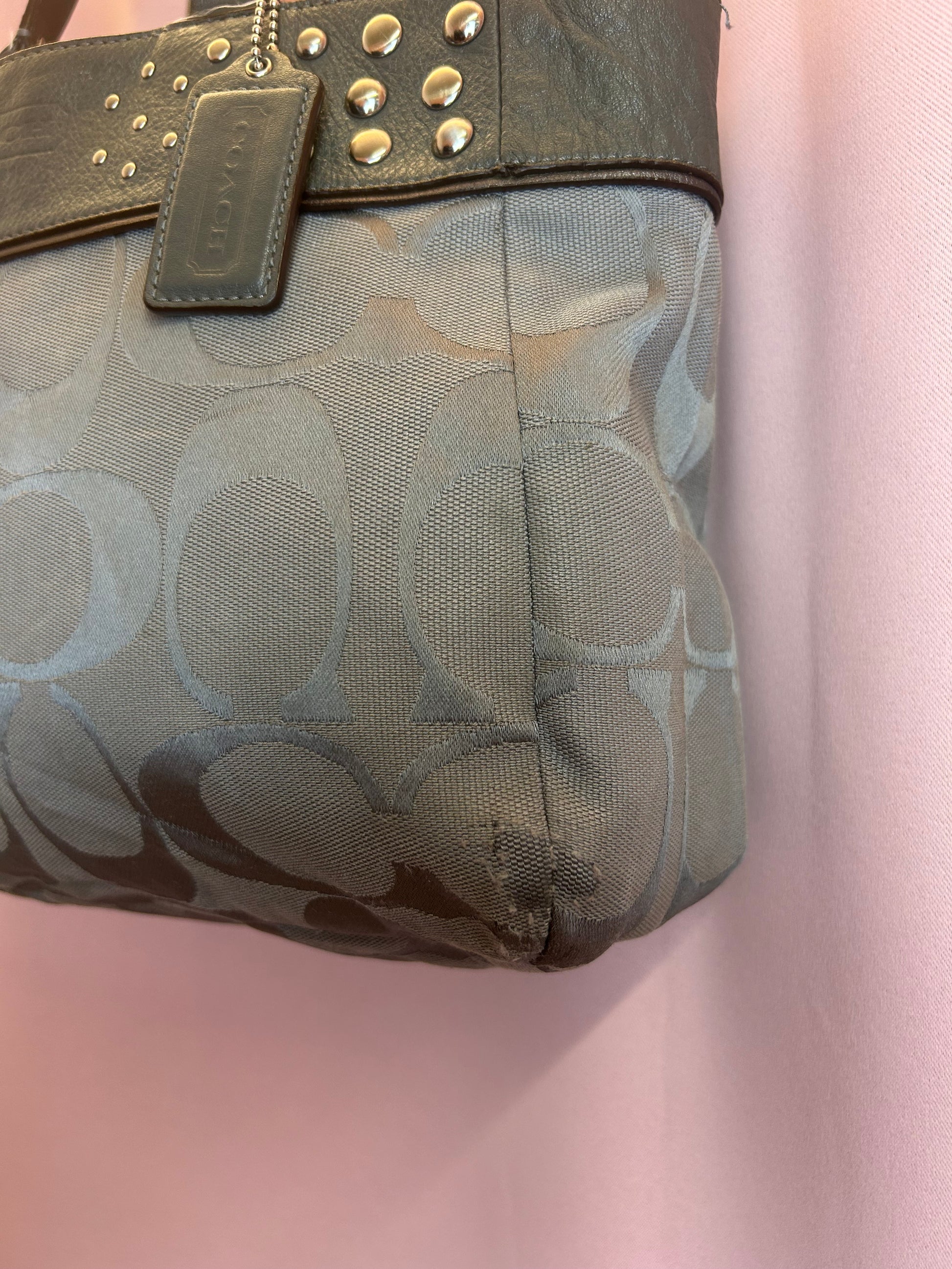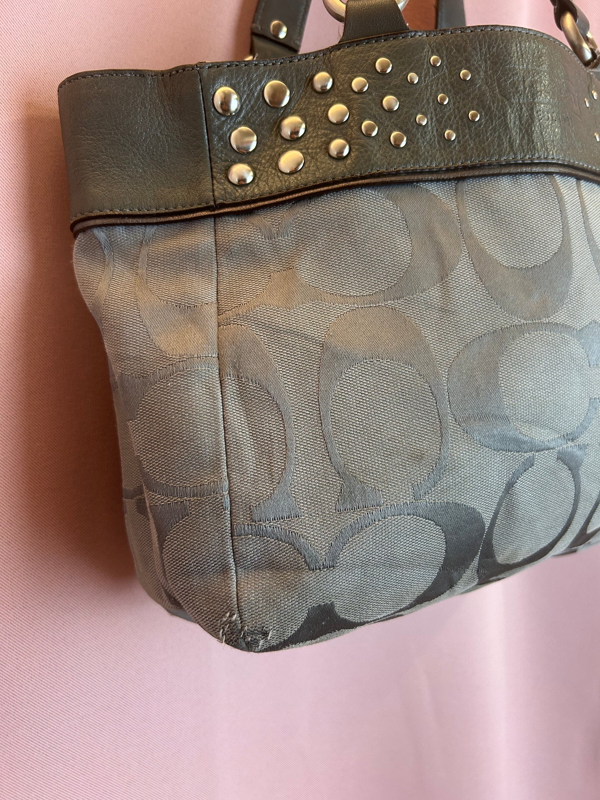 Very nice grey monogram Coach purse with real leather parts. Super cute bubbly silver detailing in the front! Medium sized bag.