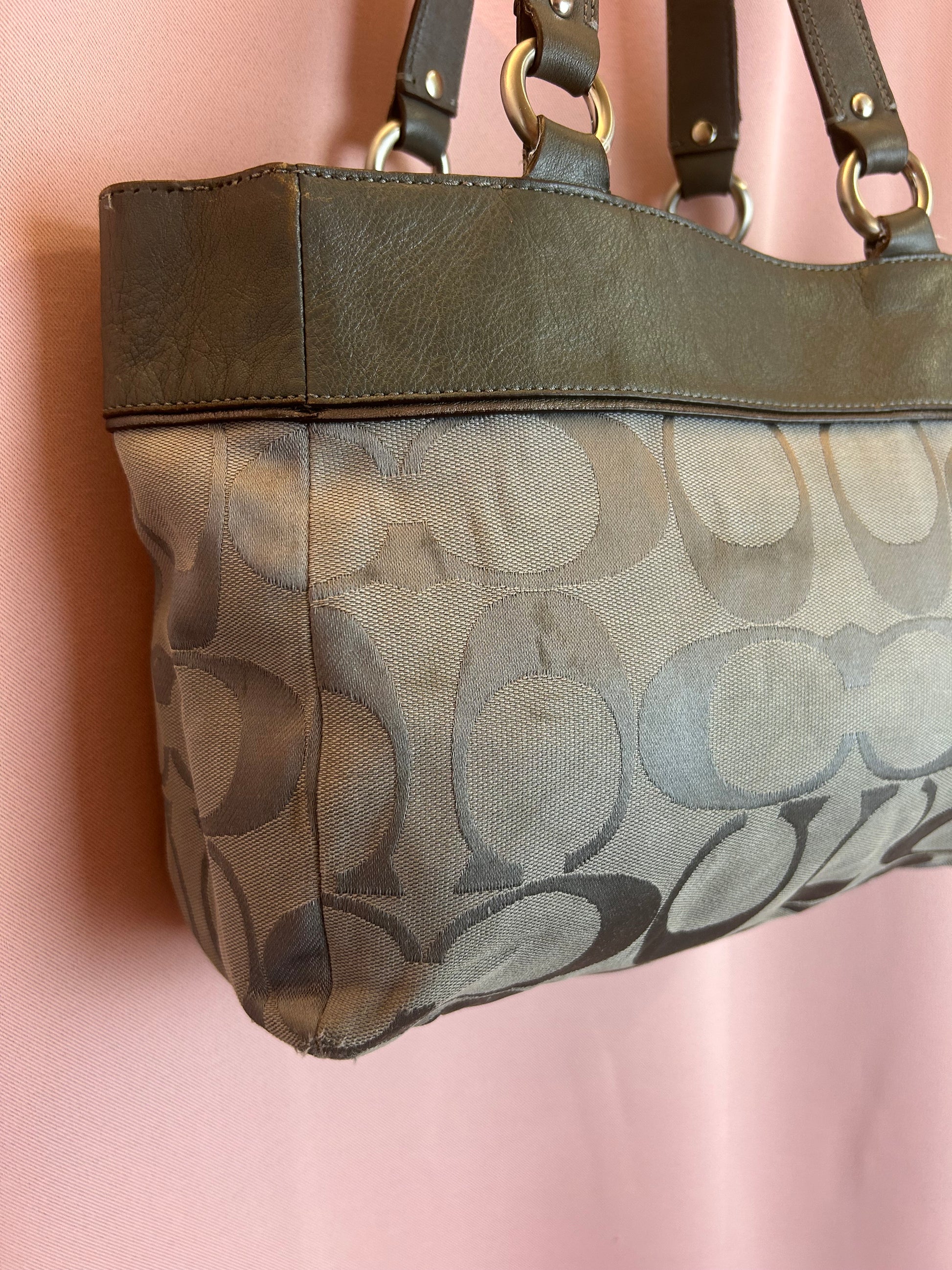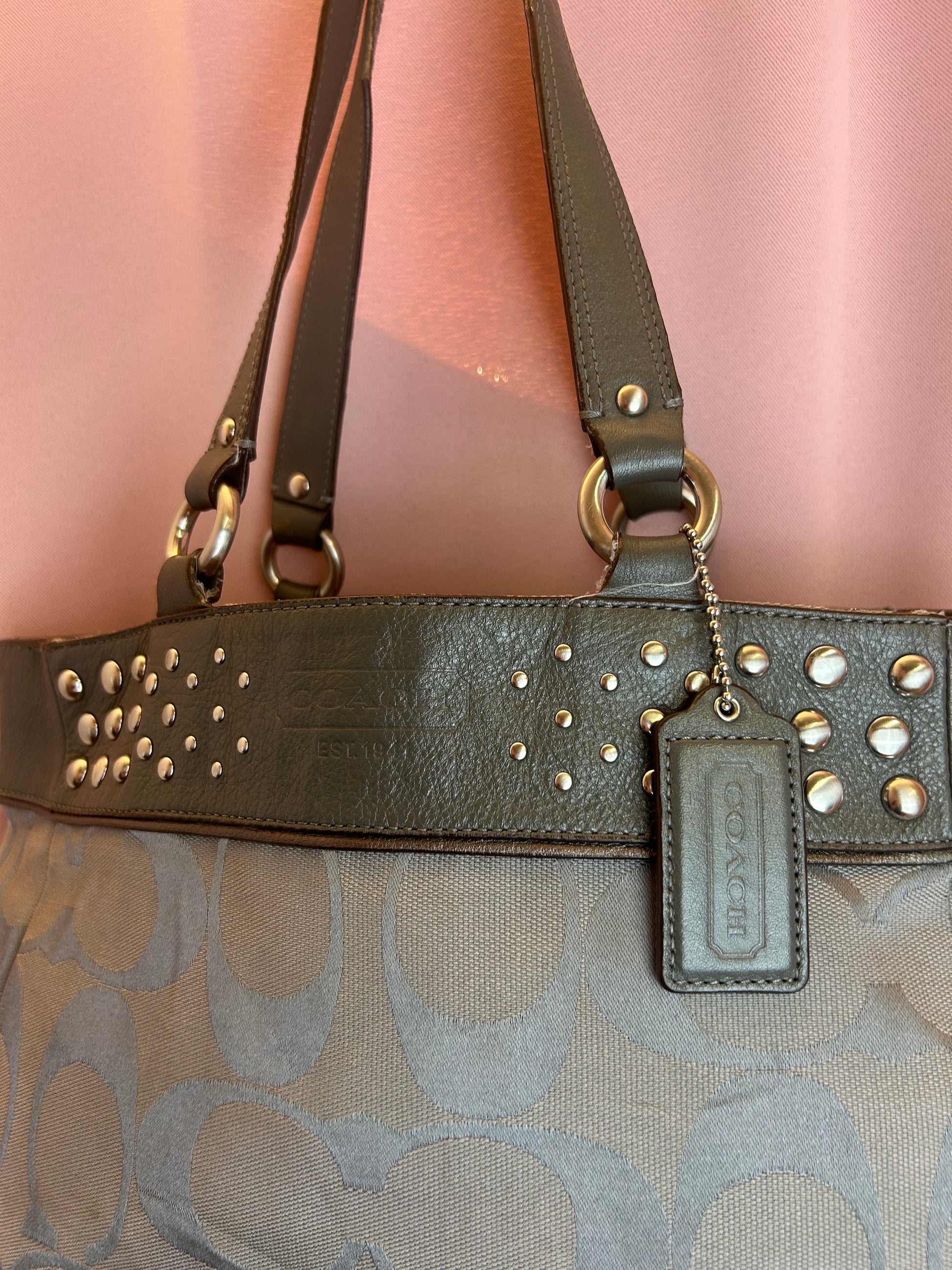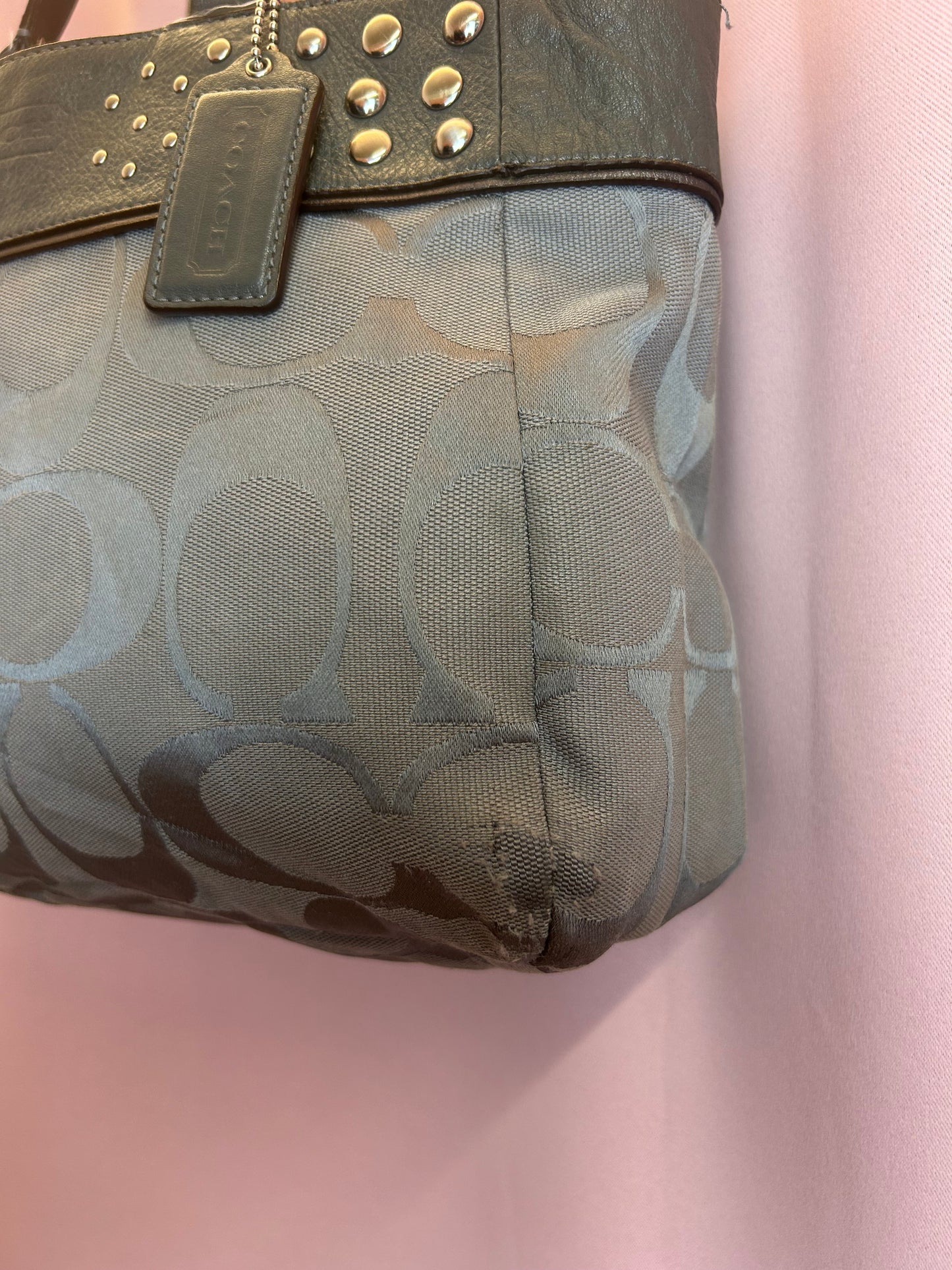 Very nice grey monogram Coach purse with real leather parts. Super cute bubbly silver detailing in the front! Medium sized bag.