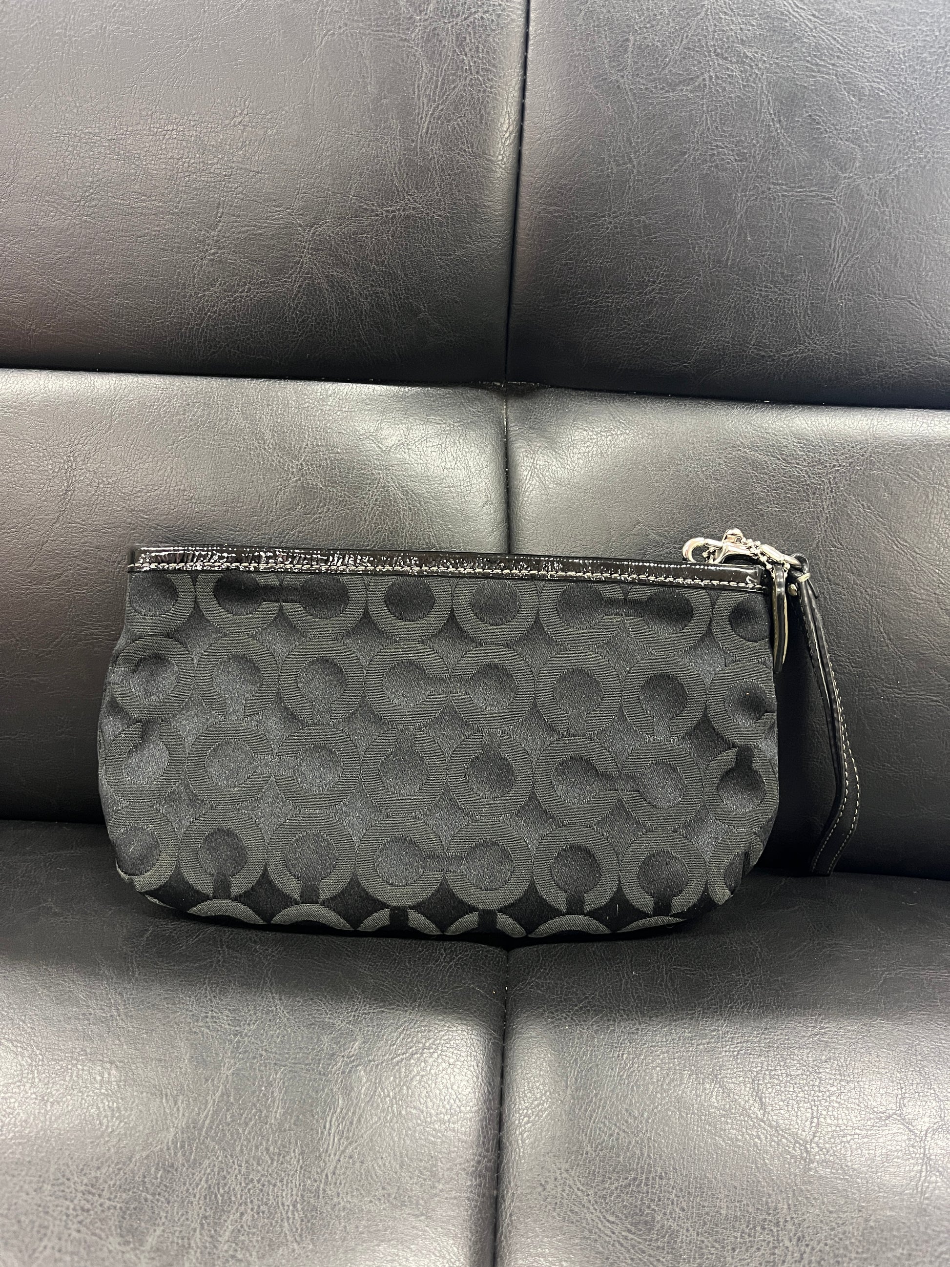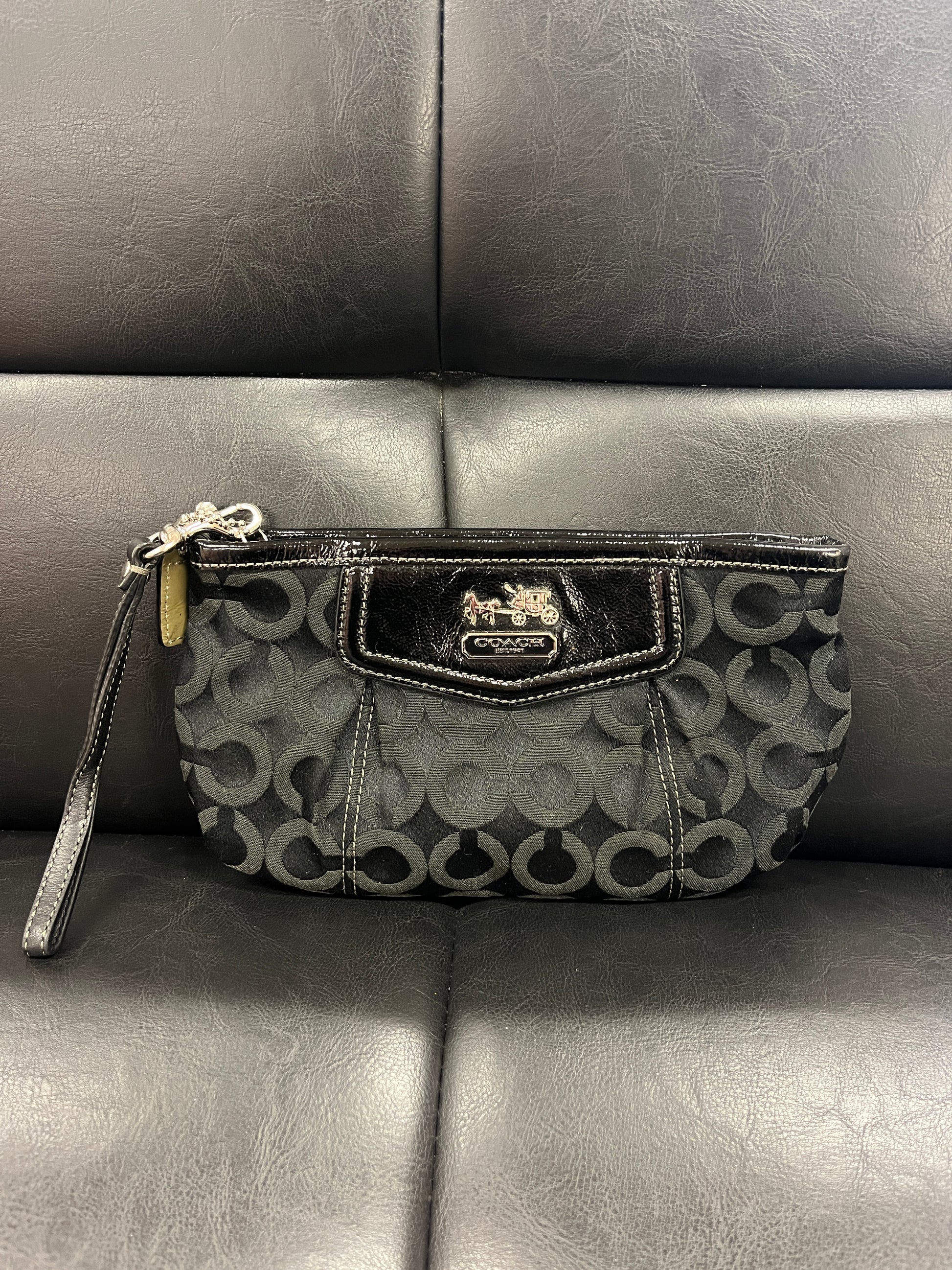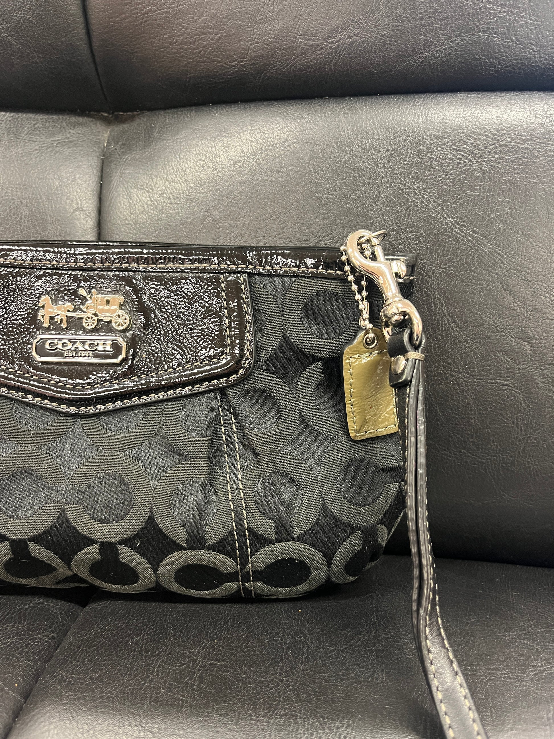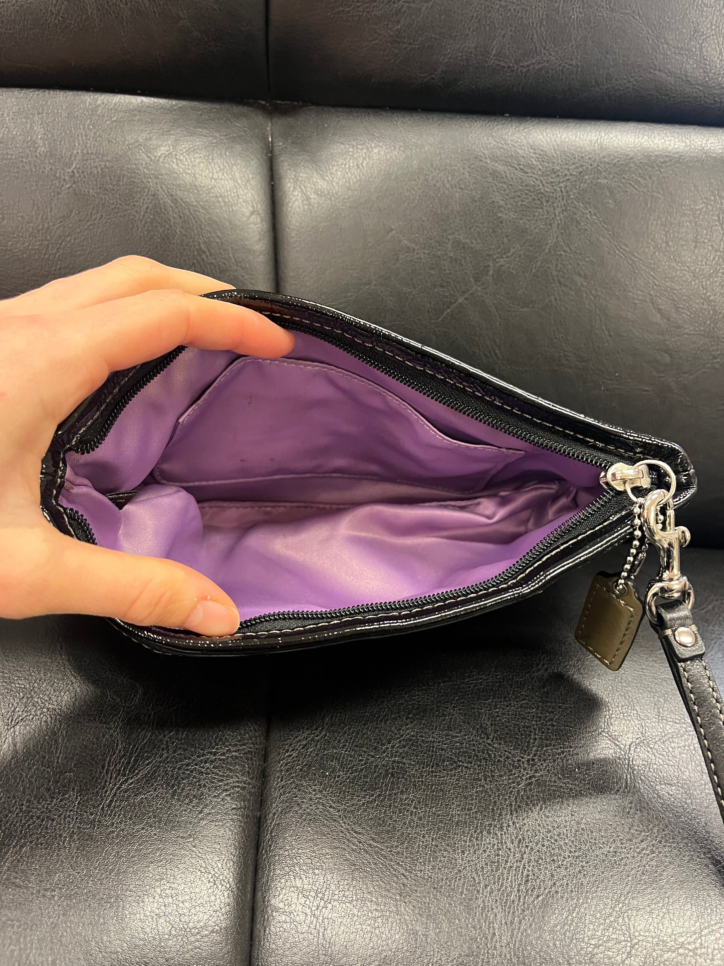 Very nice Coach wristlet. Monogram Pattern & shiny leather optic. The strap is real leather.