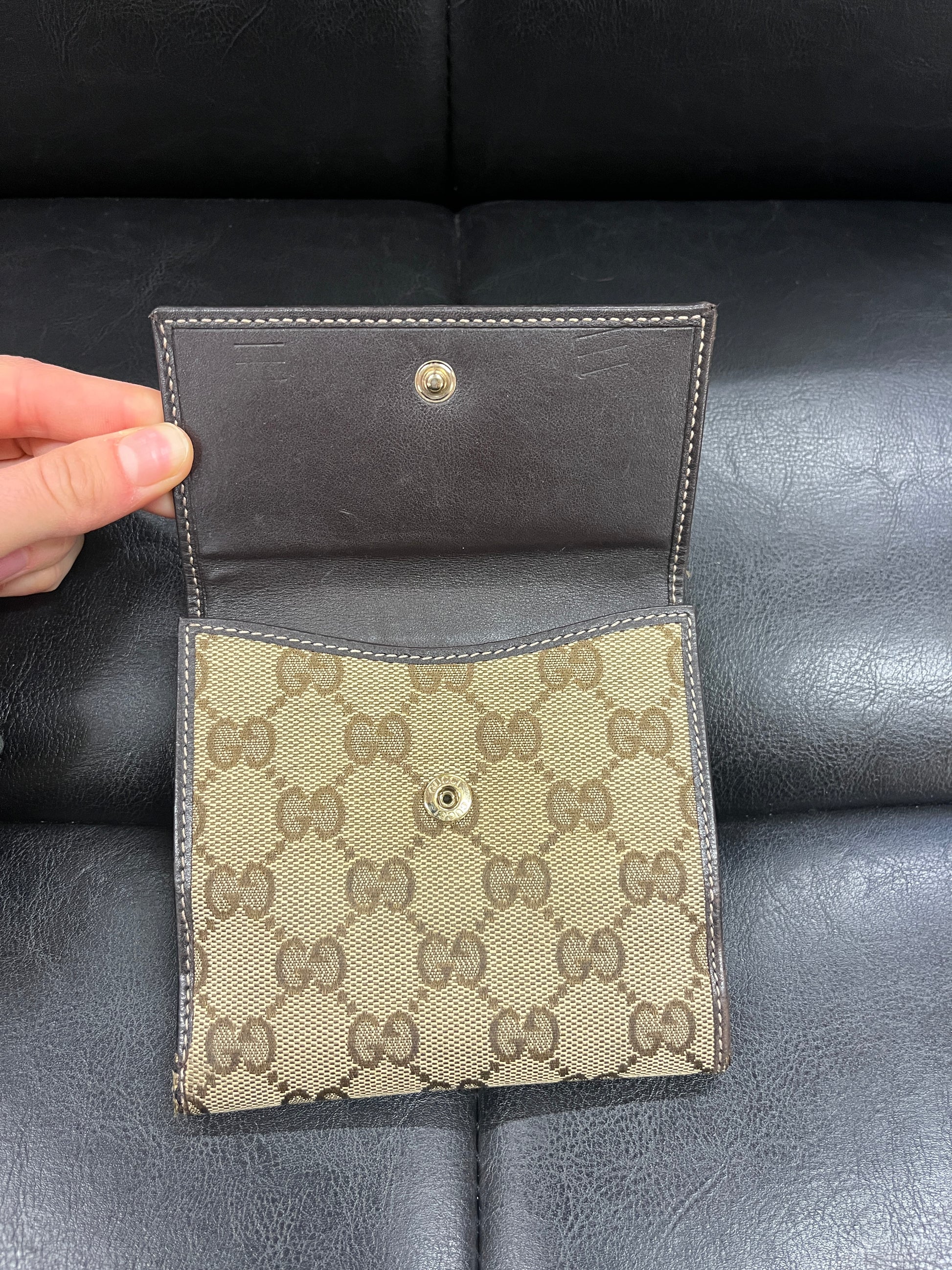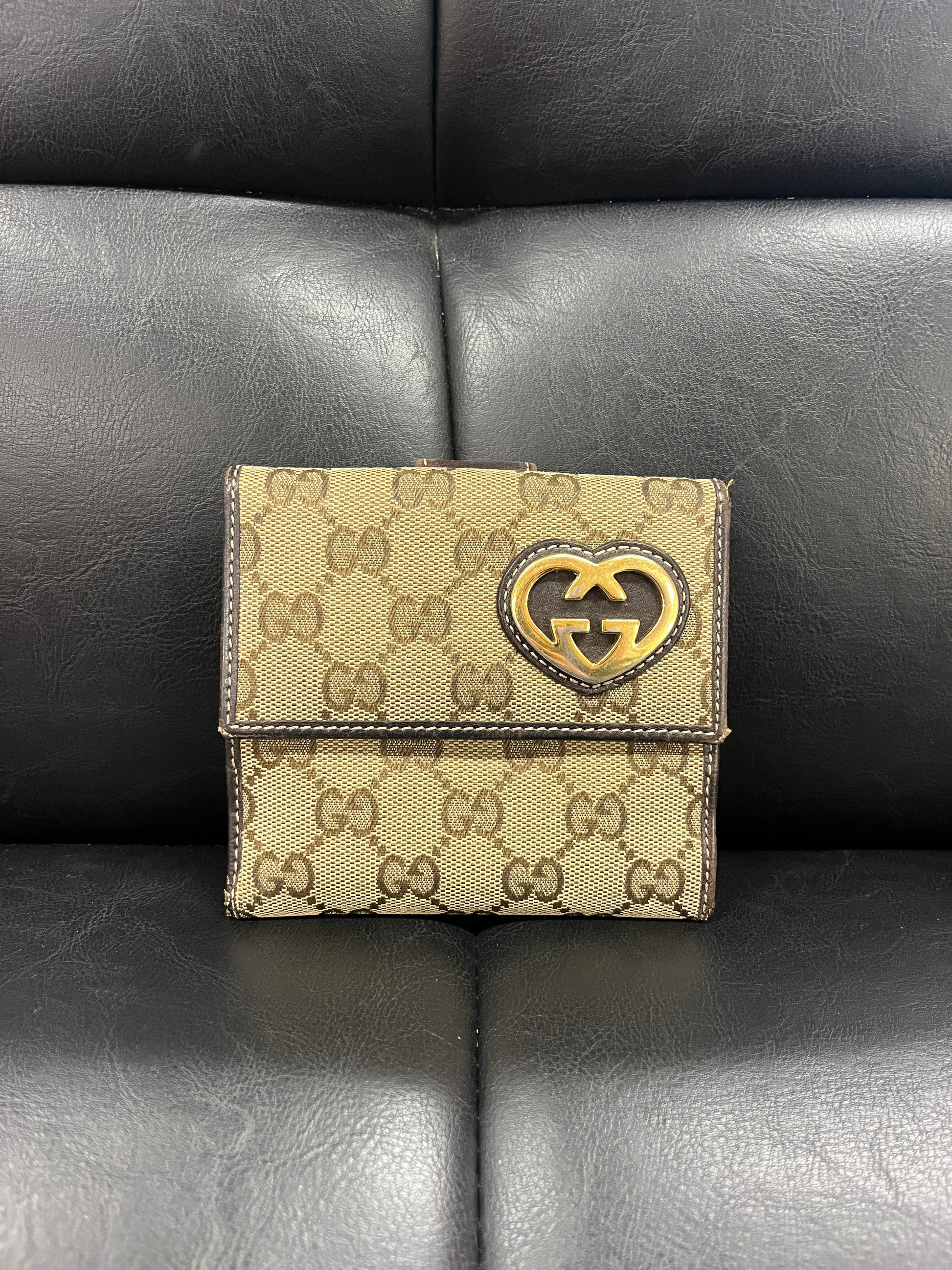 Very special Gucci wallet with heart design. Monogram pattern & Gold hardware. Space for coins, paper & cards. Real leather inside.