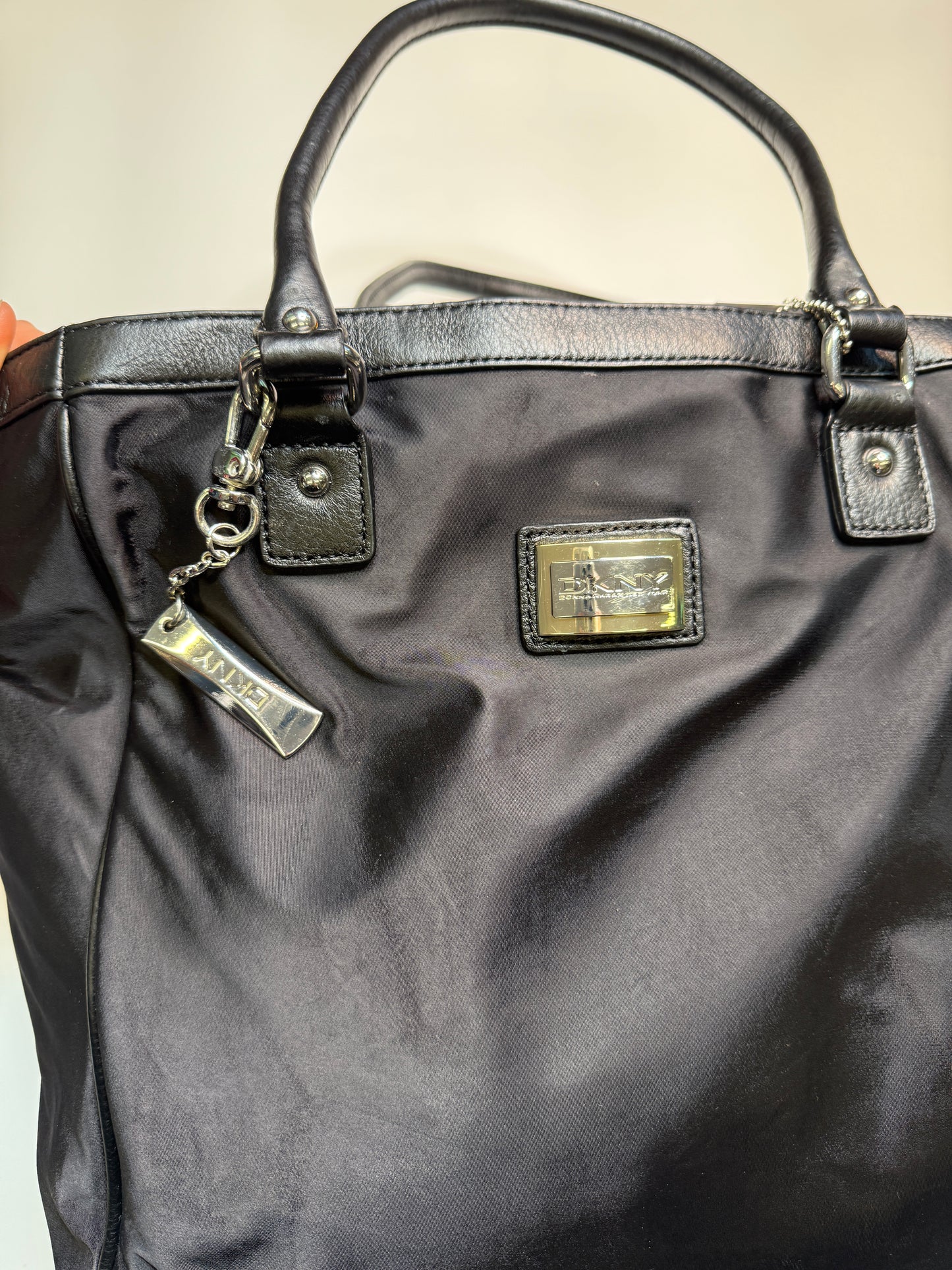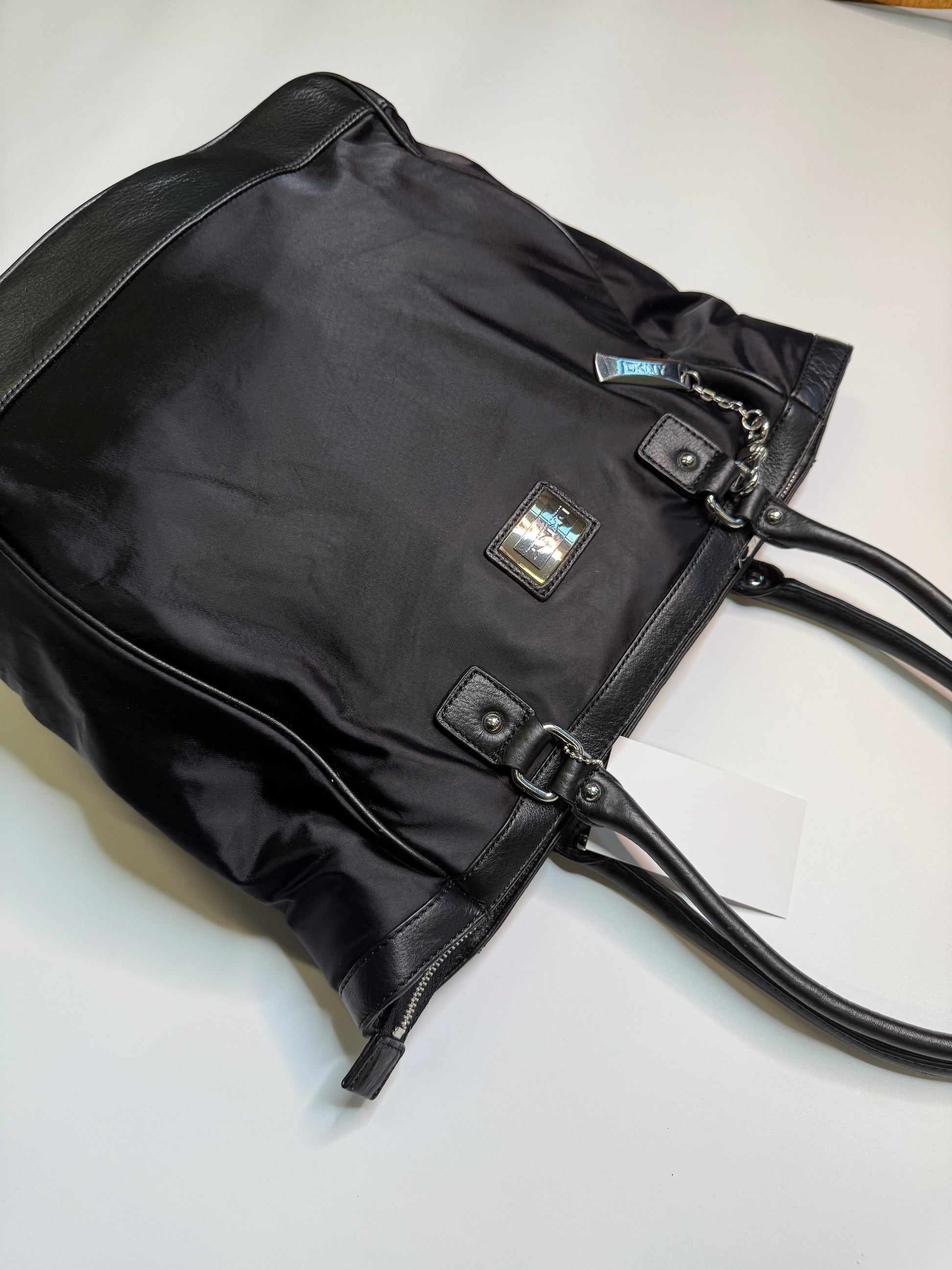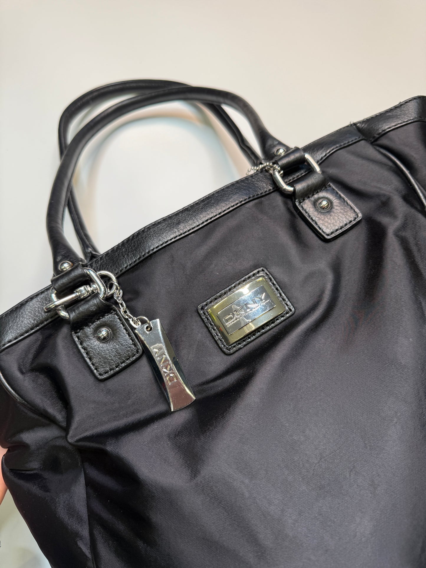 Amazing Bag from the brand DKNY. Big sized bag, perfect for school/uni with silver hardware. Nylon fabric with real leather parts.