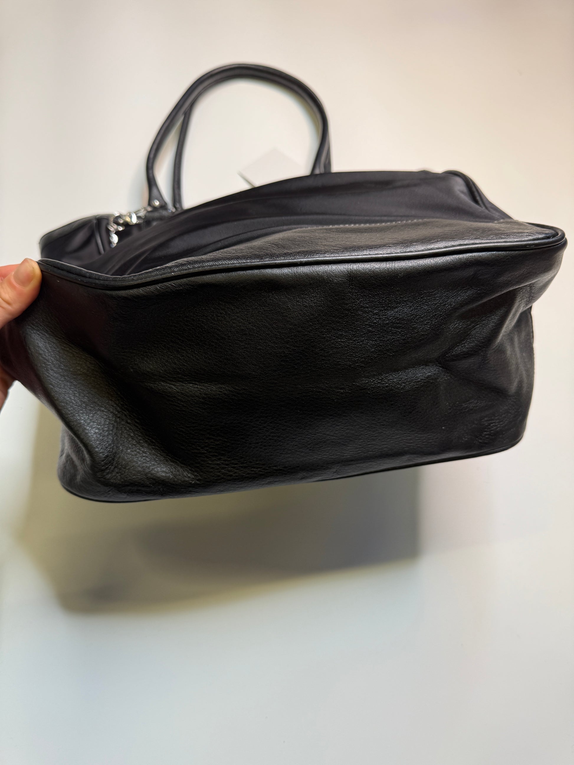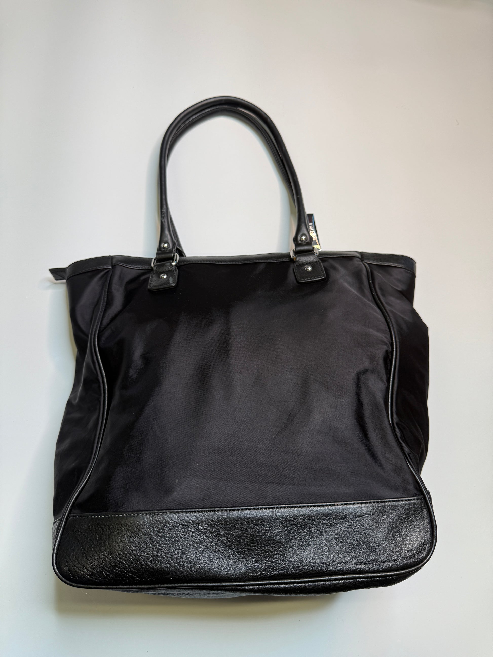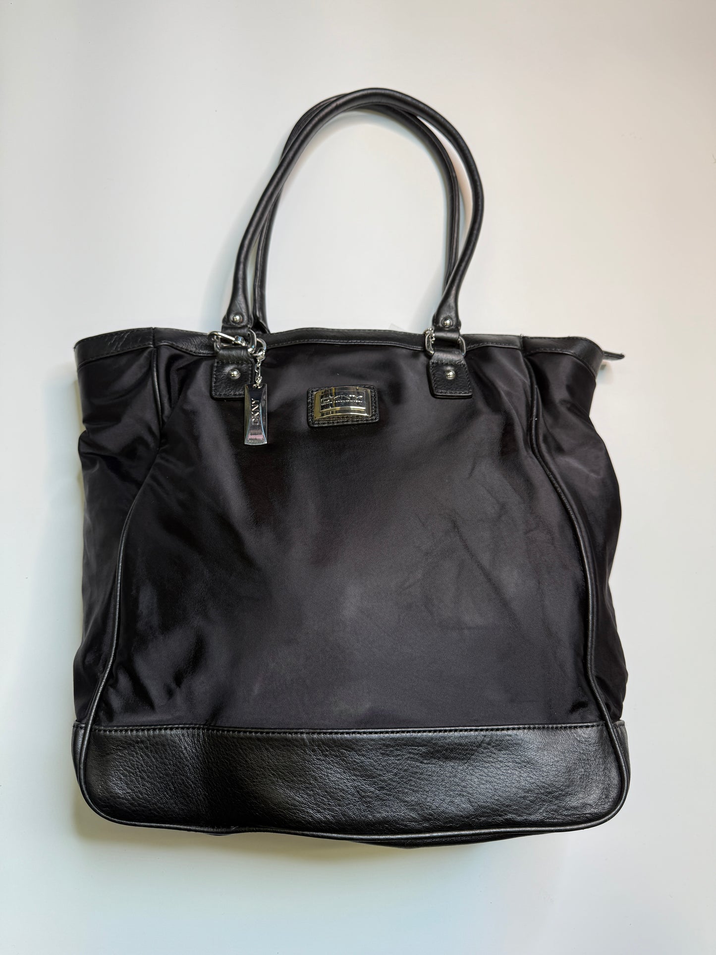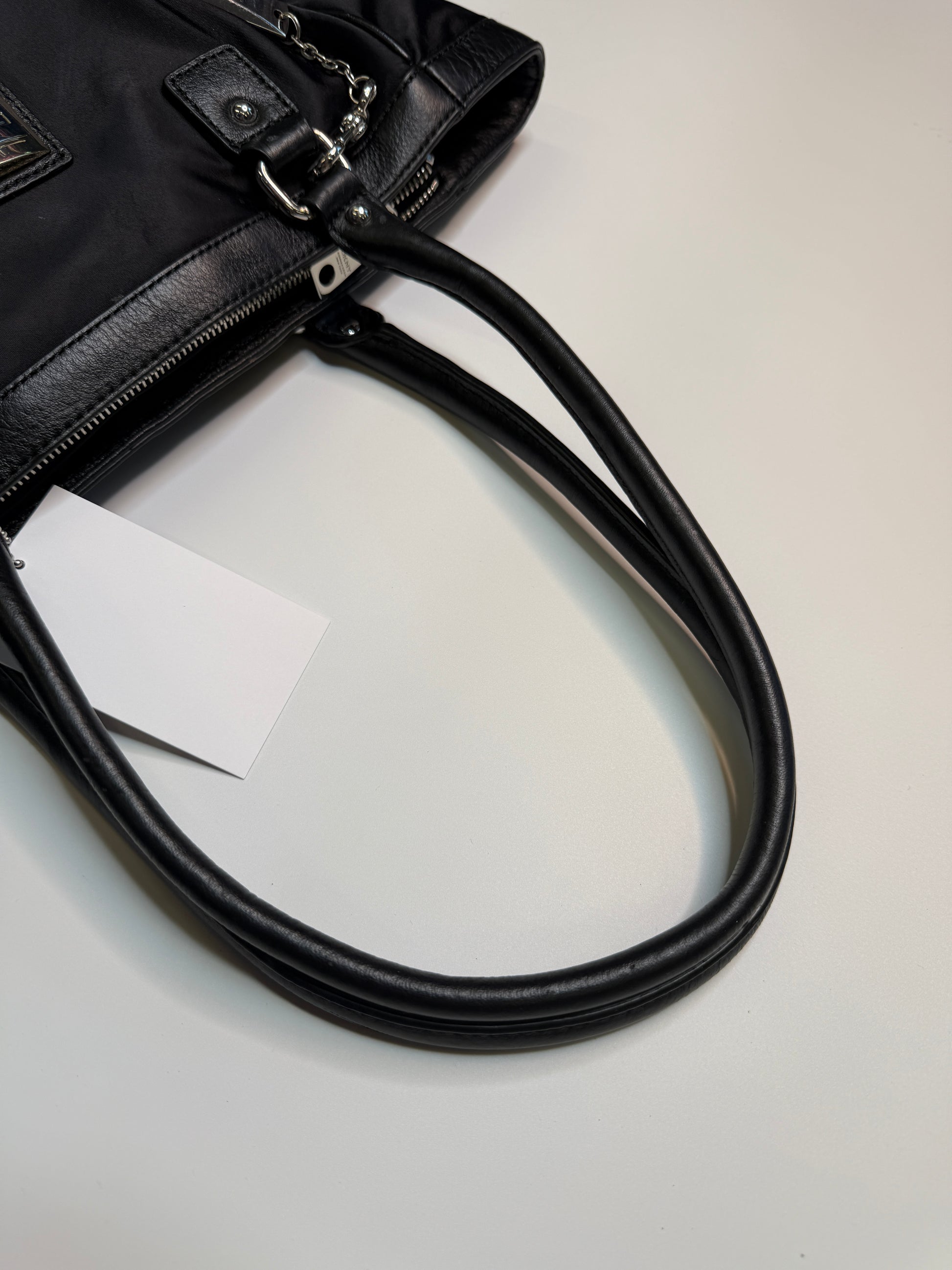 Amazing Bag from the brand DKNY. Big sized bag, perfect for school/uni with silver hardware. Nylon fabric with real leather parts.