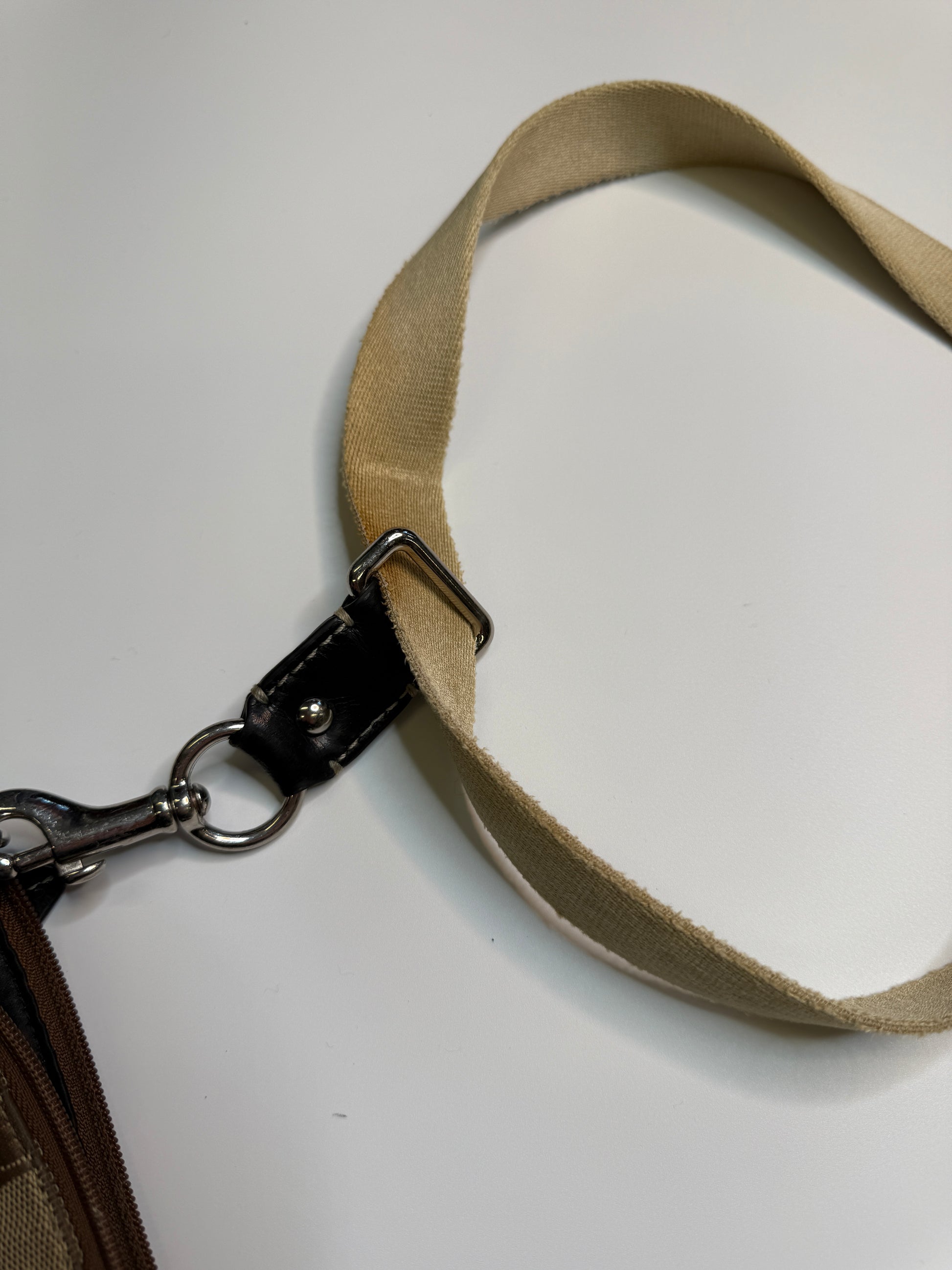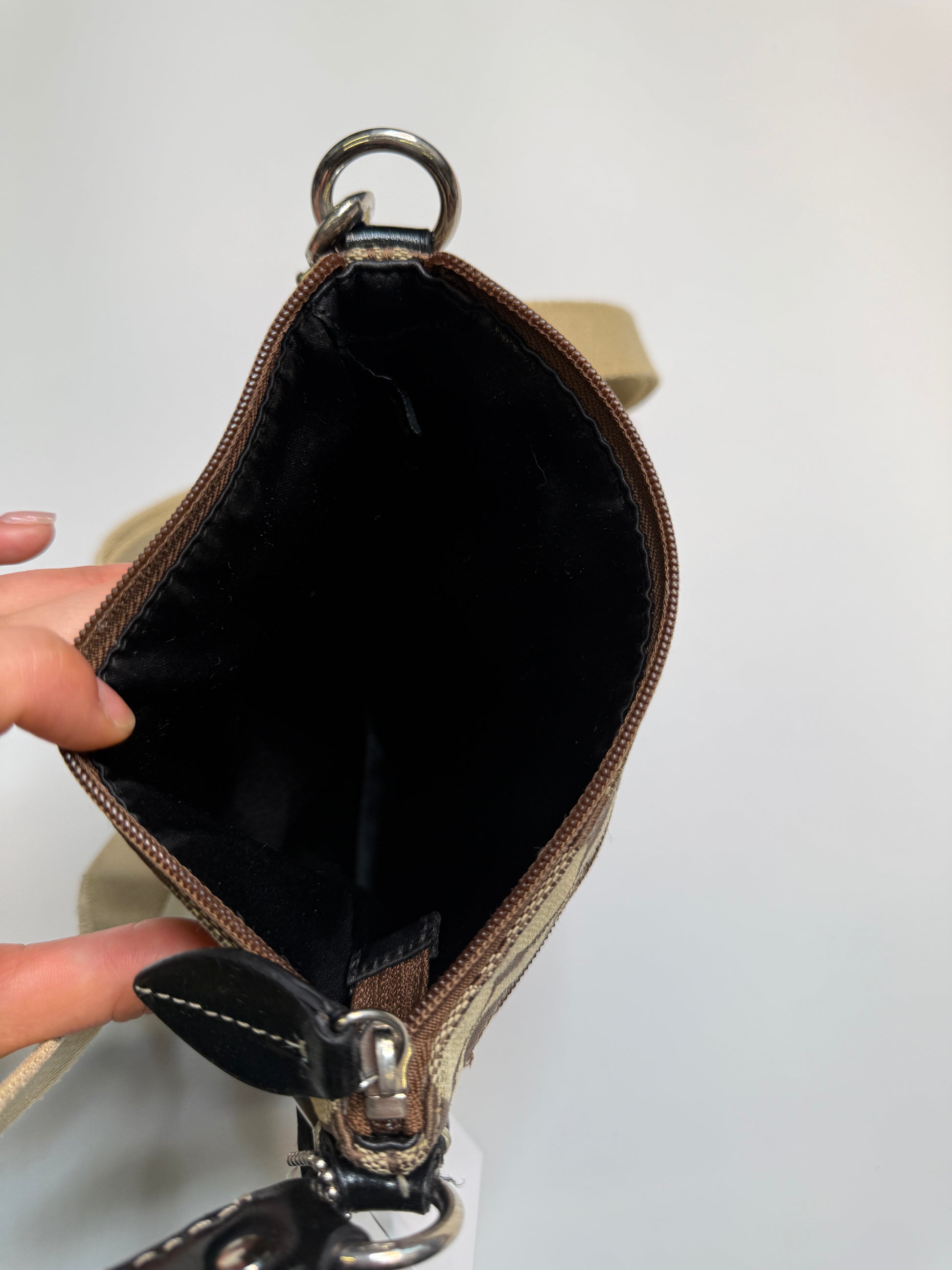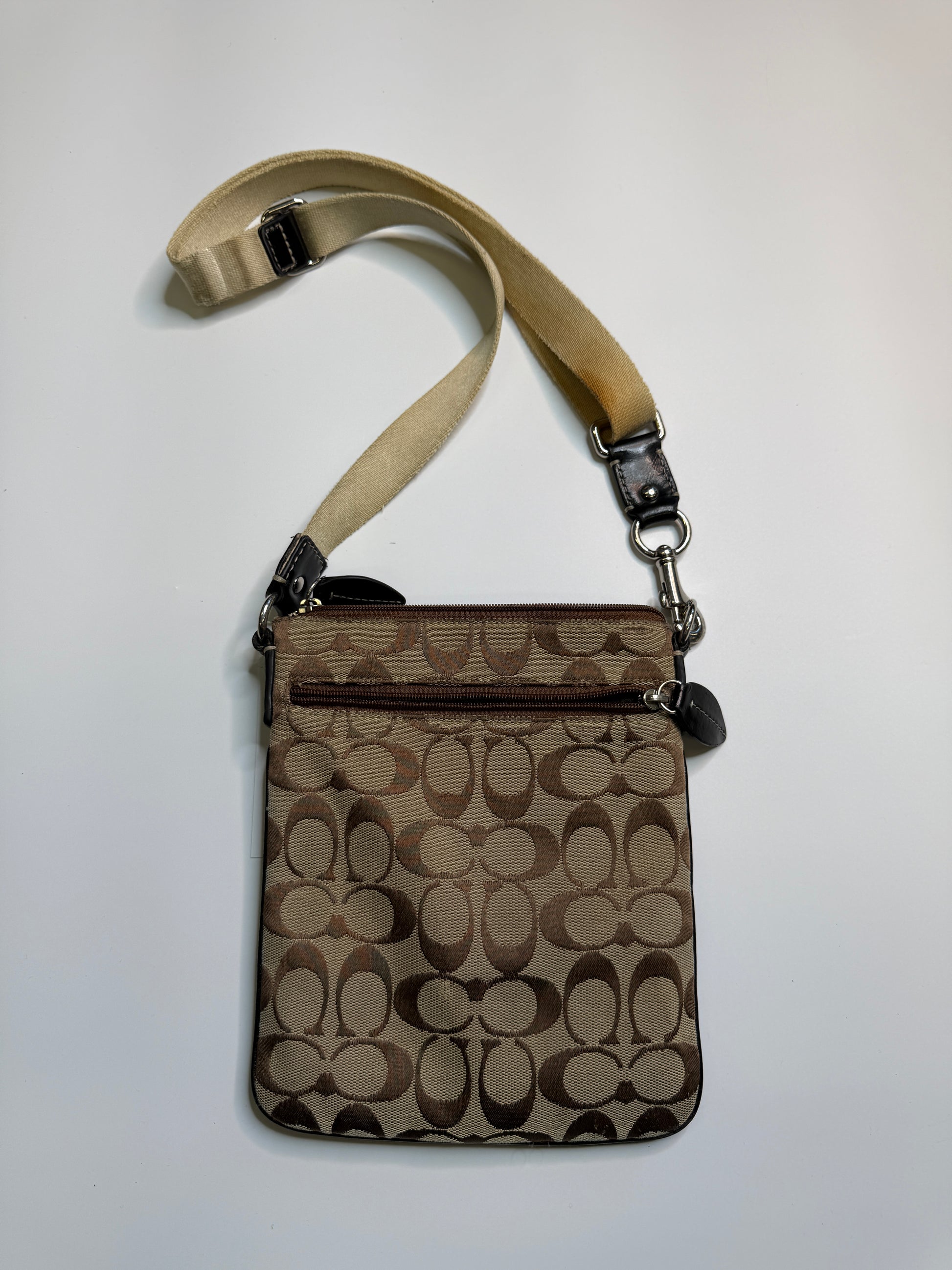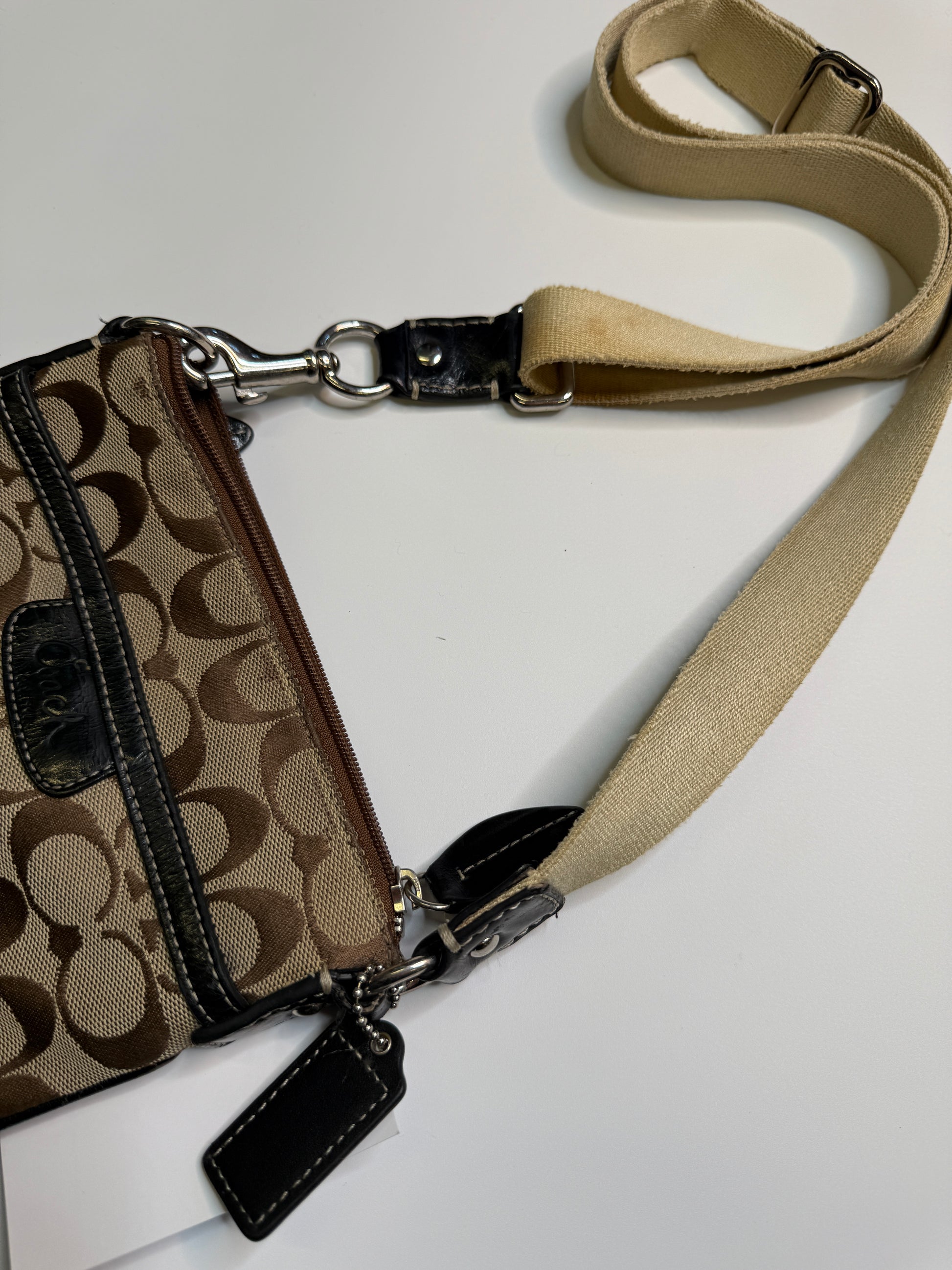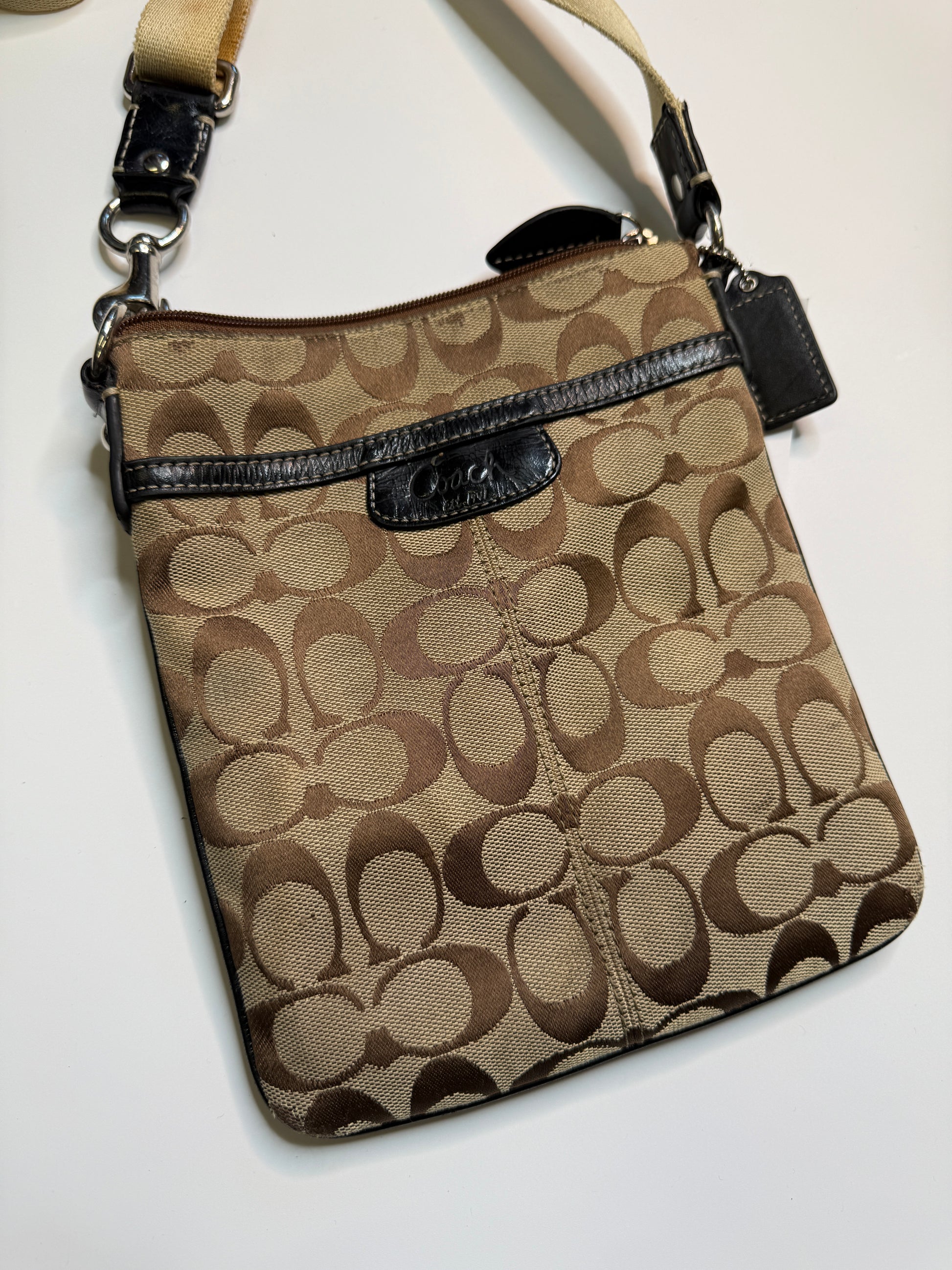 This Coach crossbody bag is my fav! Monogram Pattern with shiny black leather details. Perfect size for small trips! The belt is easily adjustable.