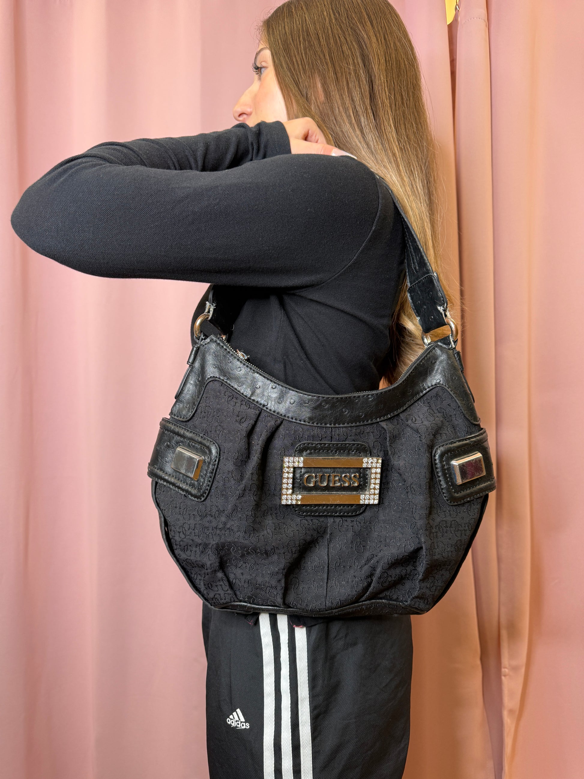 Cutest Guess Purse. Small sized handbag. Fits perfectly under the shoulder. In good condition. Cool design with silver hardware.