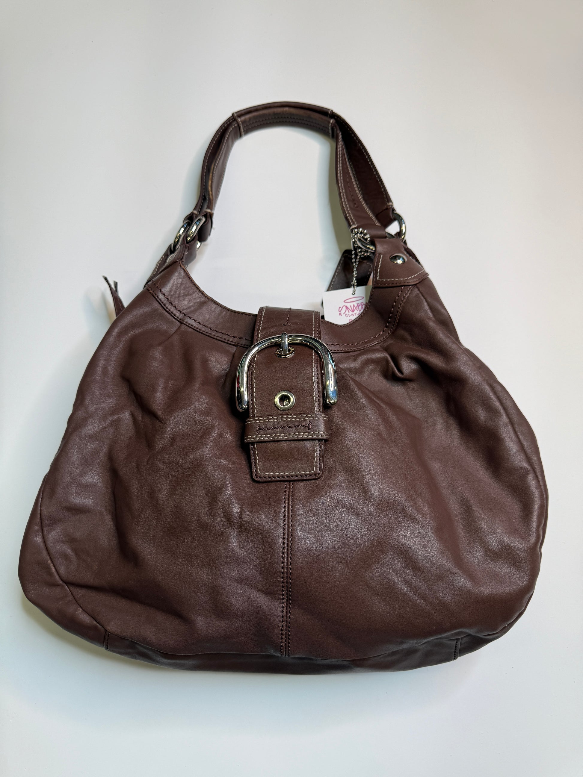 Amazing Real Leather bag from Coach. I love this scmhape of bag! Its so spacious & has 3 different compartments. Soft & long lasting leather. Silver hardware.