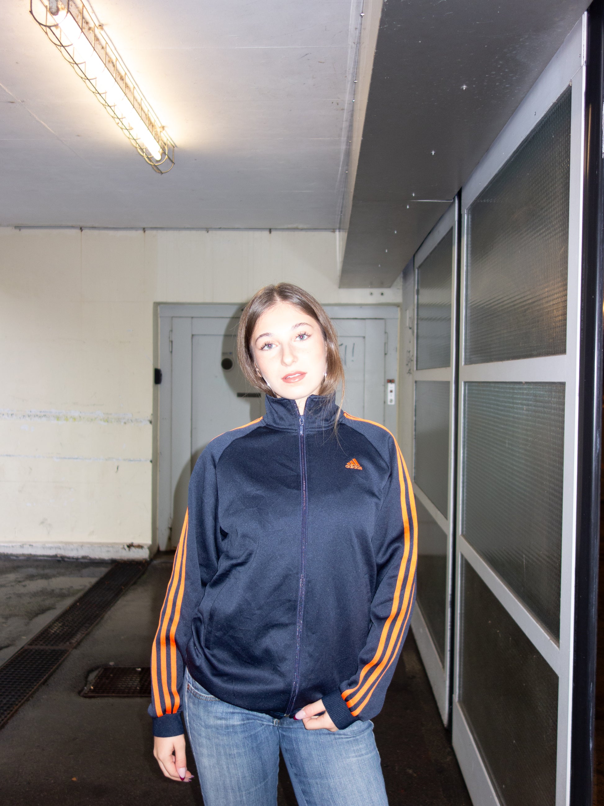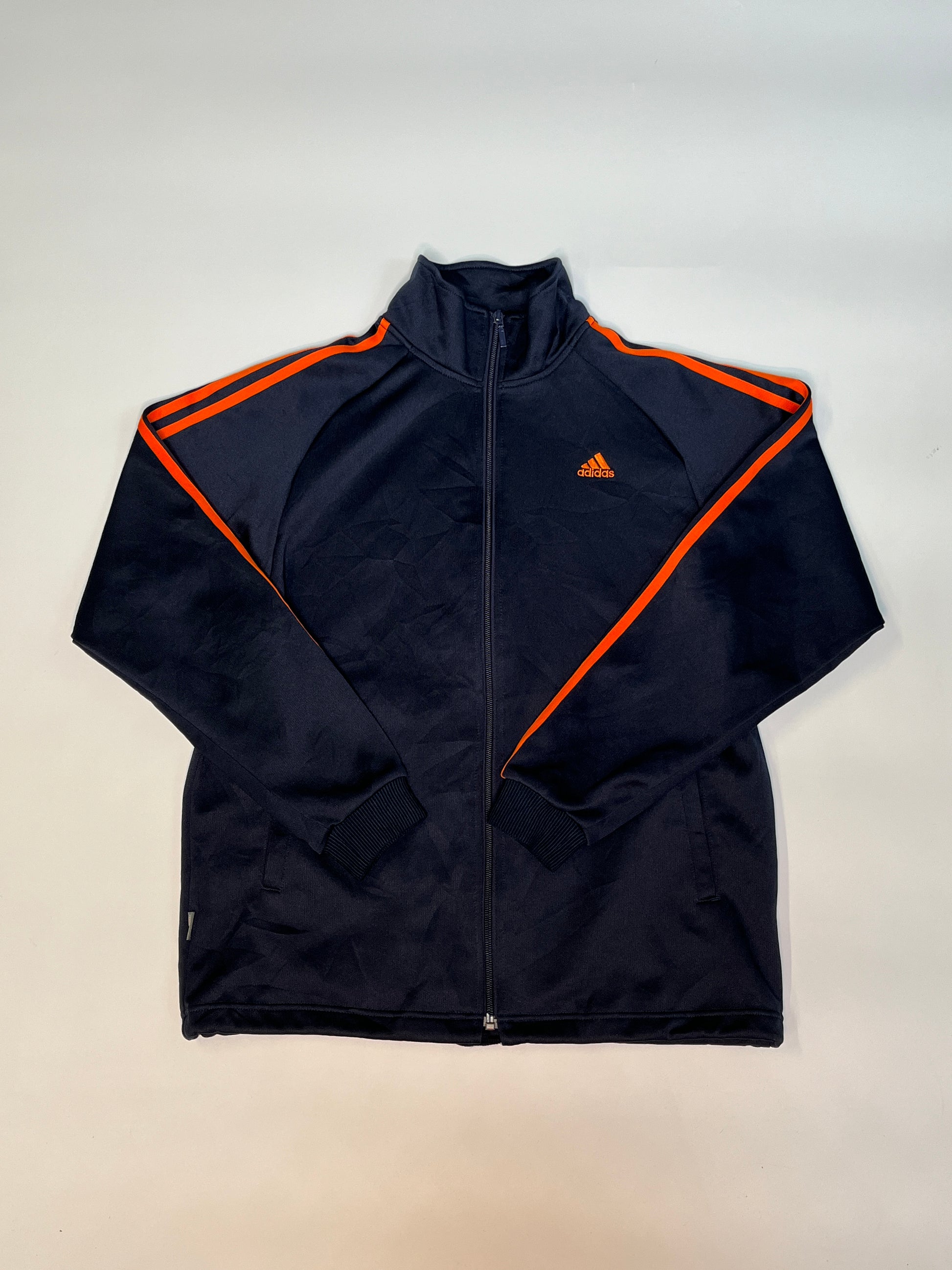 Amazing blue Adidas Jacket with orange details and logo! Amazing fit and good quality! Sporty, everyday zipper which is comfortable. Embroidered Logo.