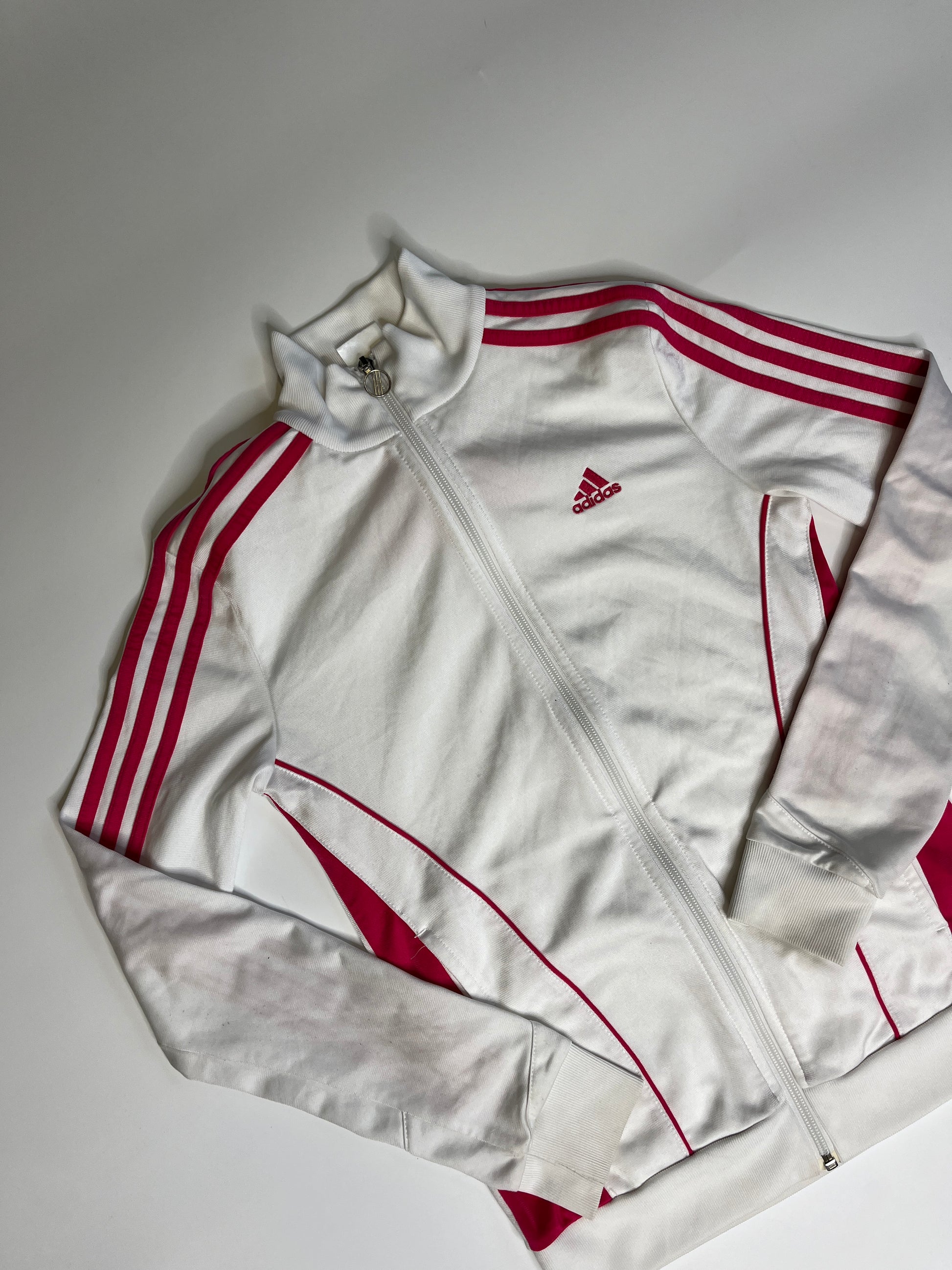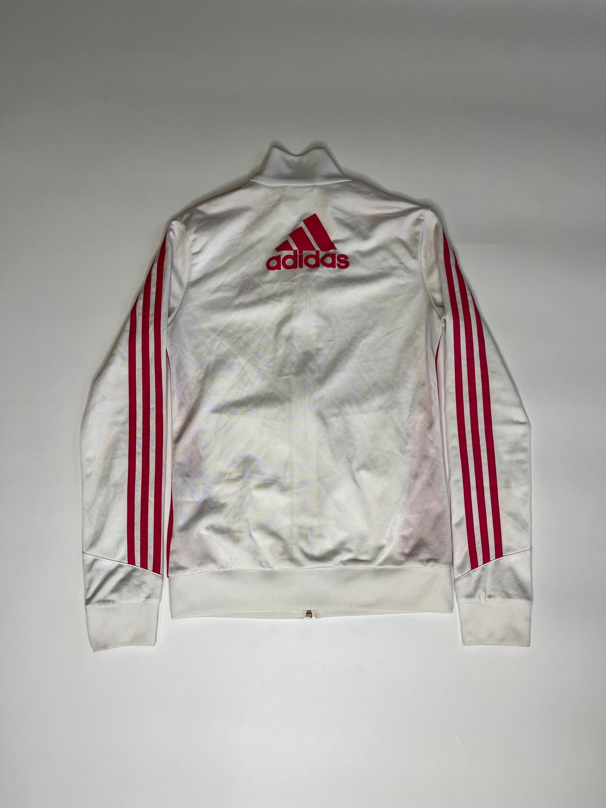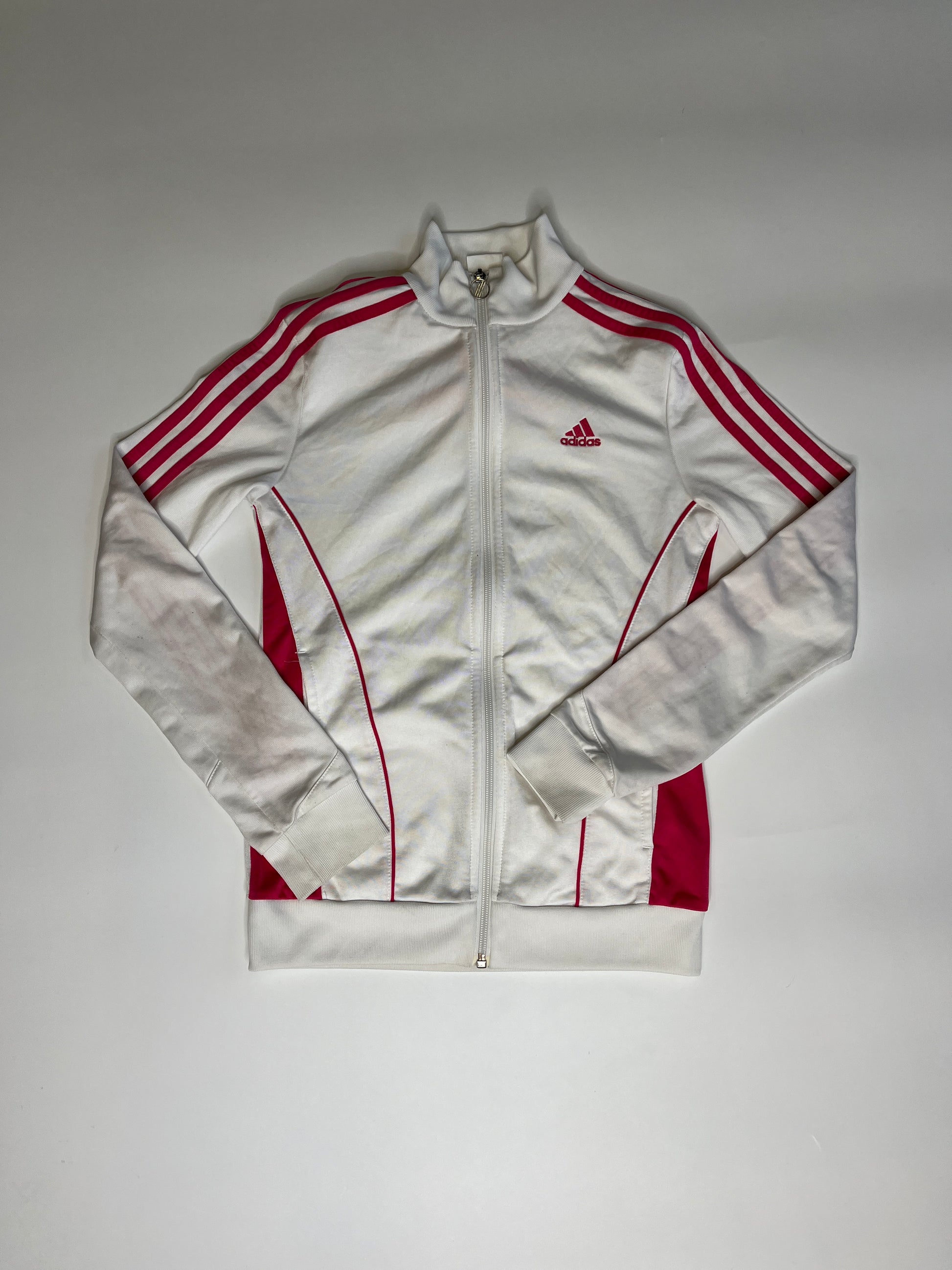 Amazing white Adidas Jacket! Amazing fit and good quality! Sporty, everyday zipper which is comfortable. Embroidered Logo.