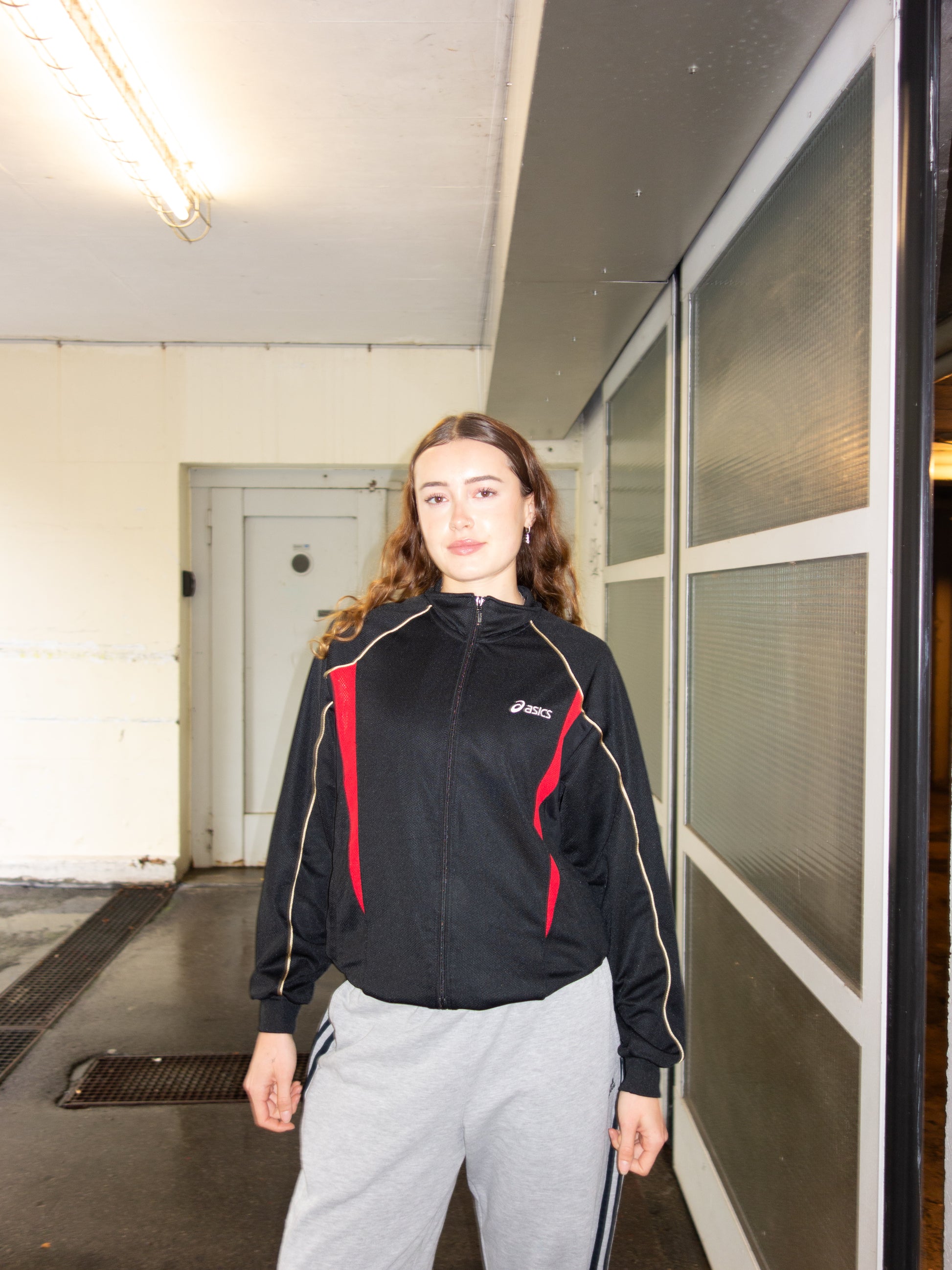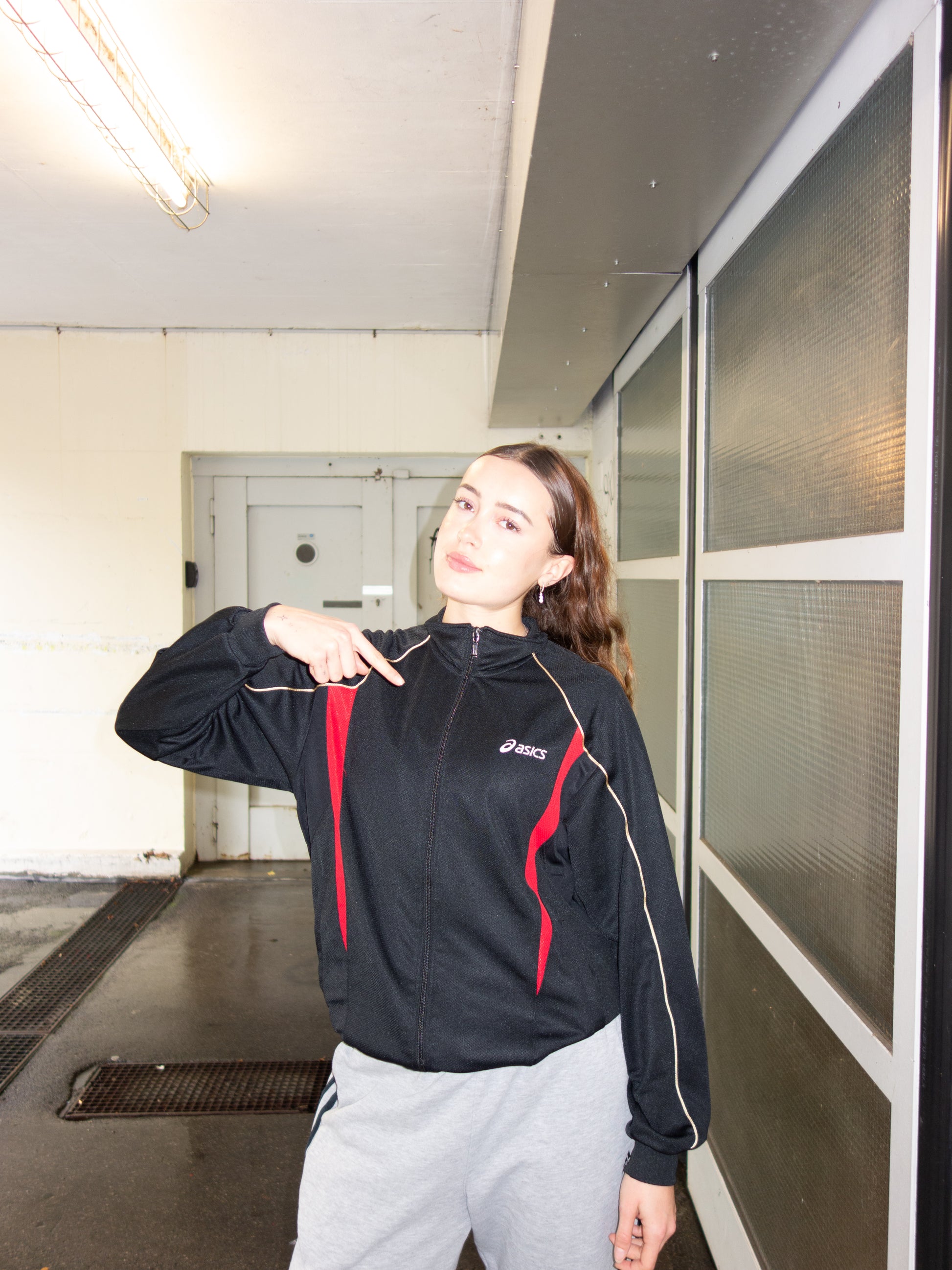 Amazing black Asics Zipper with red & gold details. Amazing fit and good quality! Really unique piece. Sporty, everyday zipper. Embroidered Asics Logo.