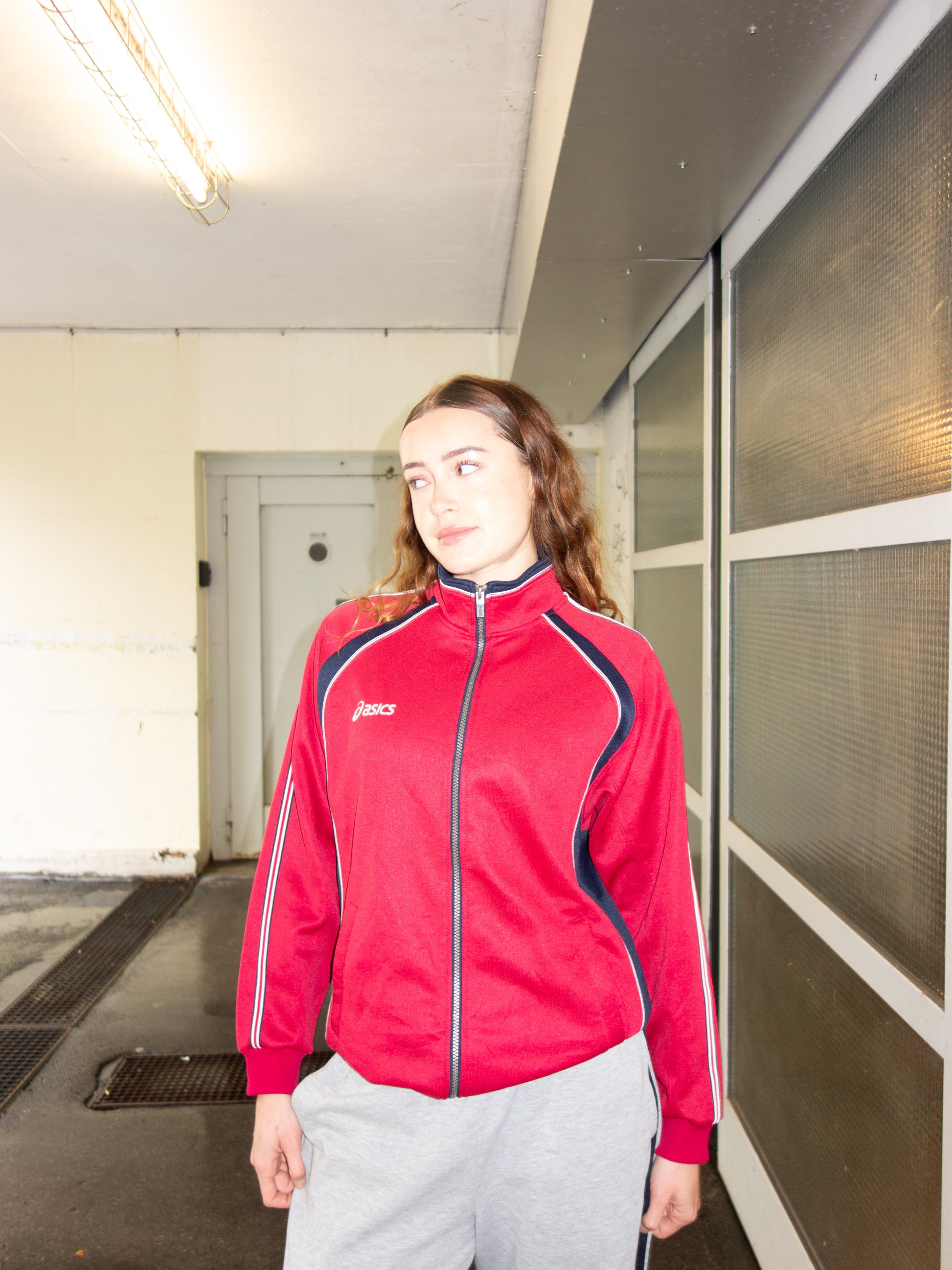 Amazing red Asics Zipper with dark blue details. Amazing fit and good quality! Really unique piece. Sporty and cute zipper. Embroidered Asics Logo.