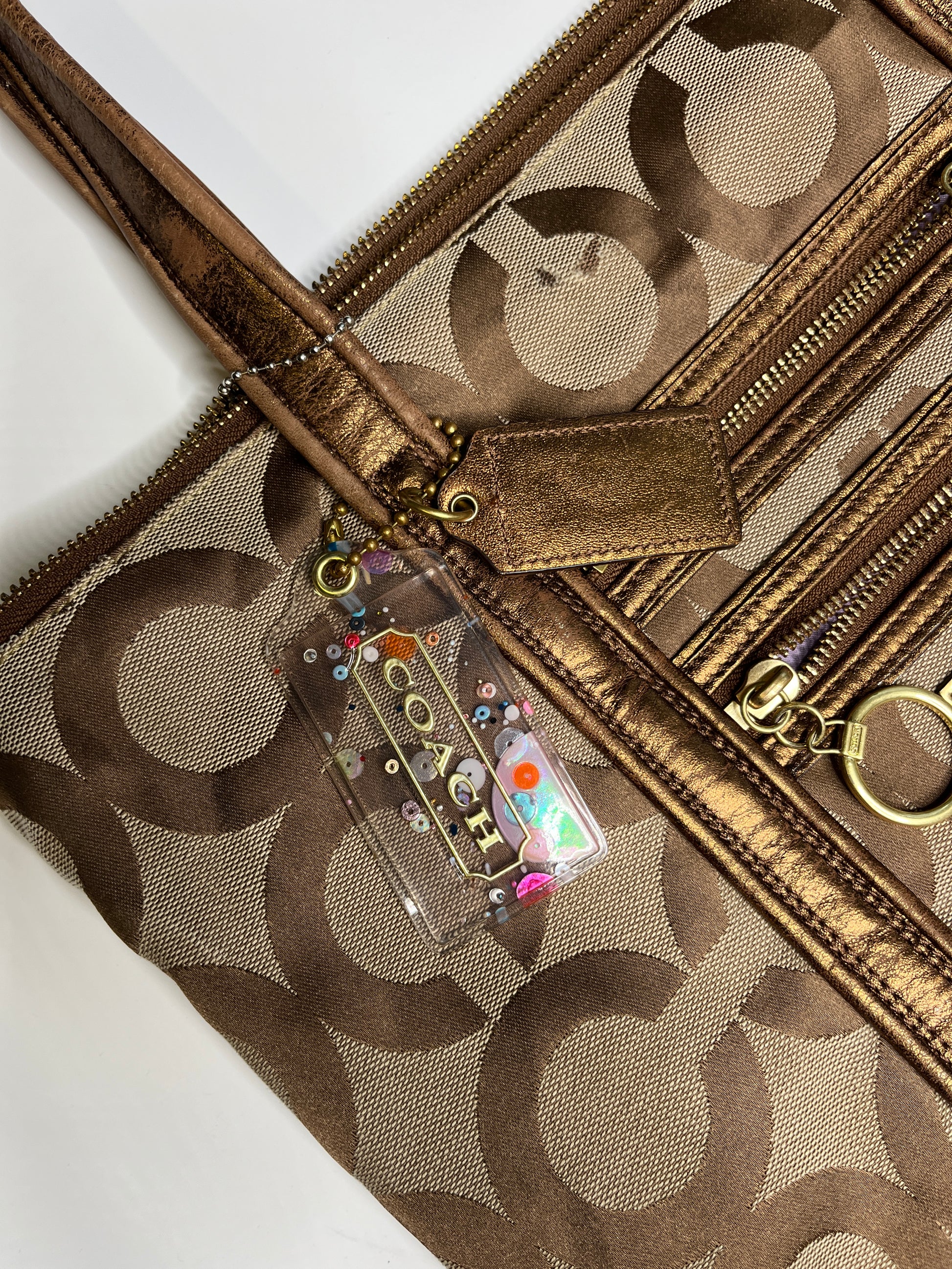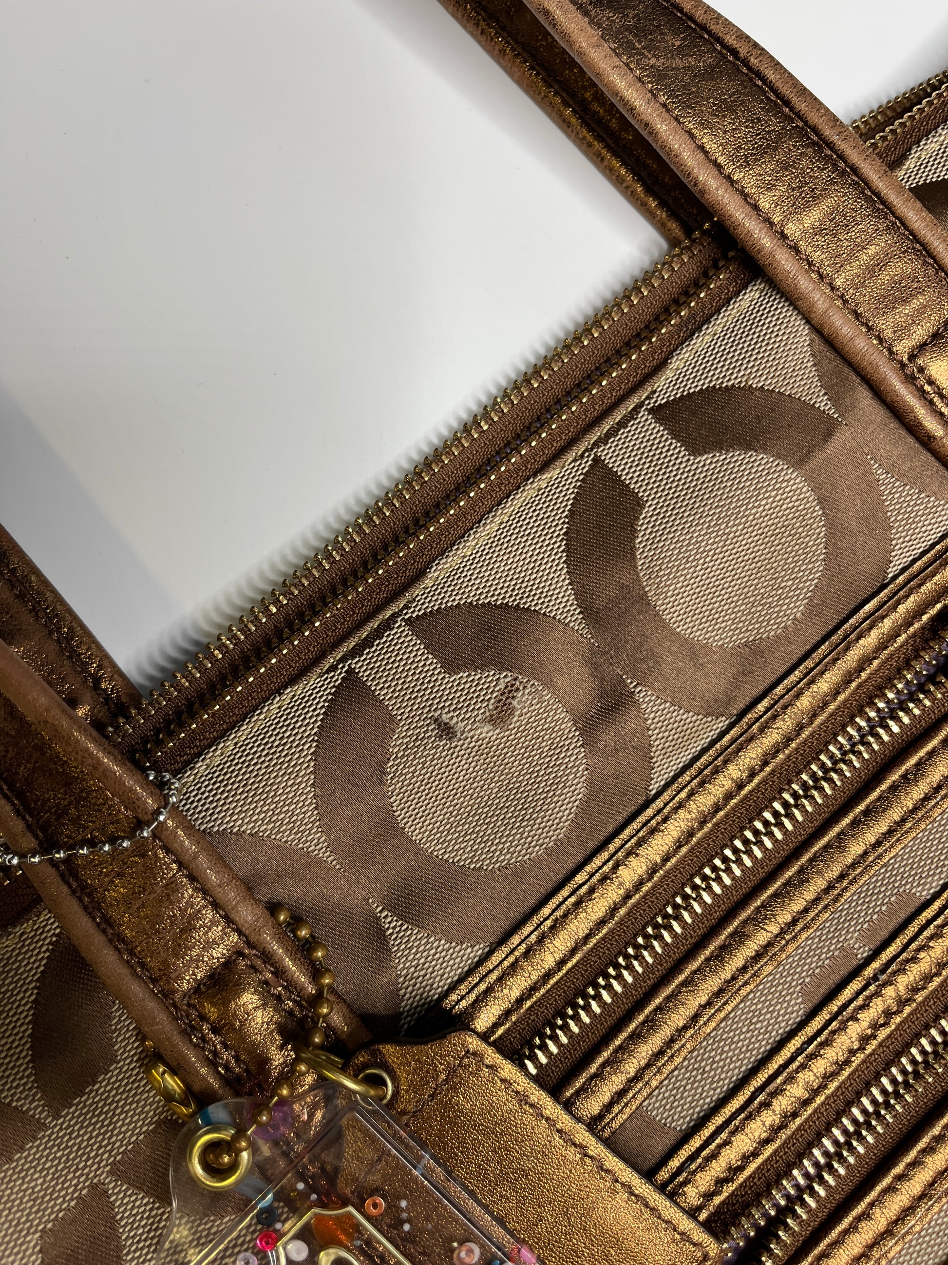 Medium sized bag from Coach. Cutest bag in Monogram Style. Very nice bag and in good condition. Has enough space to carry the most important things. Gold heardware. Your laptop may fit