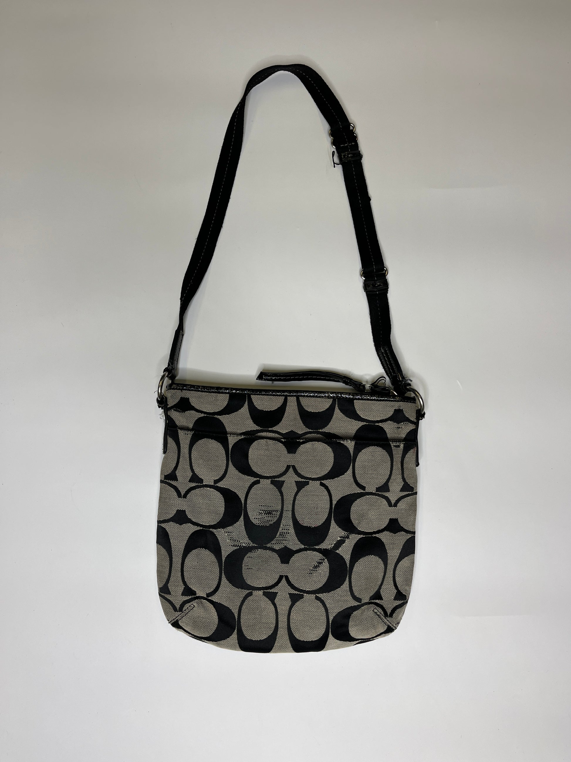 Medium sized bag from Coach! Cutest bag in Monogram Style. Very nice bag. Has enough space to carry the most important things. Silver heardware.