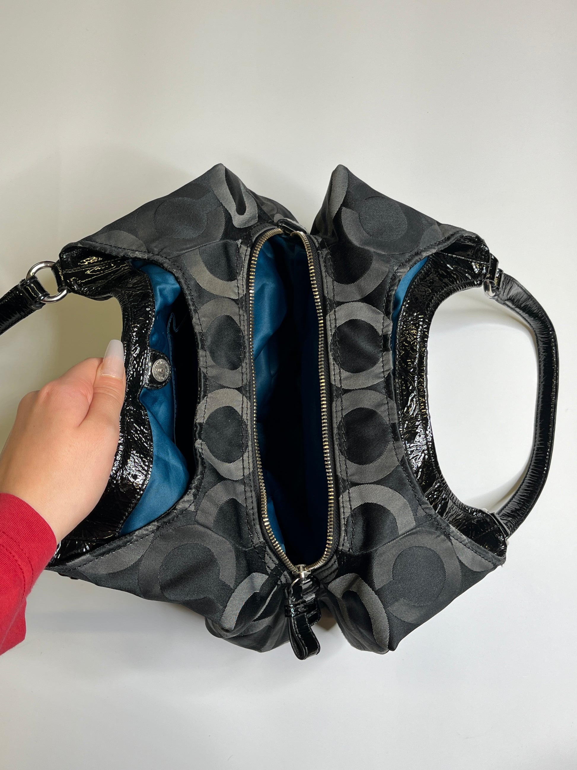 Medium sized bag from Coach! Cutest bag in Monogram Style. Very nice bag with beautiful navy interior design. Has enough space to carry the most important things. Silver heardware.