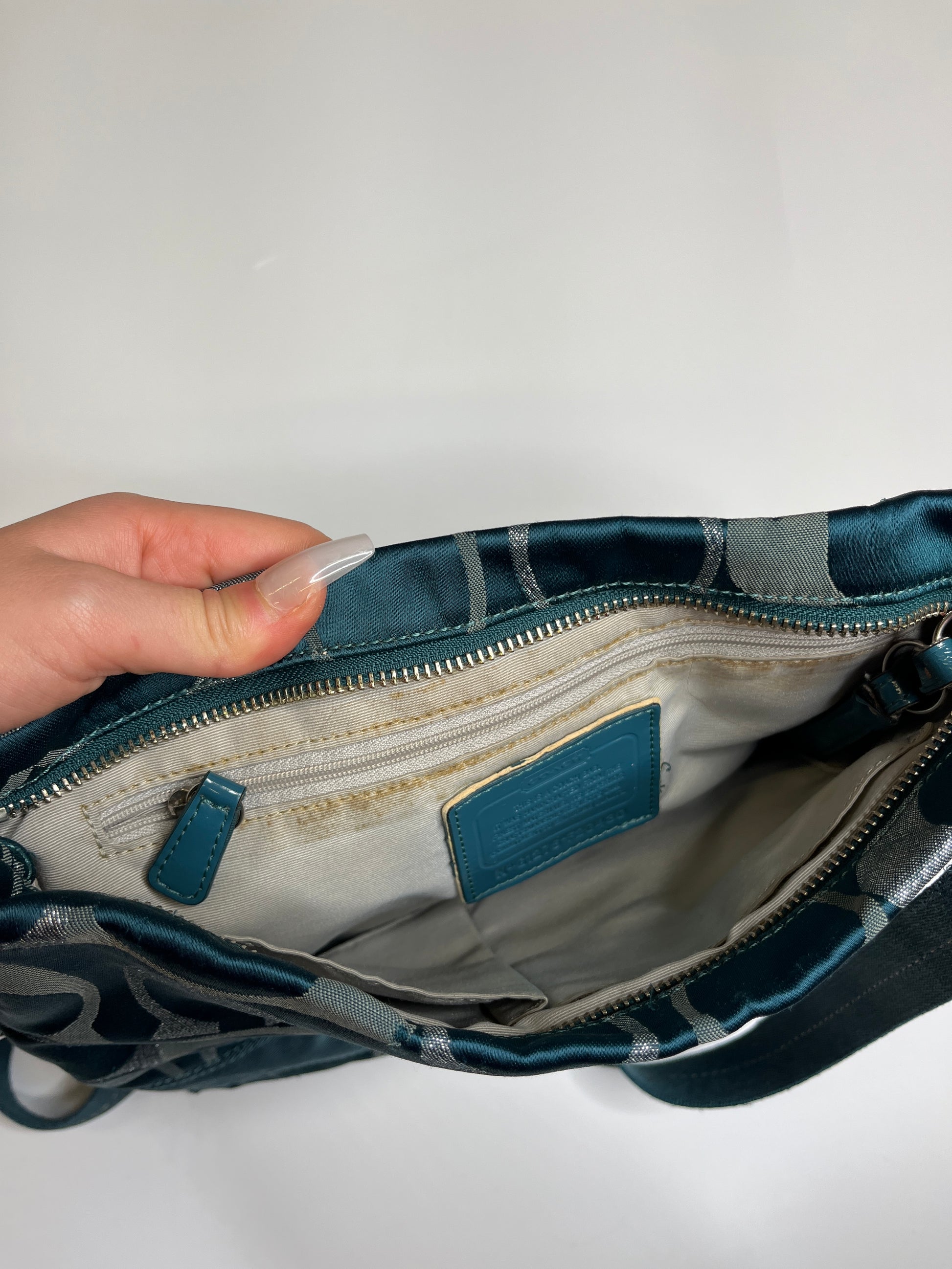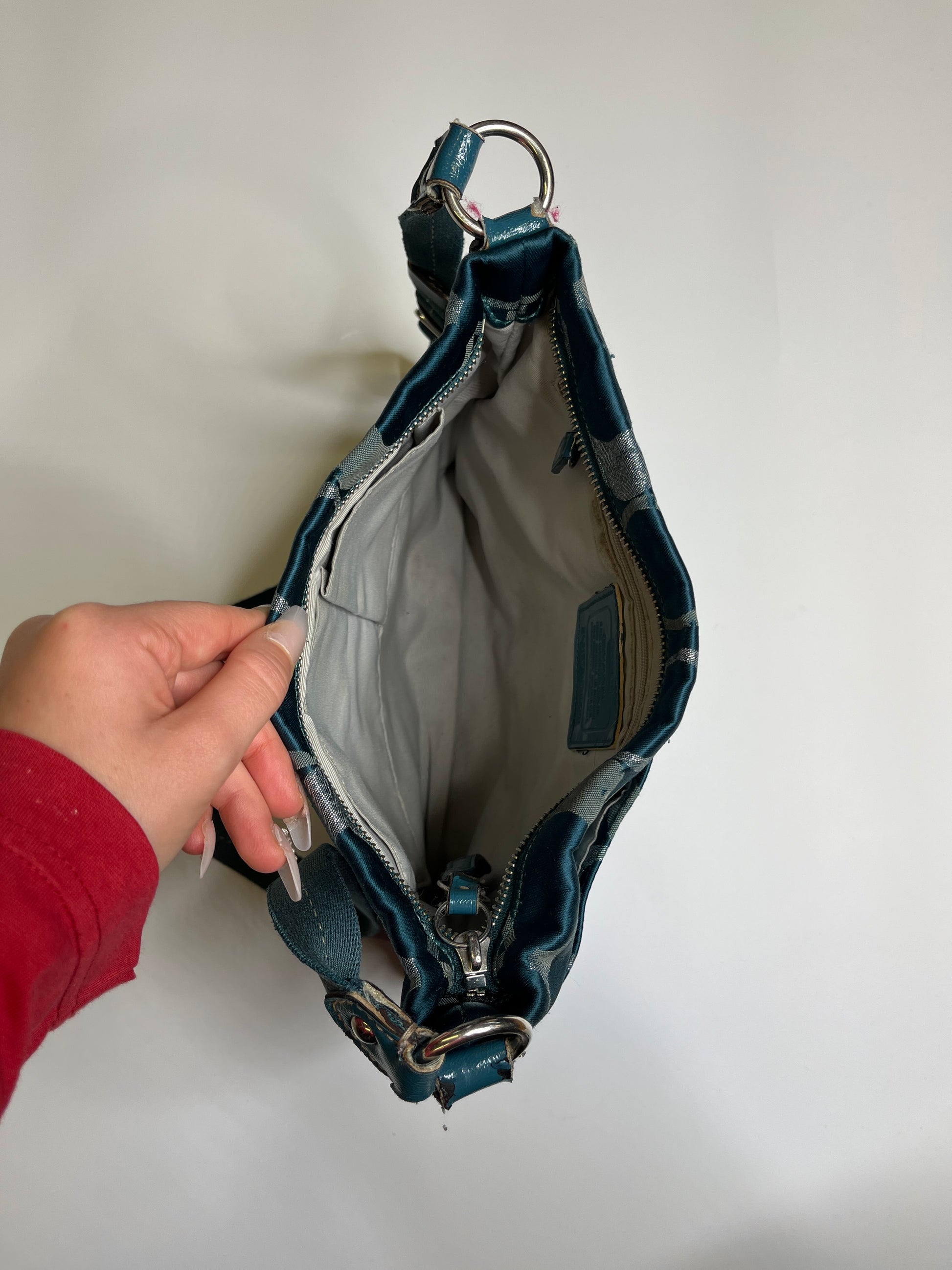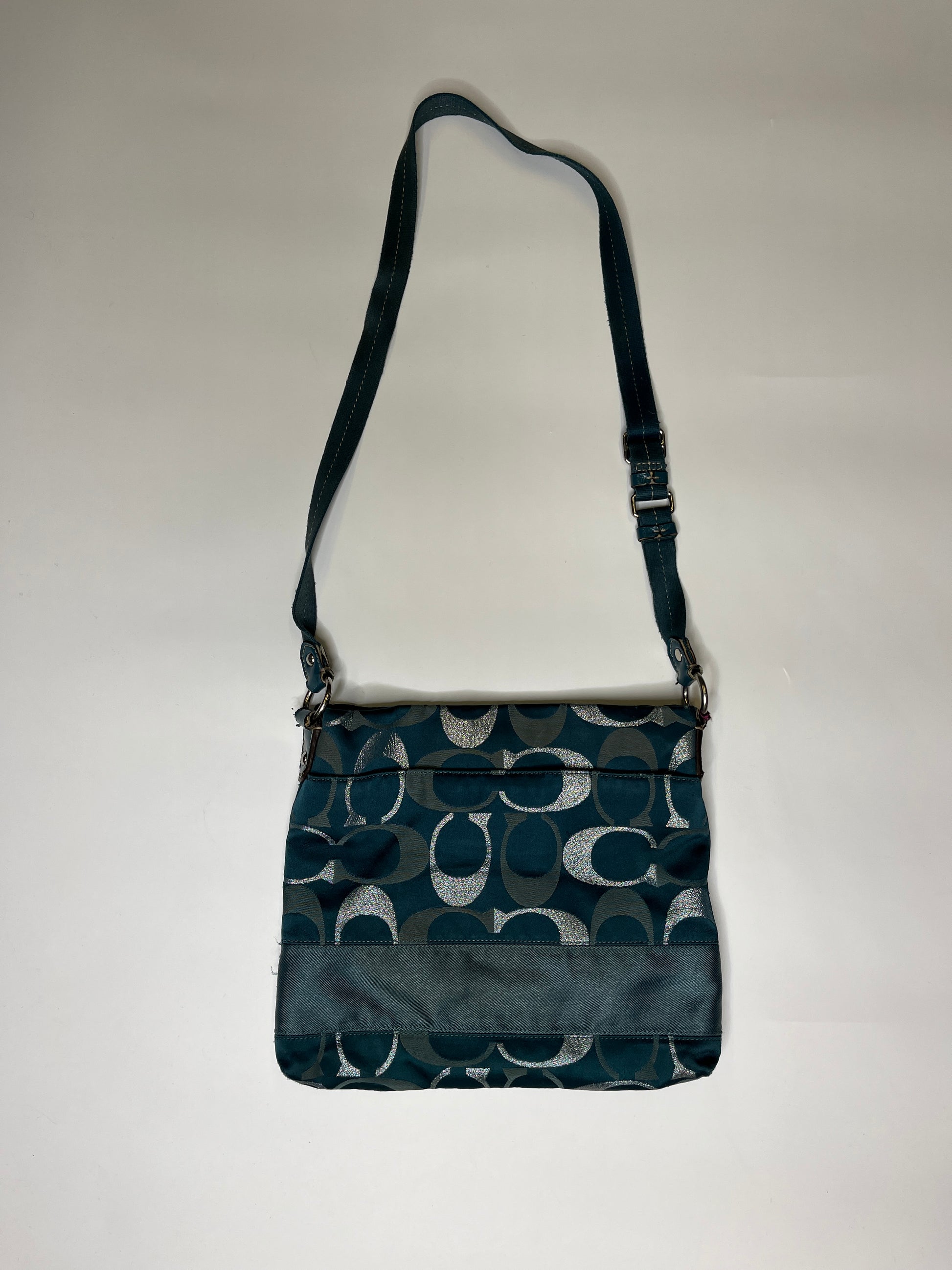 Medium sized crossbody bag from Coach! Cutest bag in Monogram Style. Very nice bag and beautiful colour. Has enough space to carry the most important things. Silver heardware.