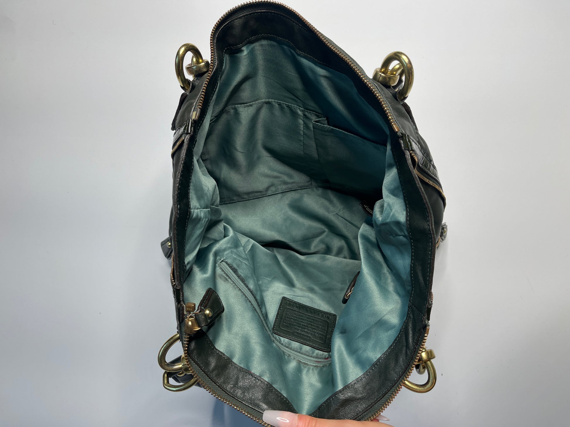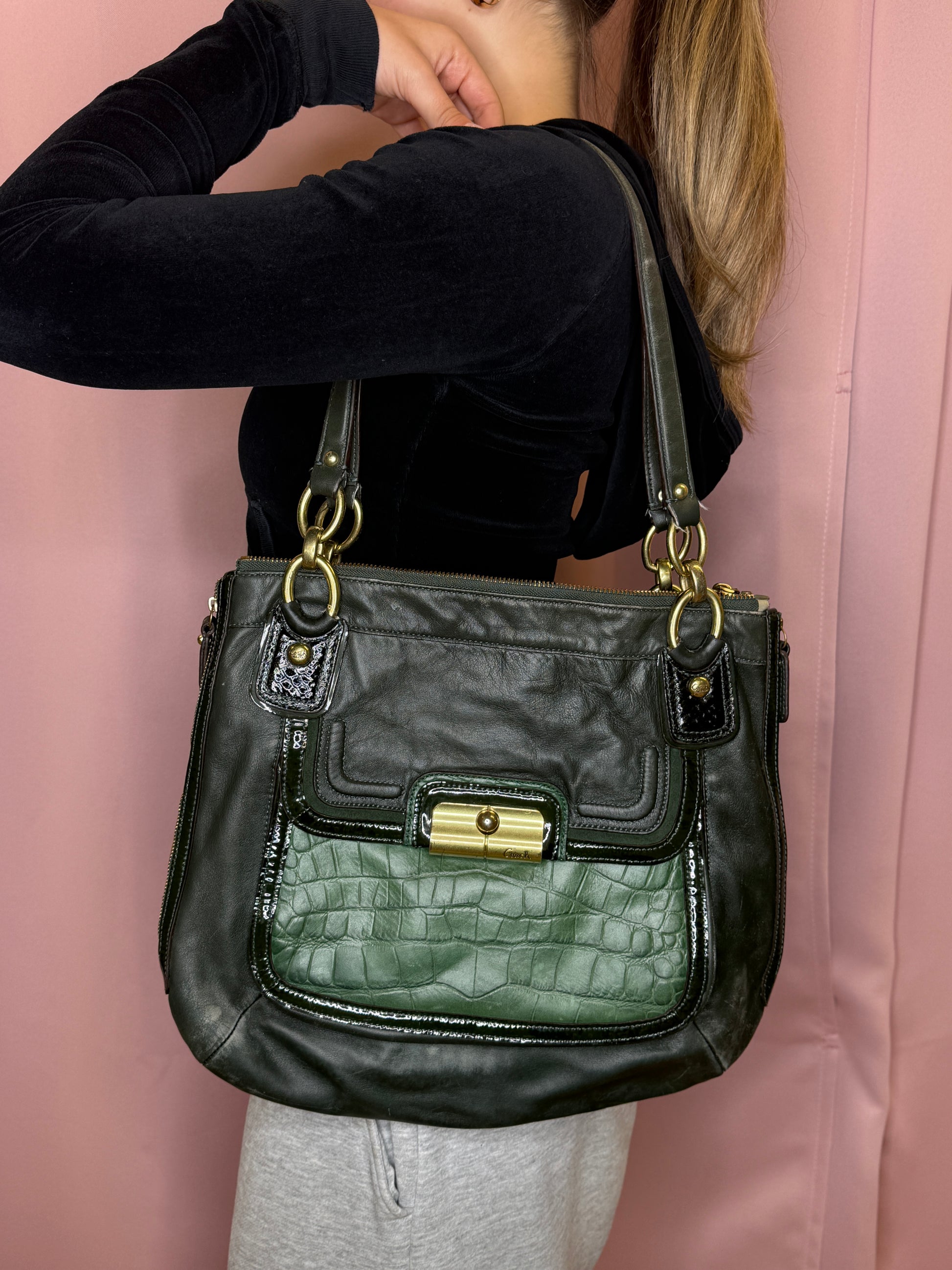 Medium sized bag from Coach. Cutest bag with green snake design. Very nice bag with special details. Gold Hardware. Has enough space to carry the most important things. Beautiful colourway! Real, longlasting leather.