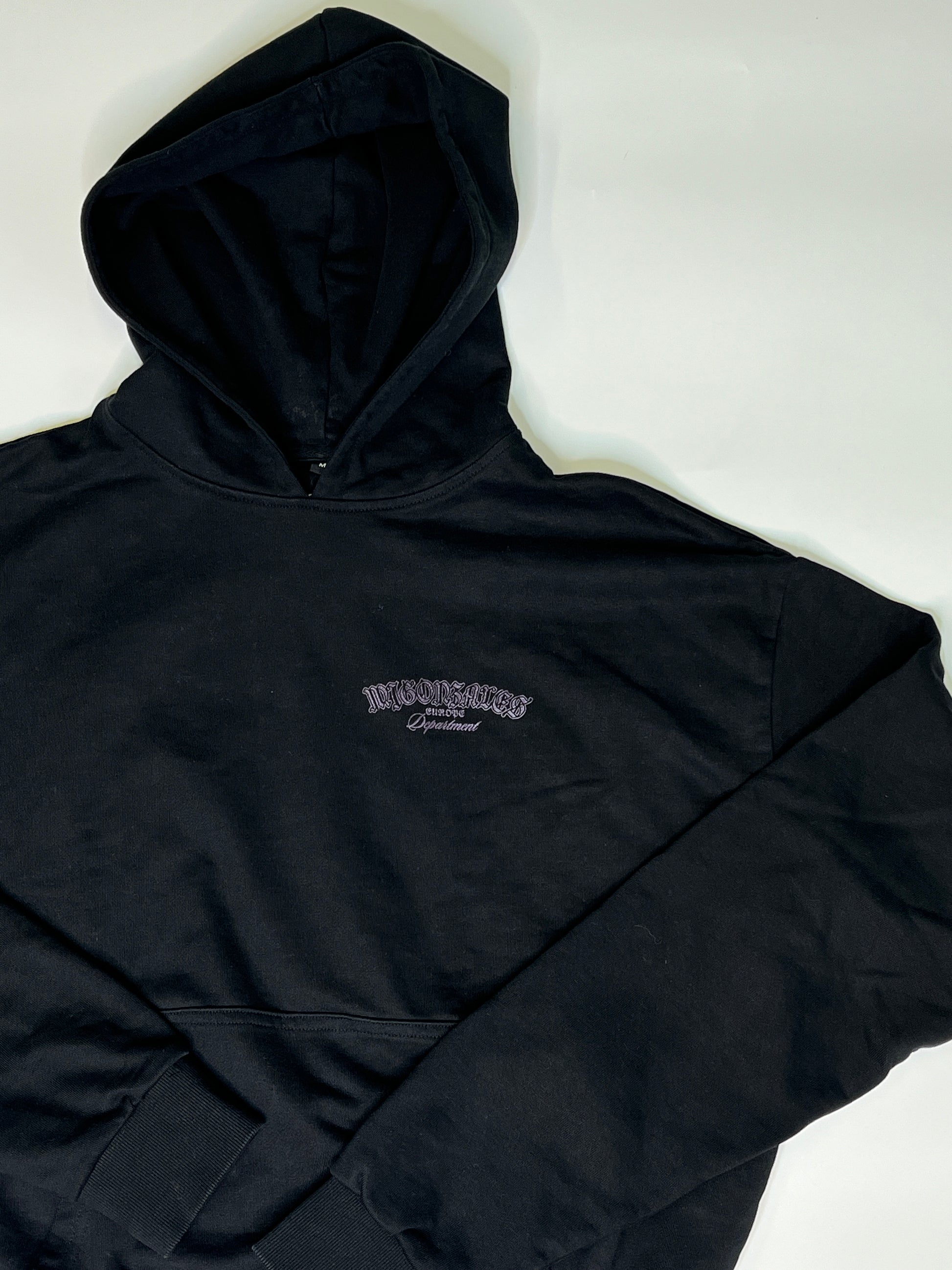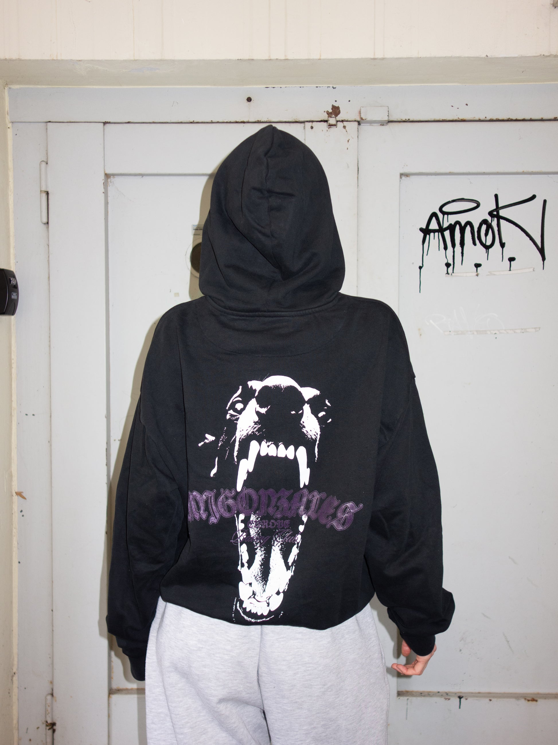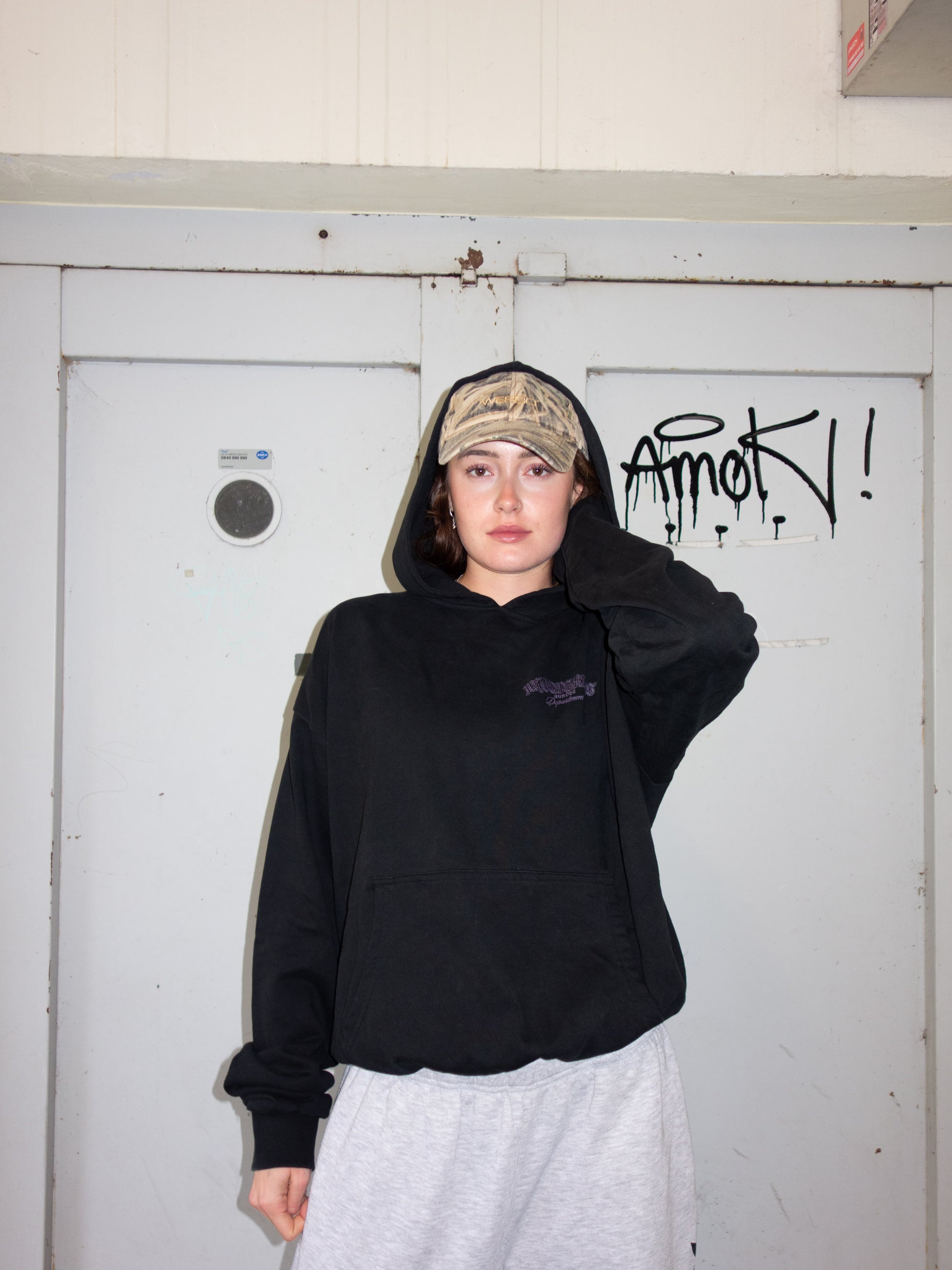 Really cool black MYGONZALES Hoodie with purple font on the front. Has a comfy material and has good quality. Really cool and unique design on the back!