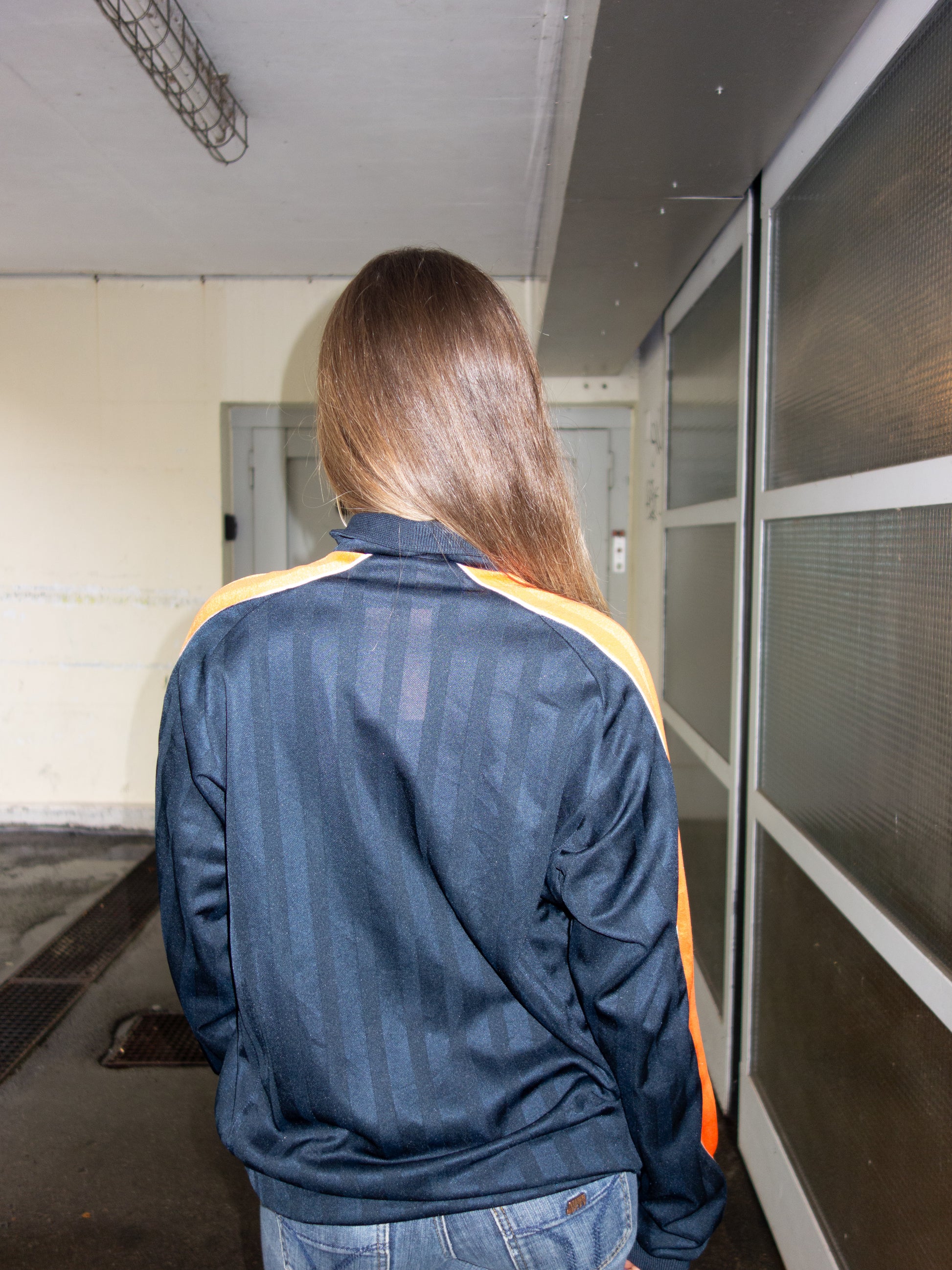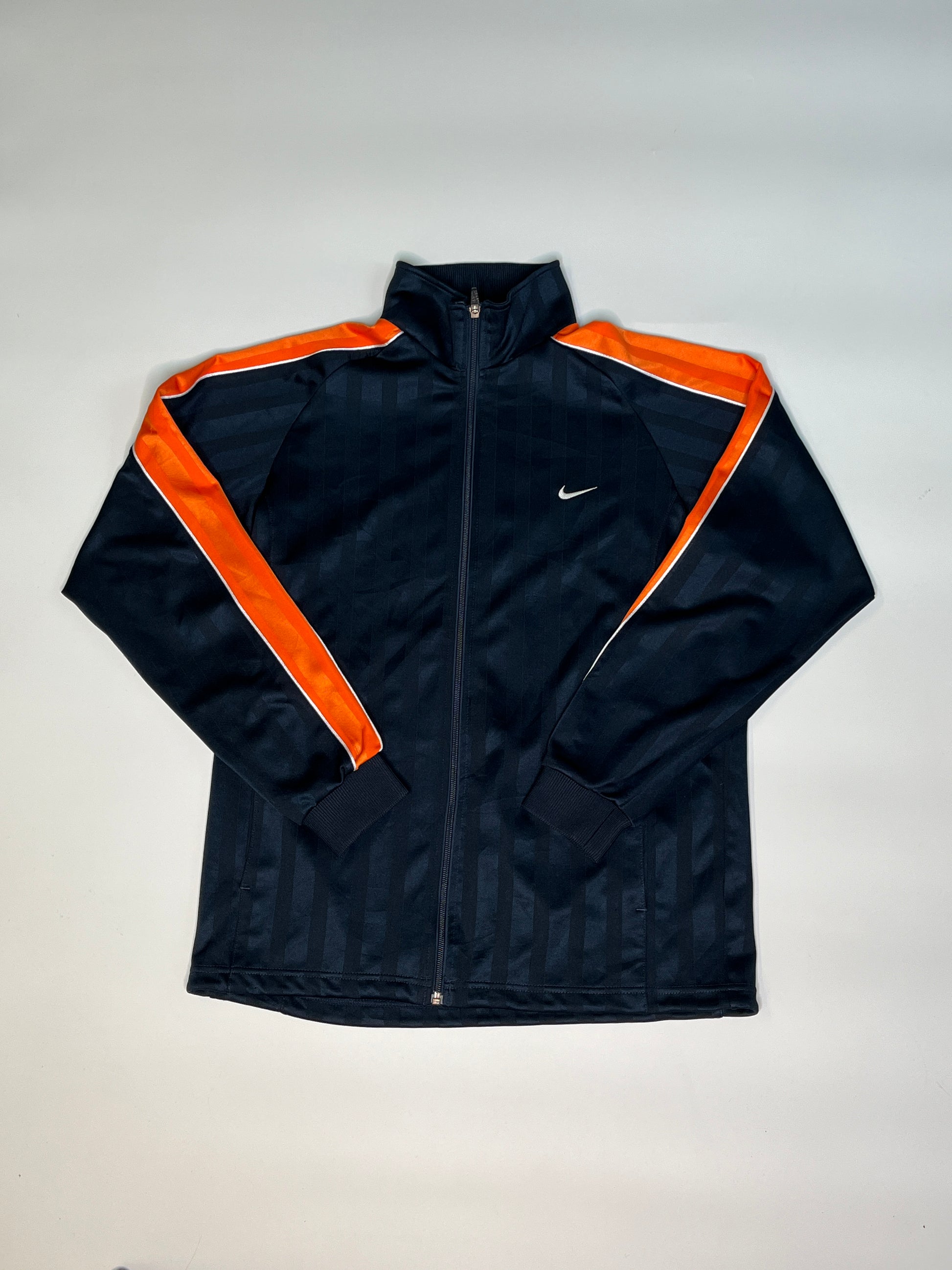 Amazing dark blue Nike Zipper from the 2000s! Has really cool orange stripes on the sleeves. Amazing fit and good quality! Really unique piece. Sporty and cute zipper. Embroidered nike Logo