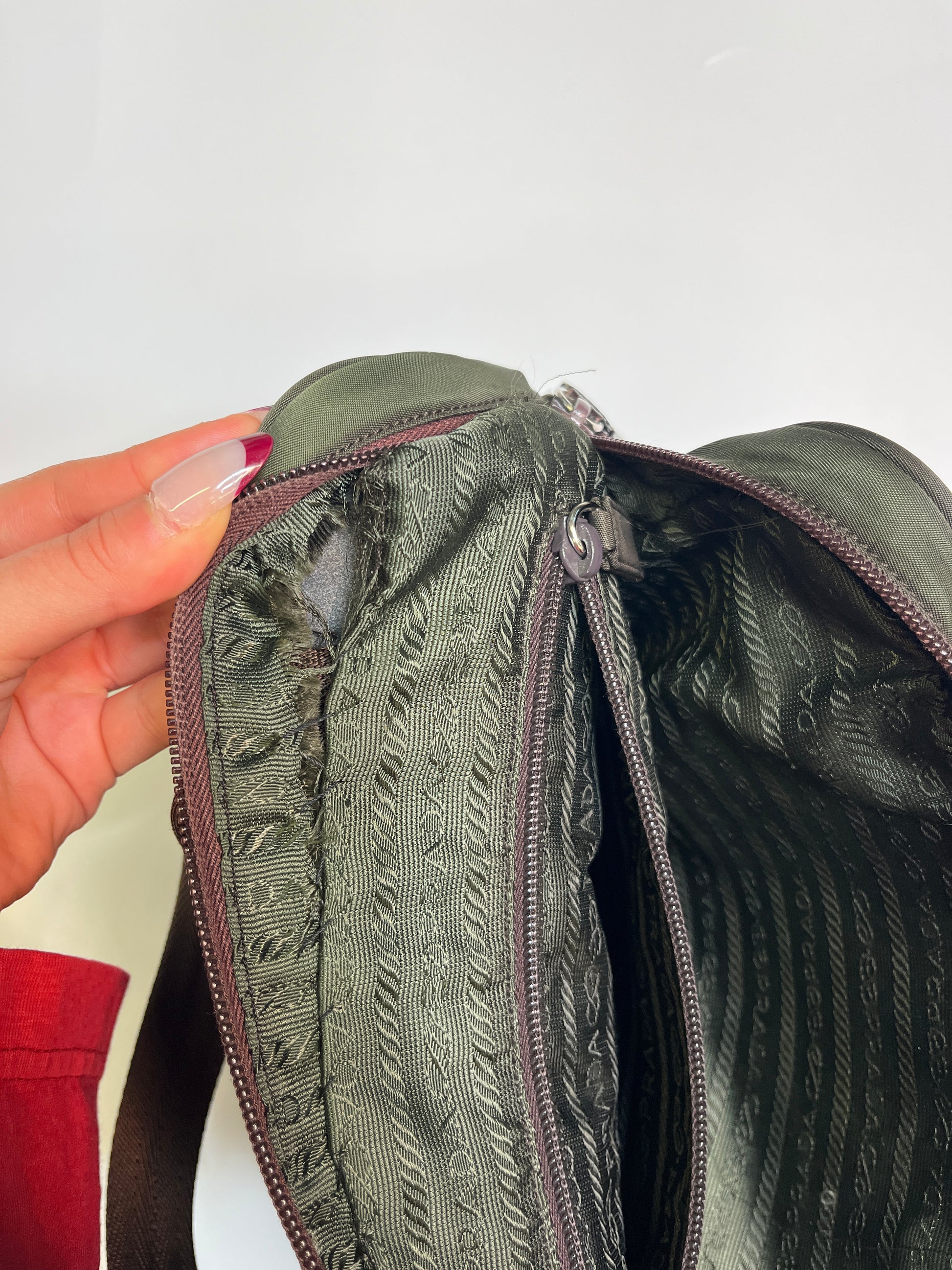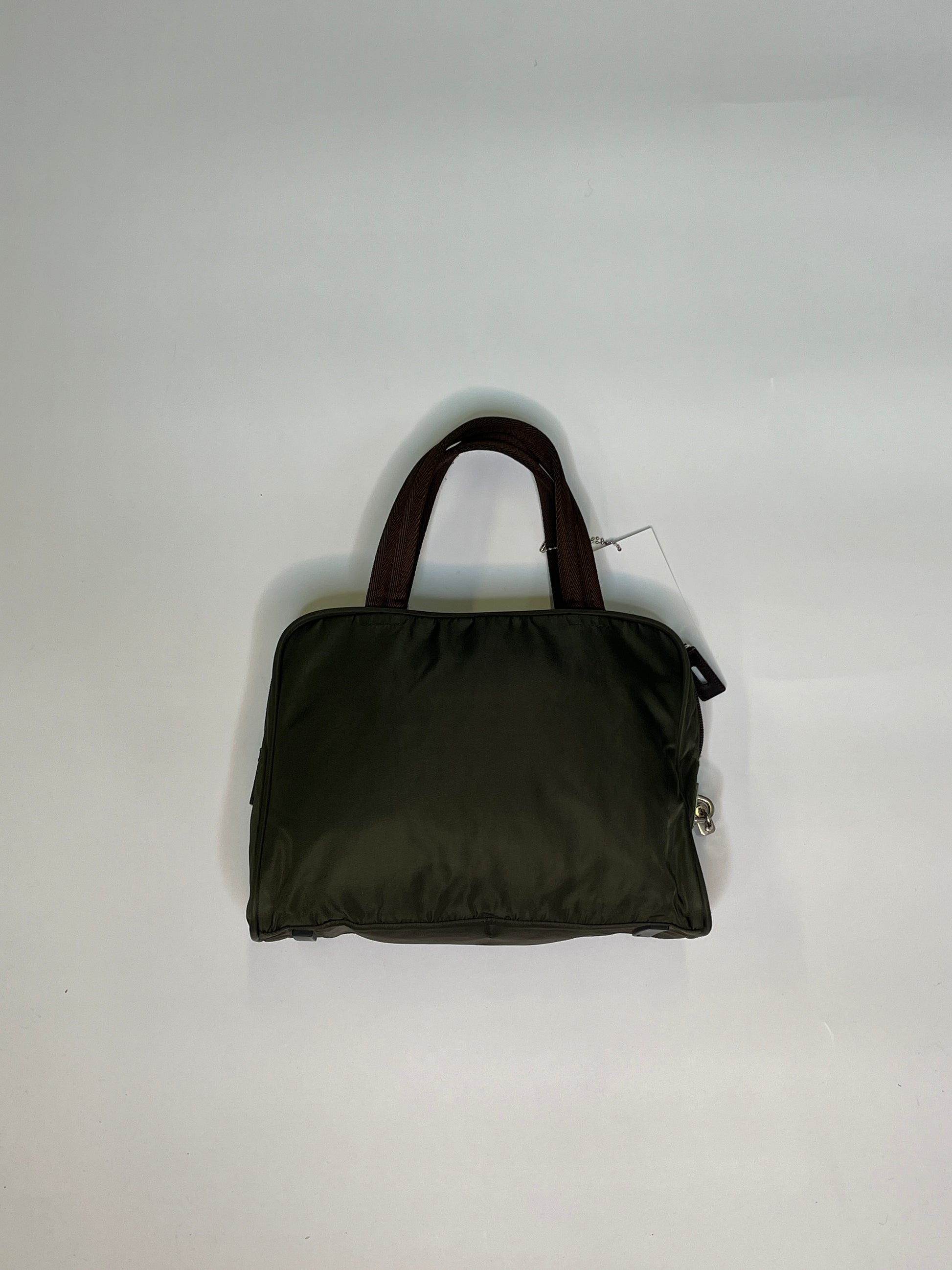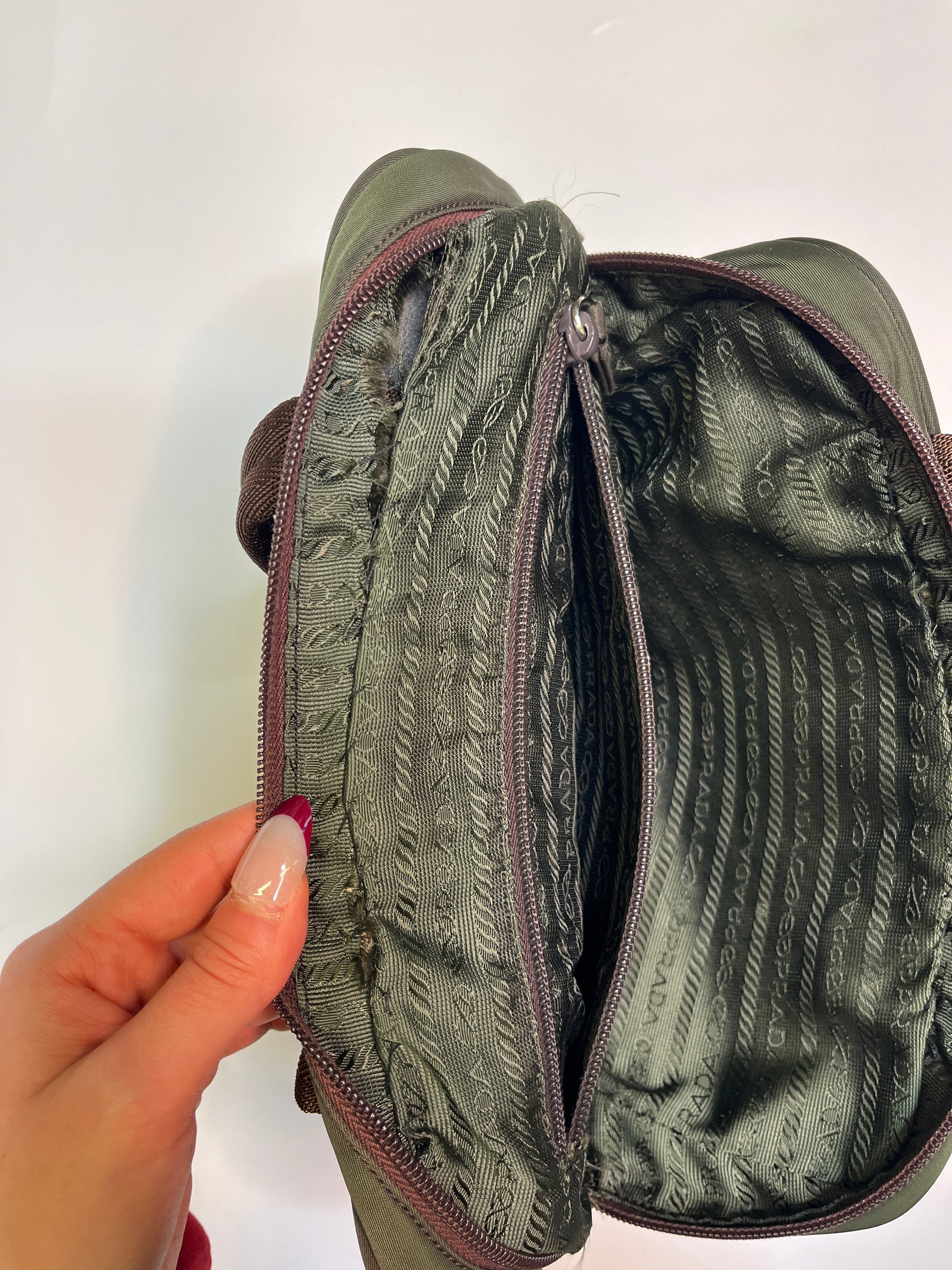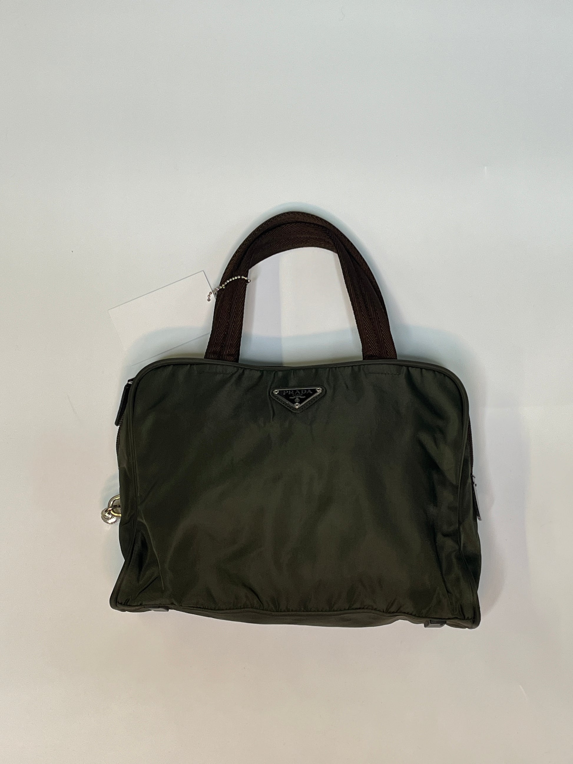 Beautiful olive green handbag from Prada with brown handles. Really cool details such as the lock on the side. Its a rather small bag but the most important things fit. Very nice designer bag but shows signs of use! See pictures.