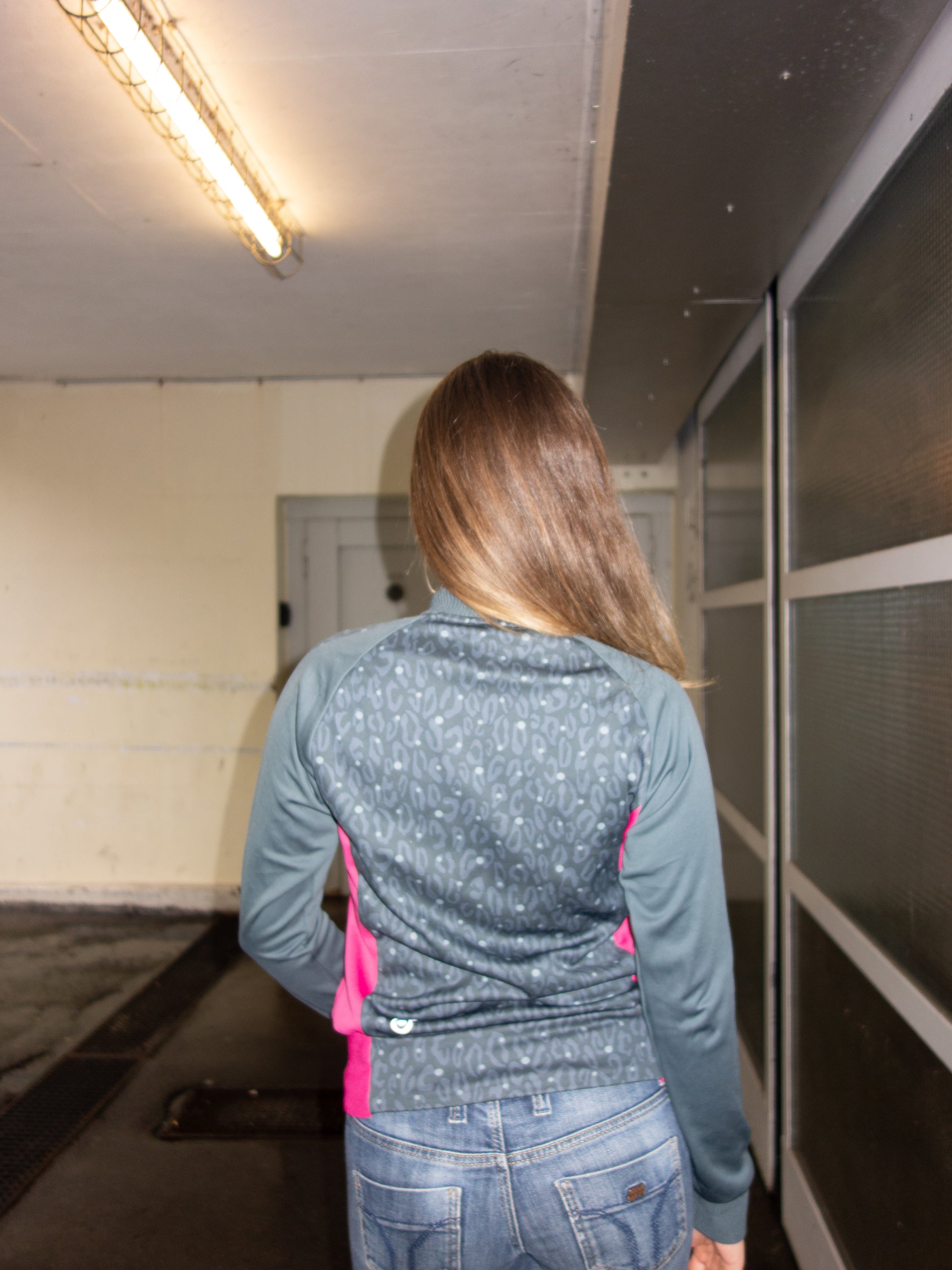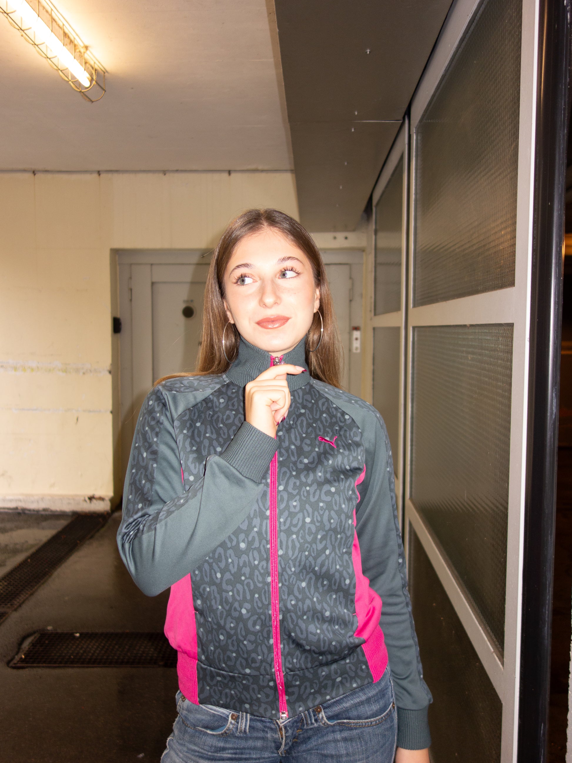 Cutest grey Puma Zipper with pink details! Has a cheetah pattern in the front and back which makes it so unique! Amazing fit and good quality! Cute zipper which has a cropped fit. Has the coolest silver puma charm.