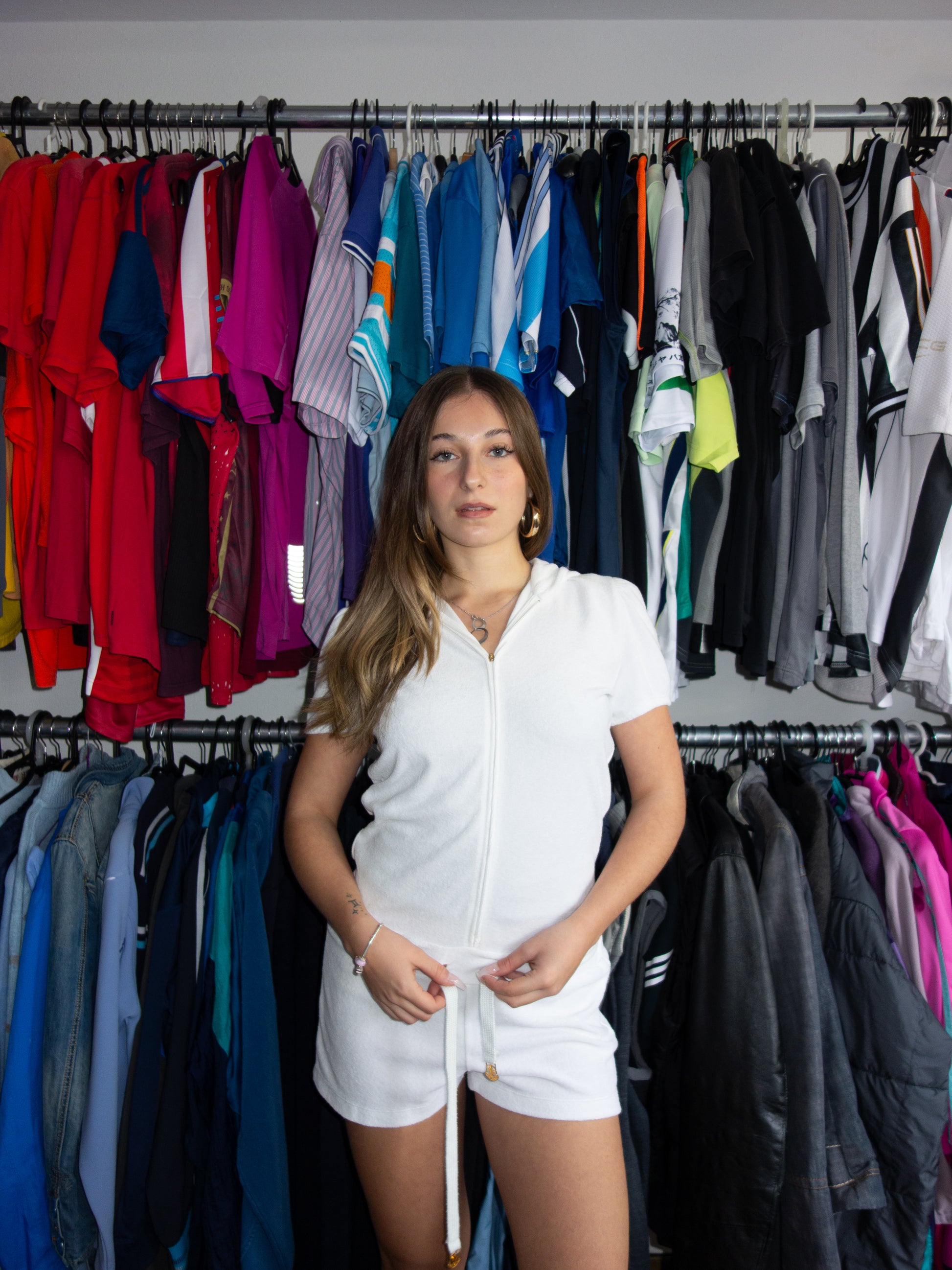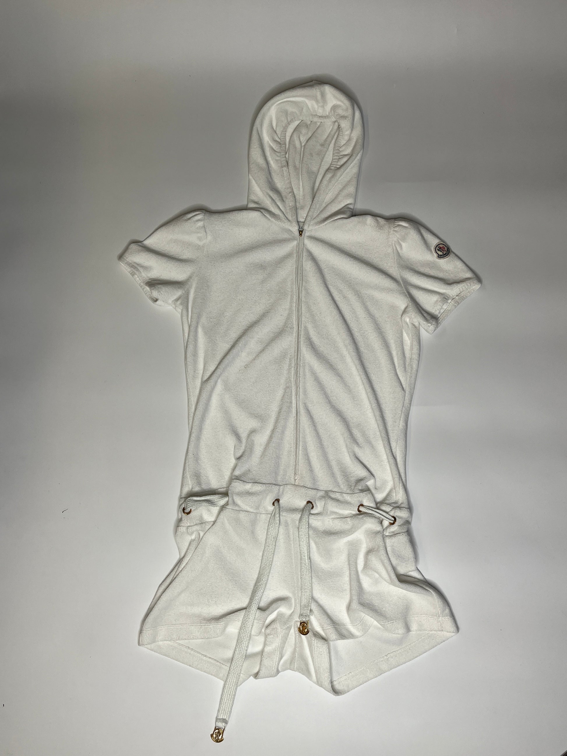 Amazing Moncler romper! White romper with comfy material. Beautiful design & details. You can tie it around the waist for the perfect fit. Thick, high quality material.