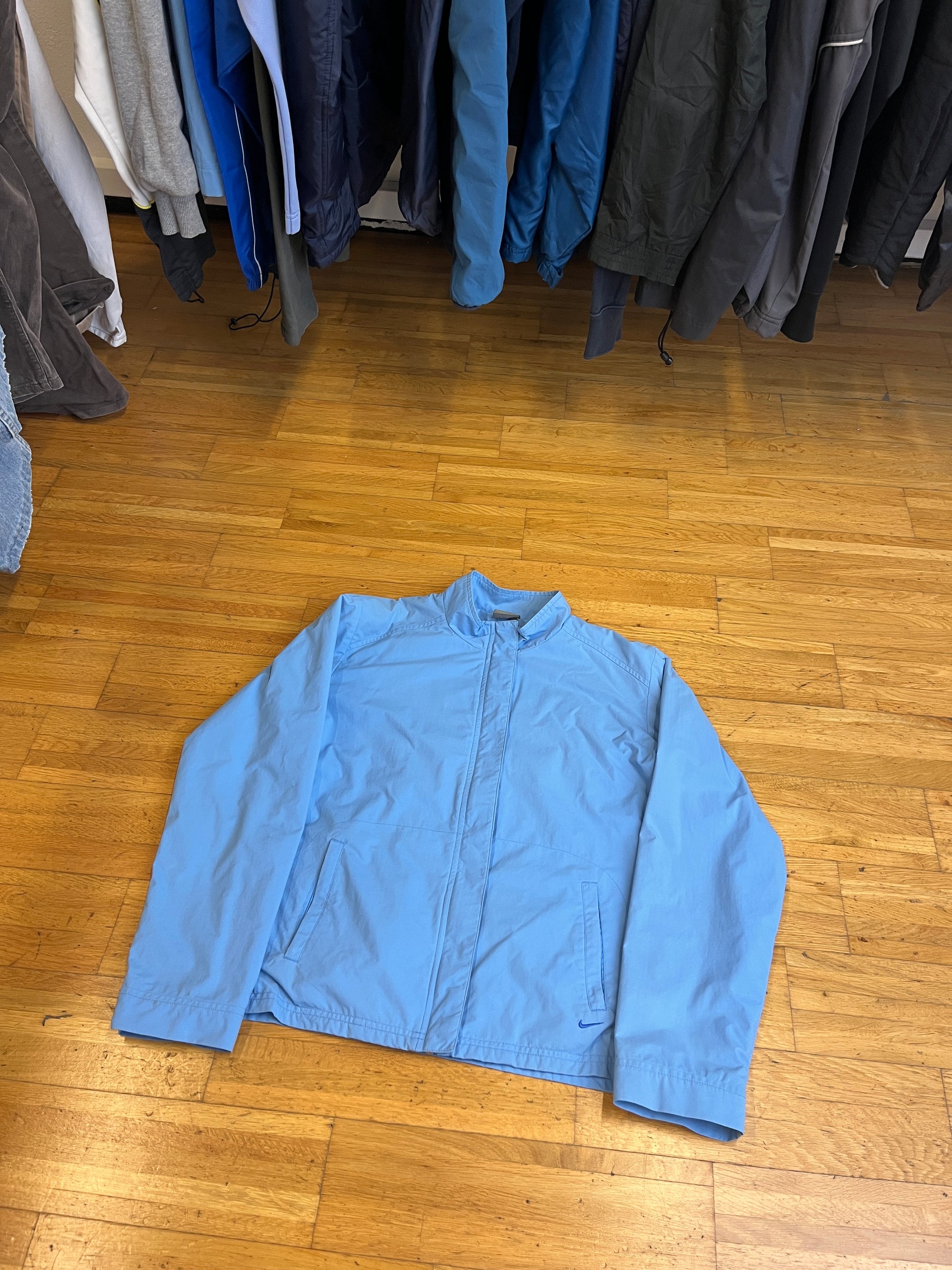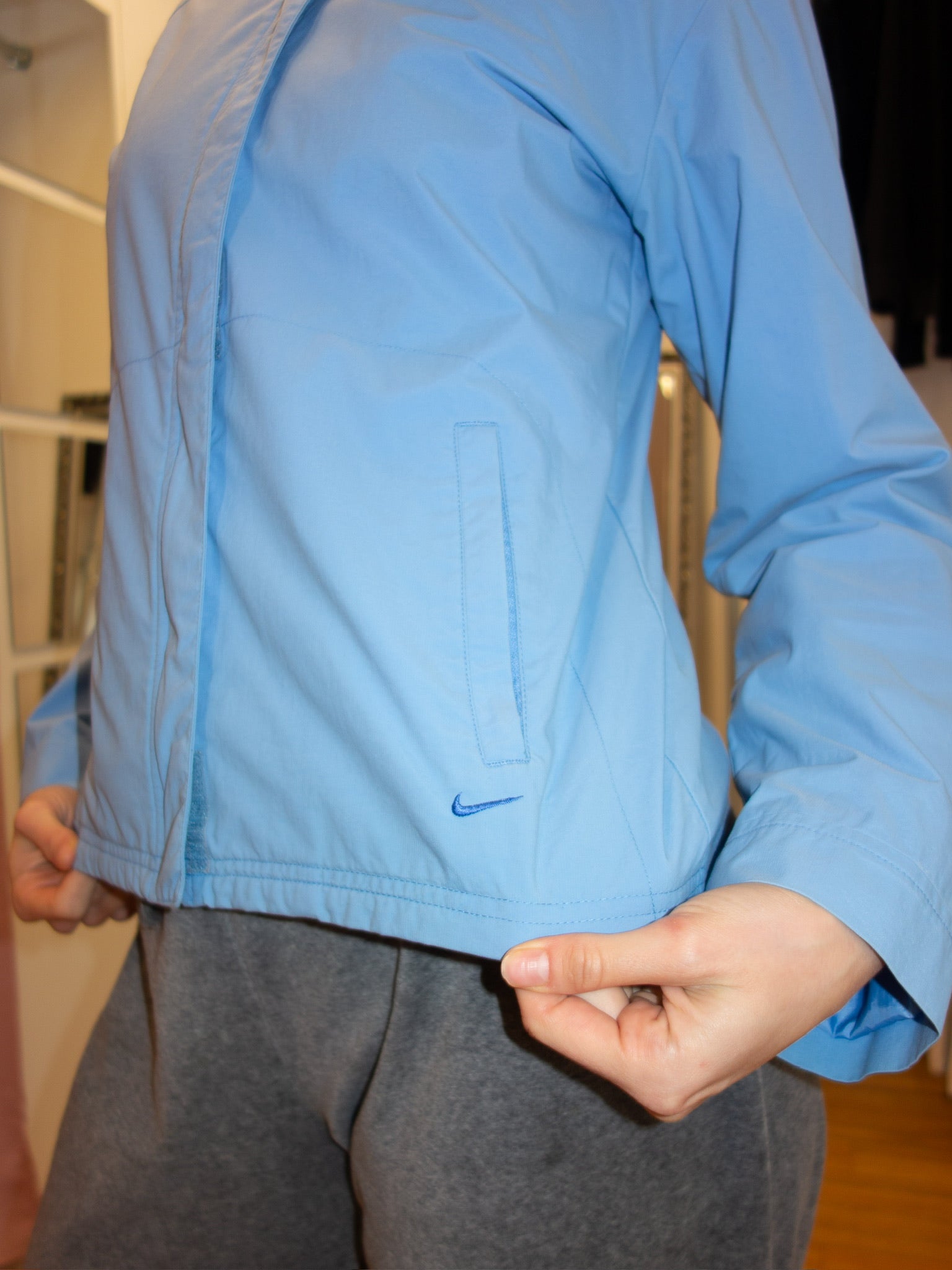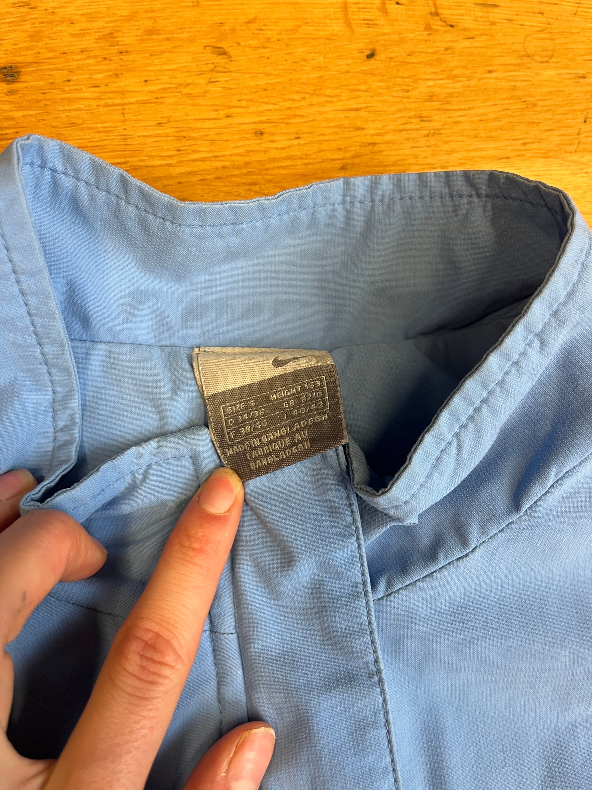Very nice babyblue Nike Zipper made in the 2000s. Embroidered Swoosh logo at the bottom. Track material.