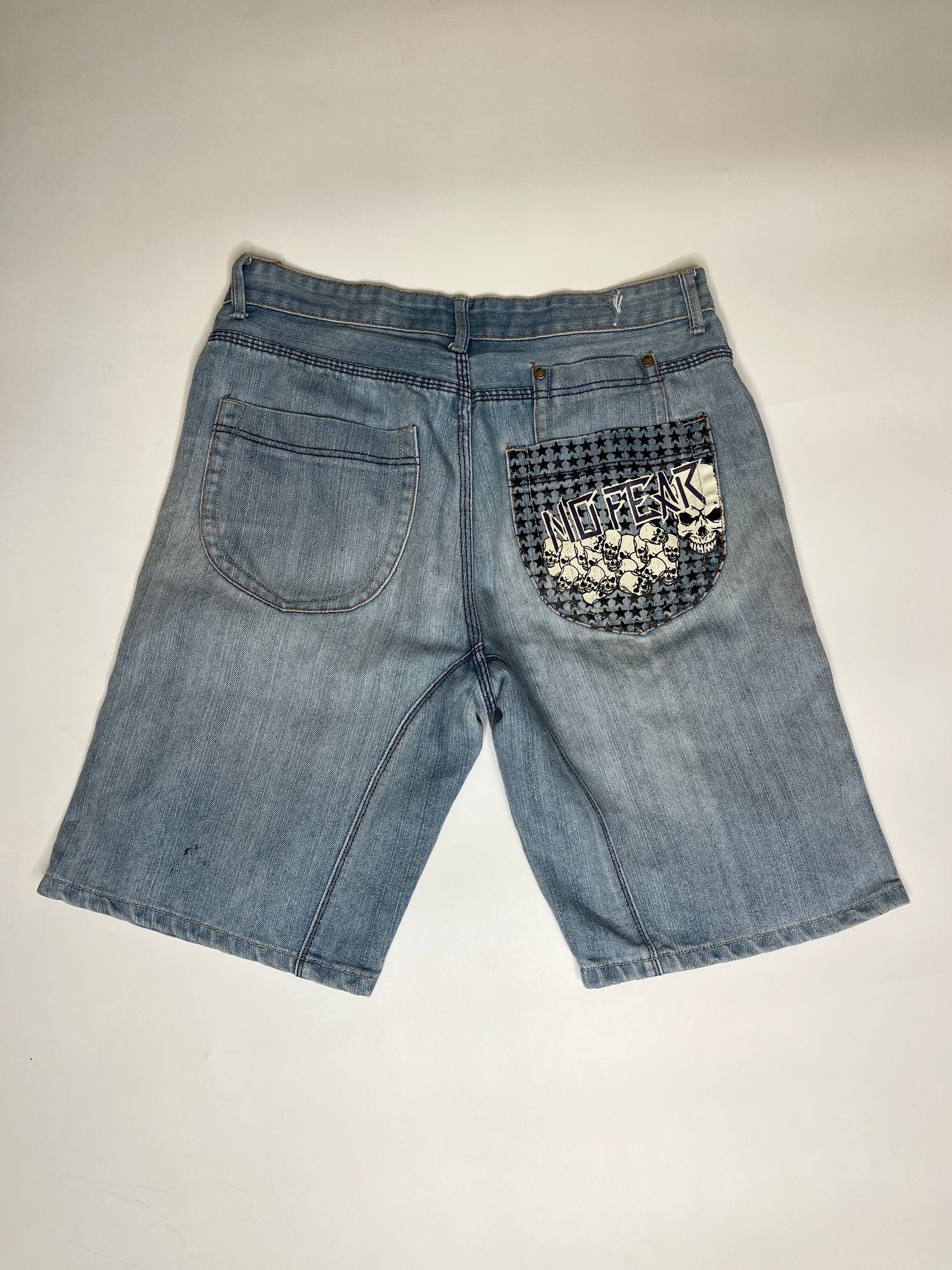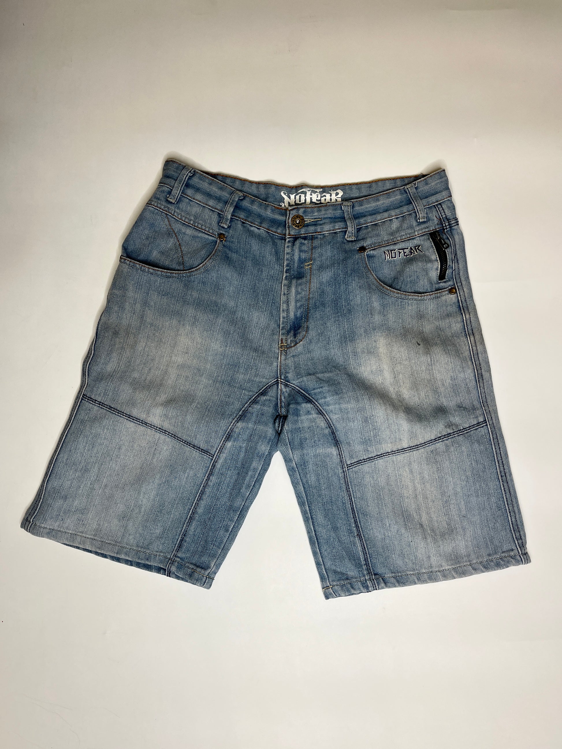 Amazing No Fear Jorts which fit rather baggy. Beautiful denim colour with washed out look. Amazing fit and perfect everyday jorts. Really comfortable and great quality! Unique piece.