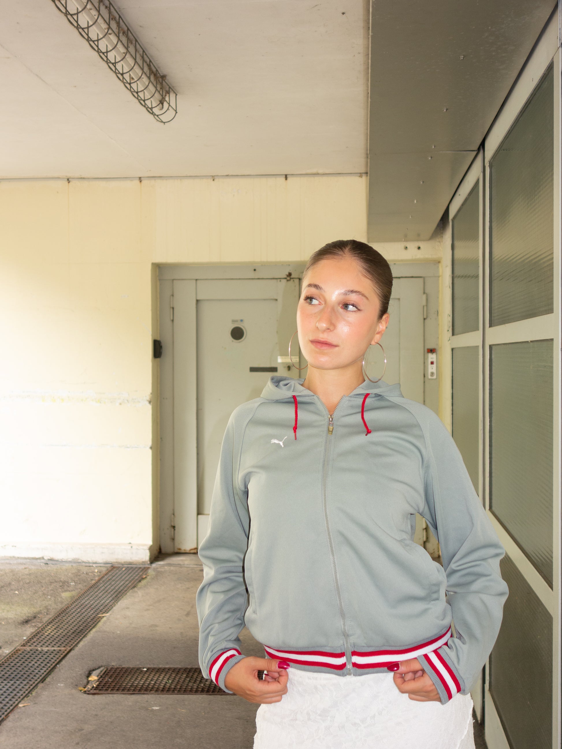 Super cute hooded zipper from the brand puma. Embroidered logo in the front & the best part are the striped wrists & waist. Very flattering fit.